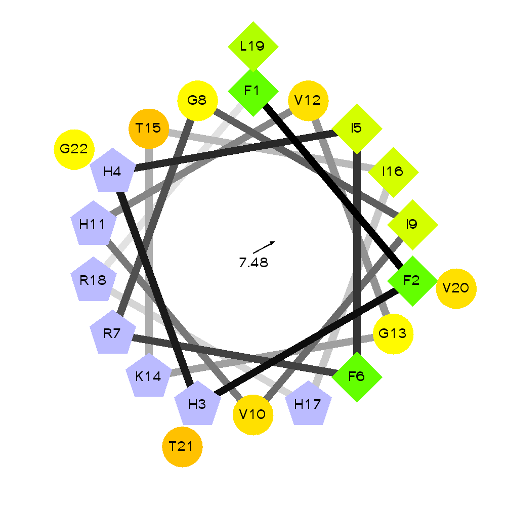 By amino acid: Basic: 7 Acidic: 0 Hydrophobic: 13 Polar: 2 Electrostatic Dipolar Moment (e nm): 3.51