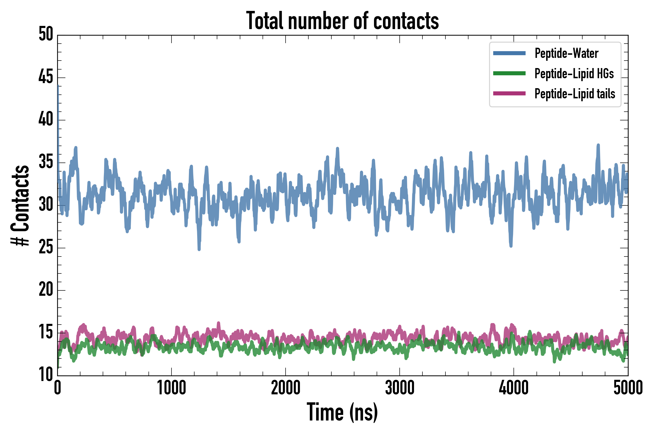 Number of contacts between each residue of the peptide backbone and the different lipid types, averaged over the last microsecond and using a cut-off of 0.6 nm.