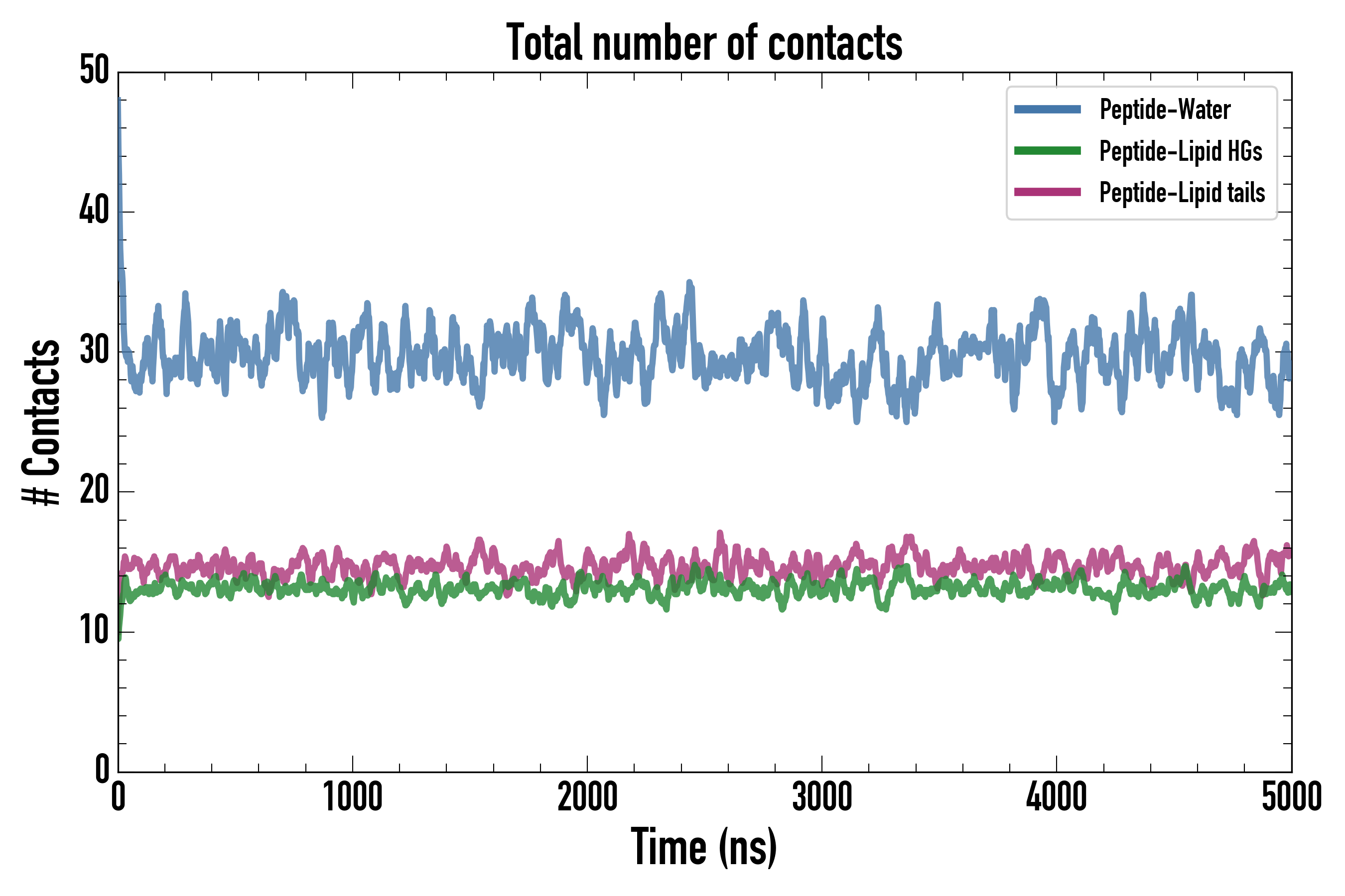 Number of contacts between each residue of the peptide backbone and the different lipid types, averaged over the last microsecond and using a cut-off of 0.6 nm.