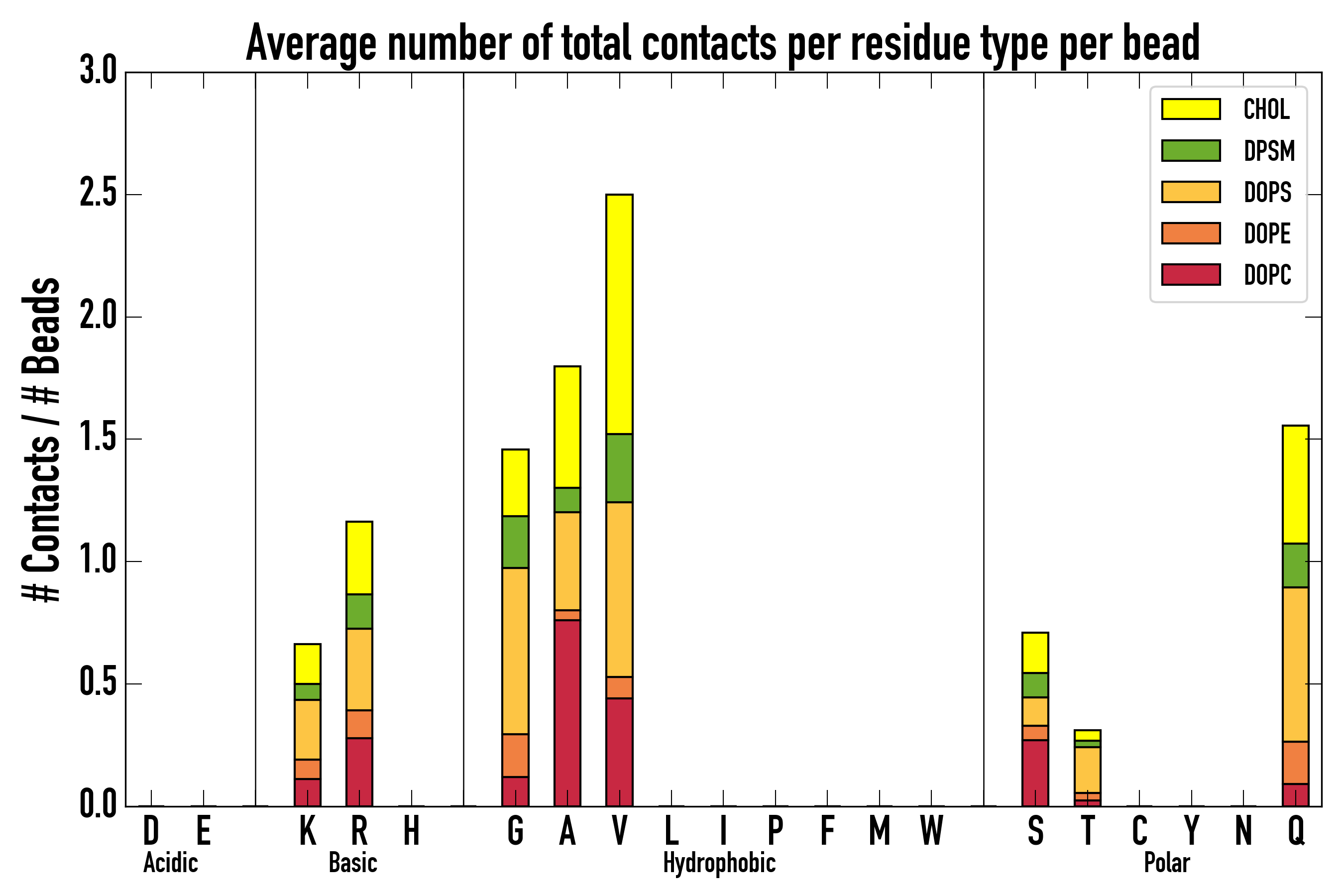 Number of contacts between each residue of the peptide backbone and the different lipid types, averaged over the last microsecond and using a cut-off of 0.6 nm.