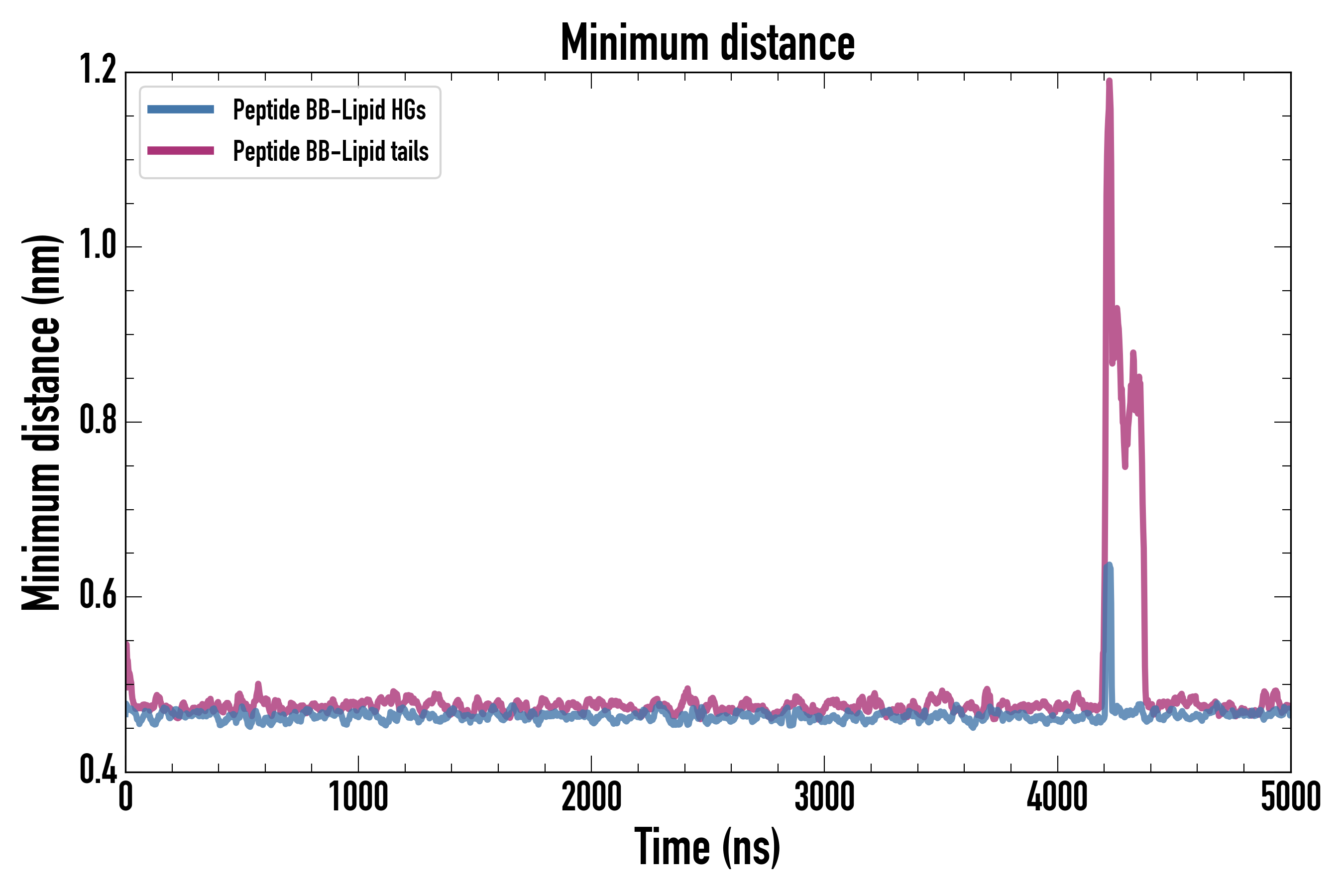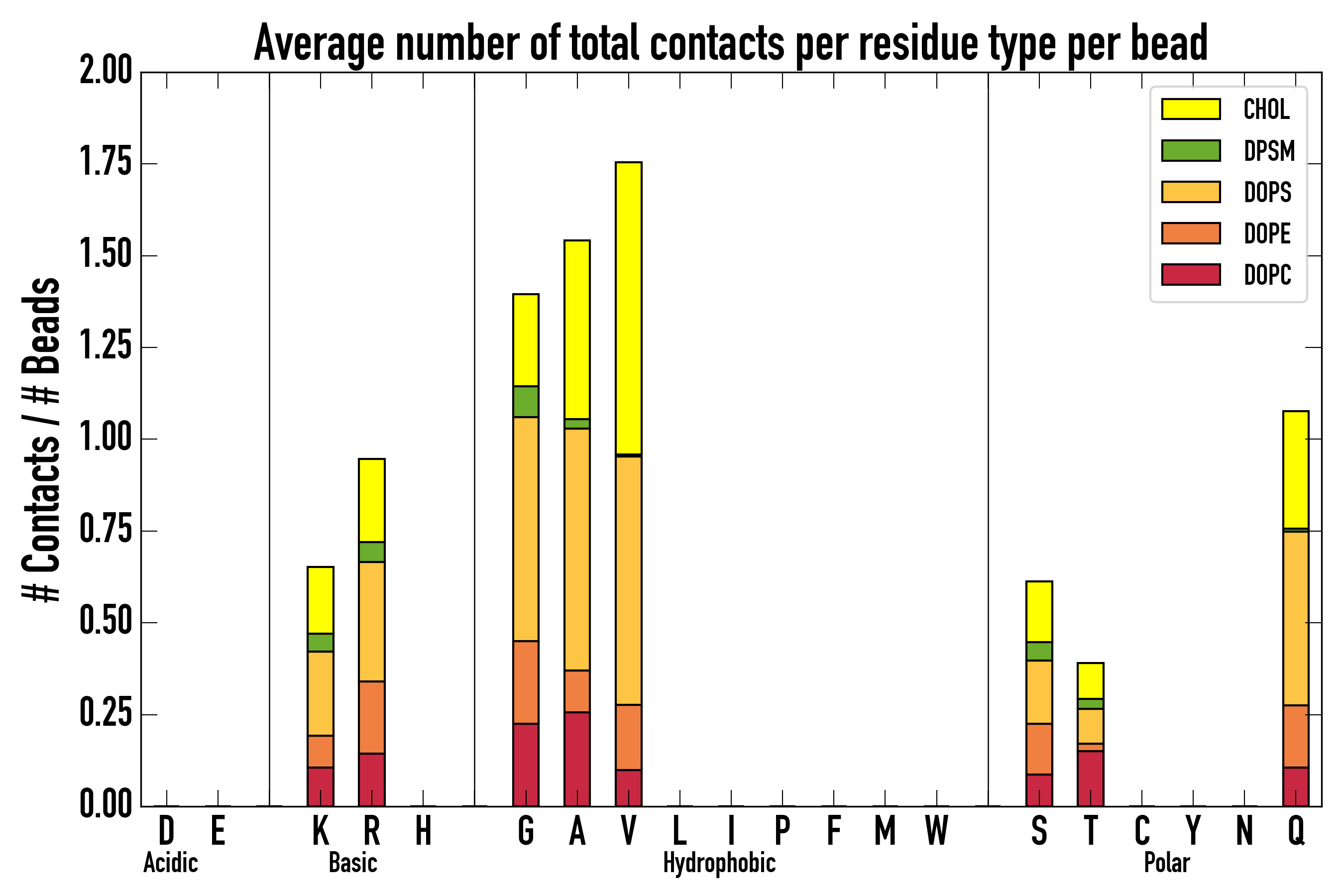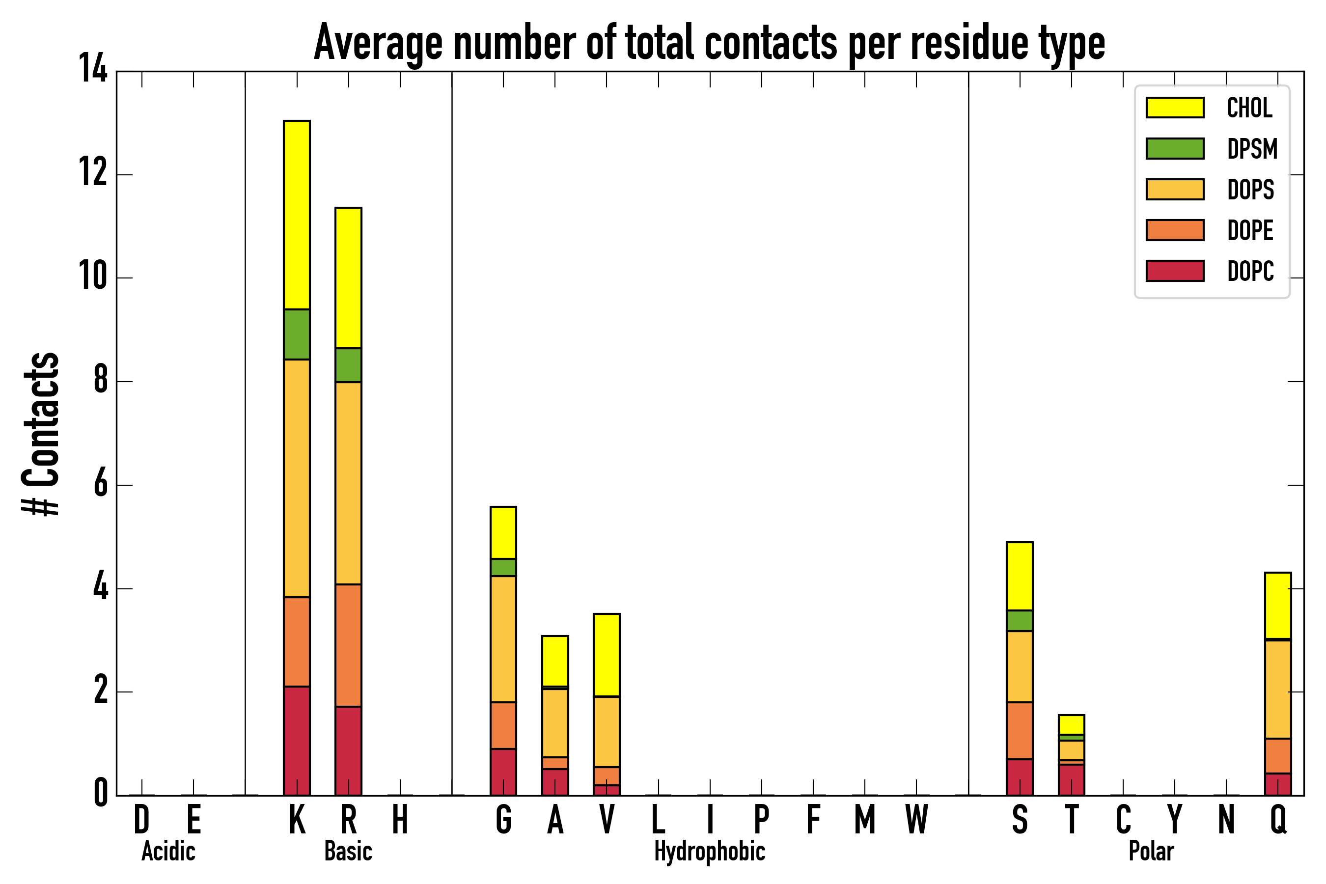 Number of contacts between each residue of the peptide backbone and the different lipid types, averaged over the last microsecond and using a cut-off of 0.6 nm.