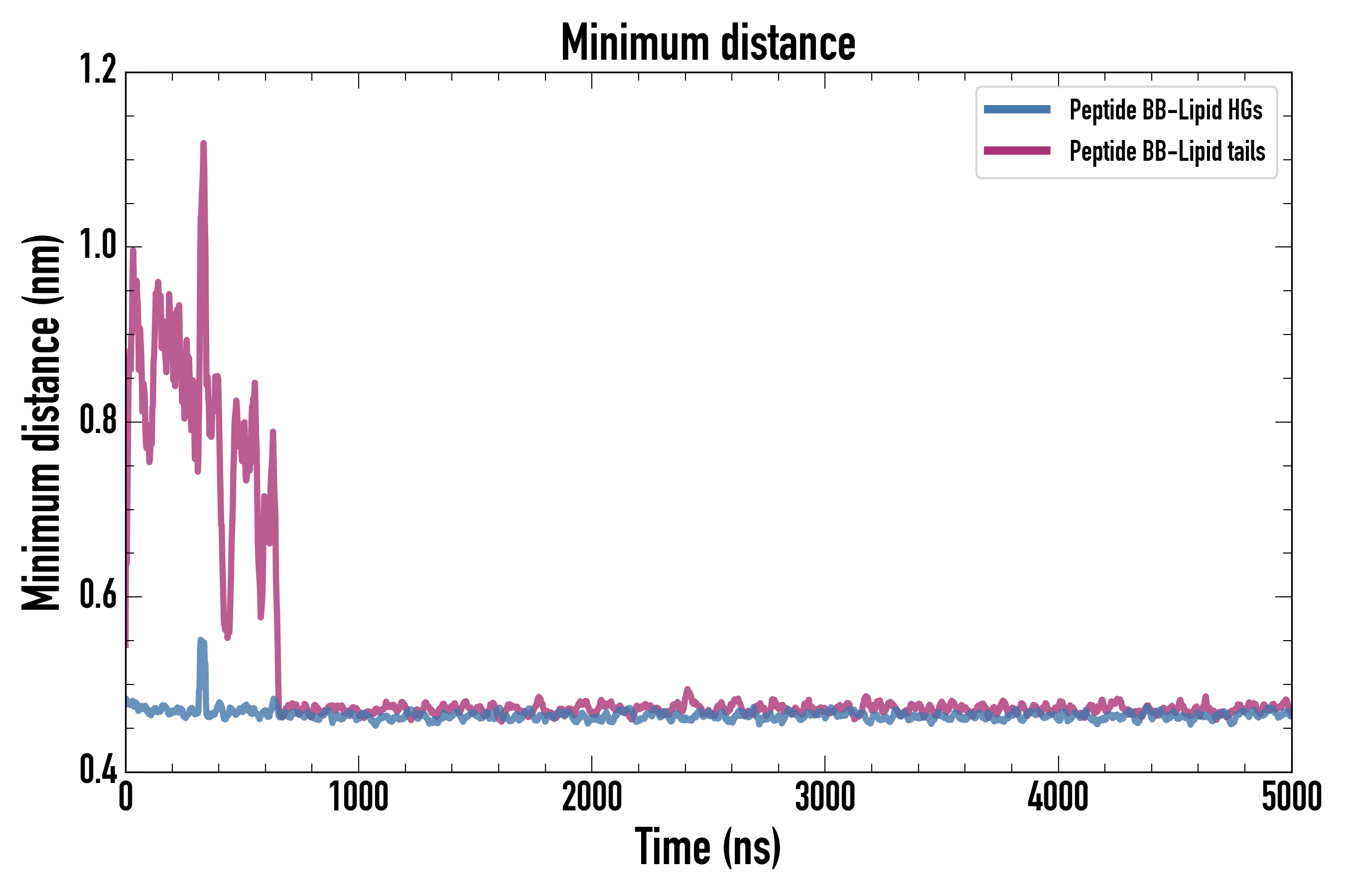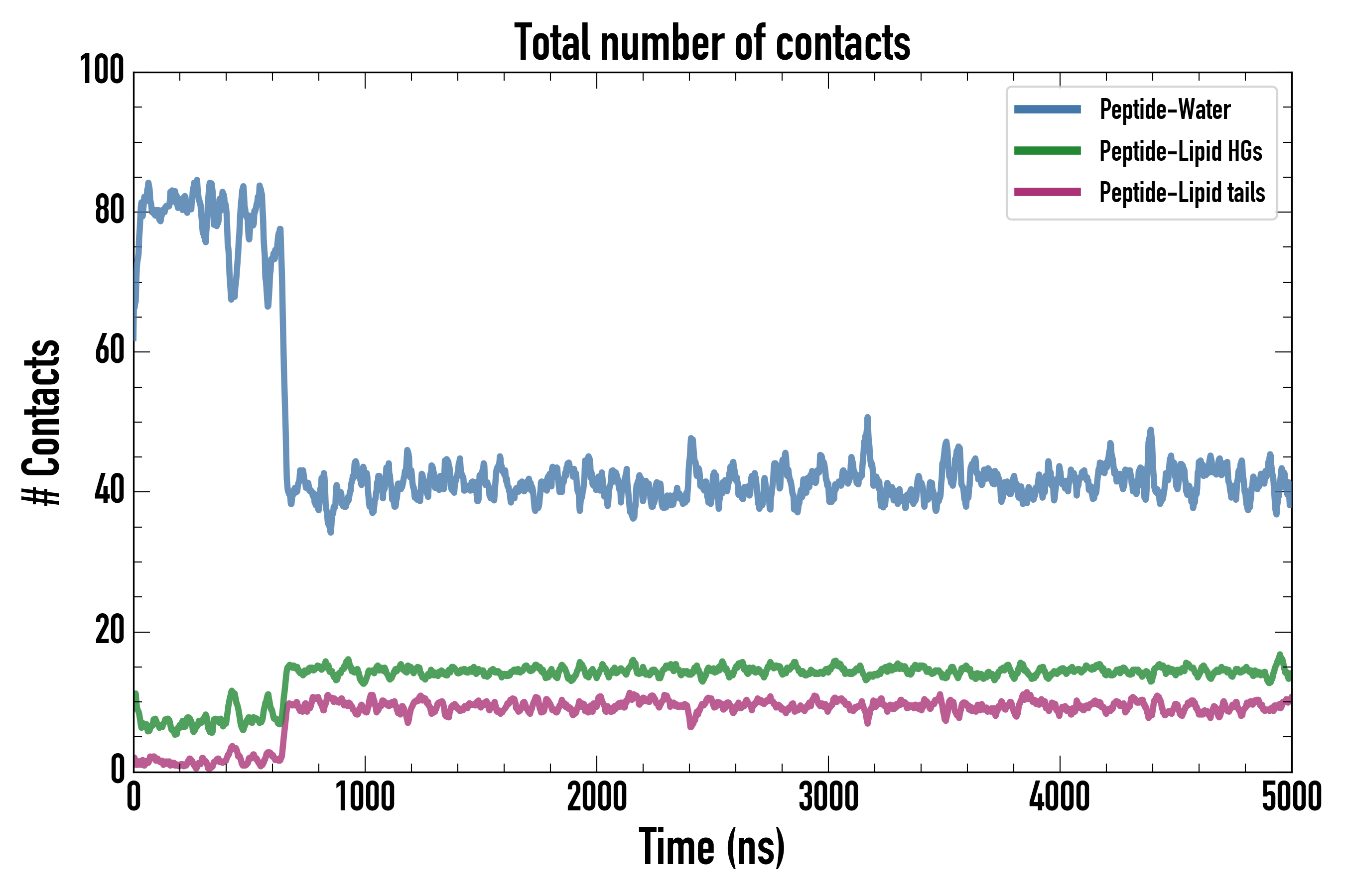Number of contacts between each residue of the peptide backbone and the different lipid types, averaged over the last microsecond and using a cut-off of 0.6 nm.