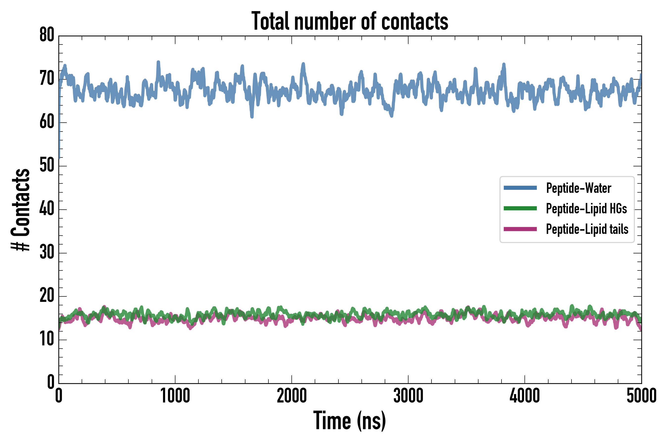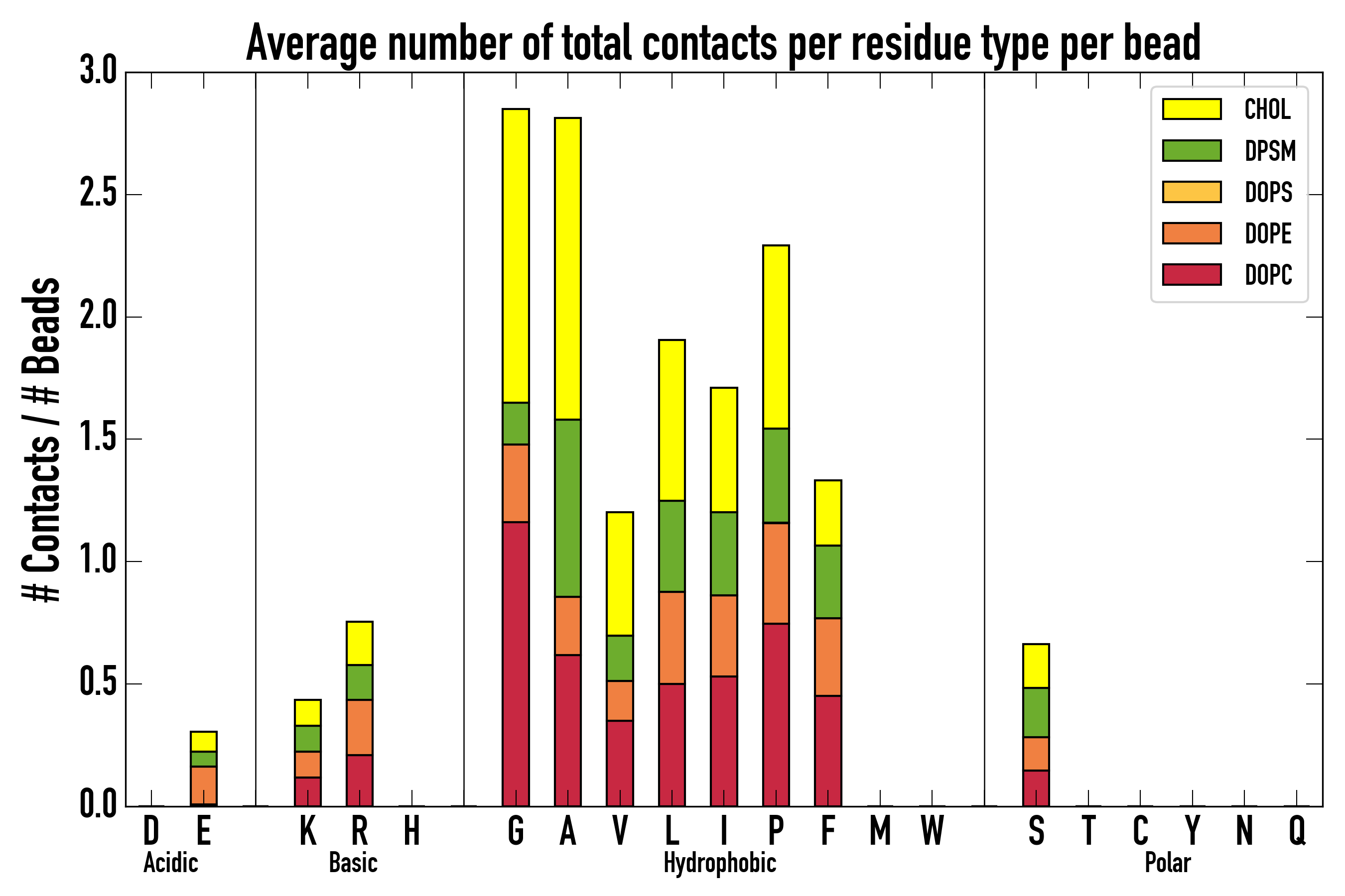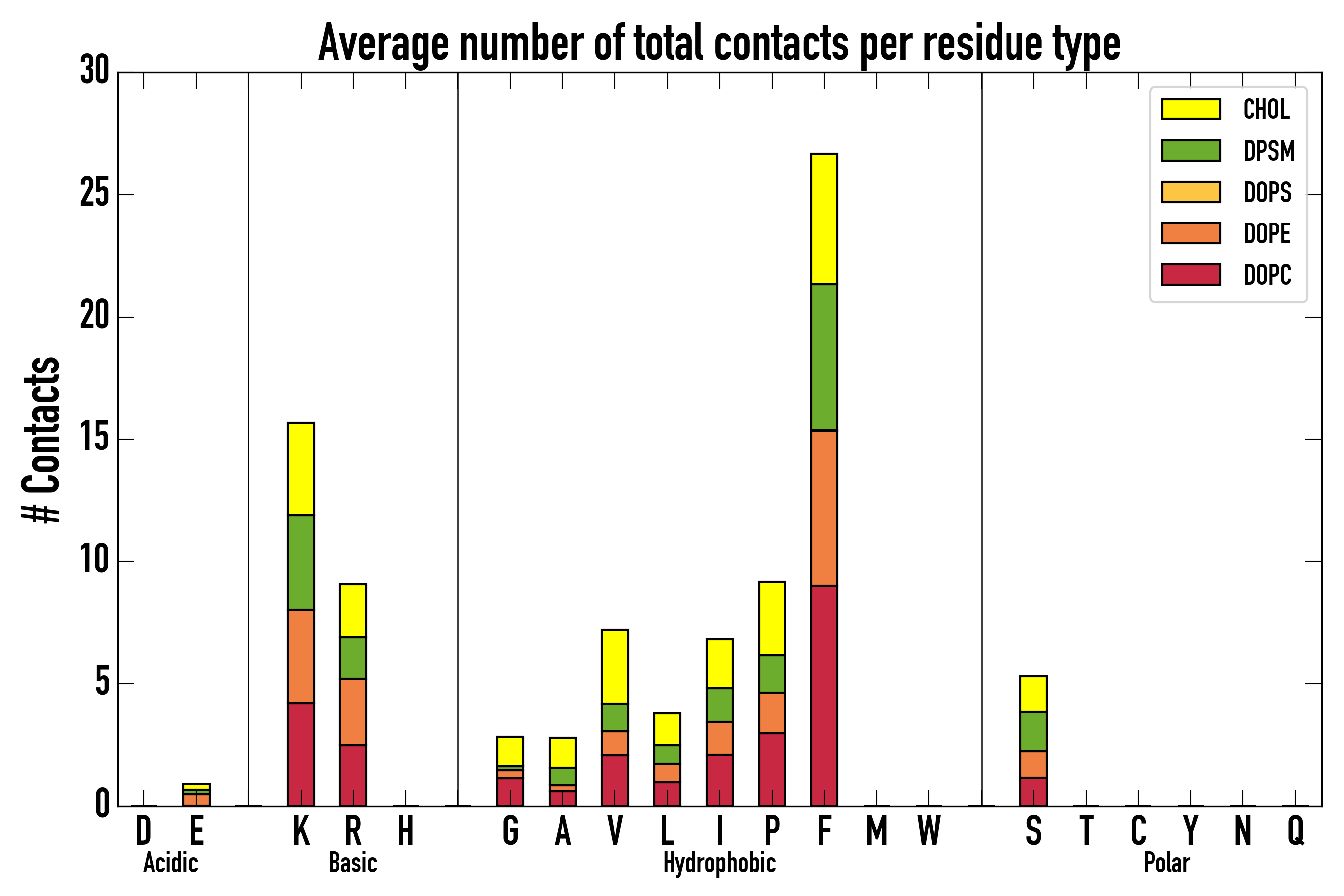 Number of contacts between each residue of the peptide backbone and the different lipid types, averaged over the last microsecond and using a cut-off of 0.6 nm.