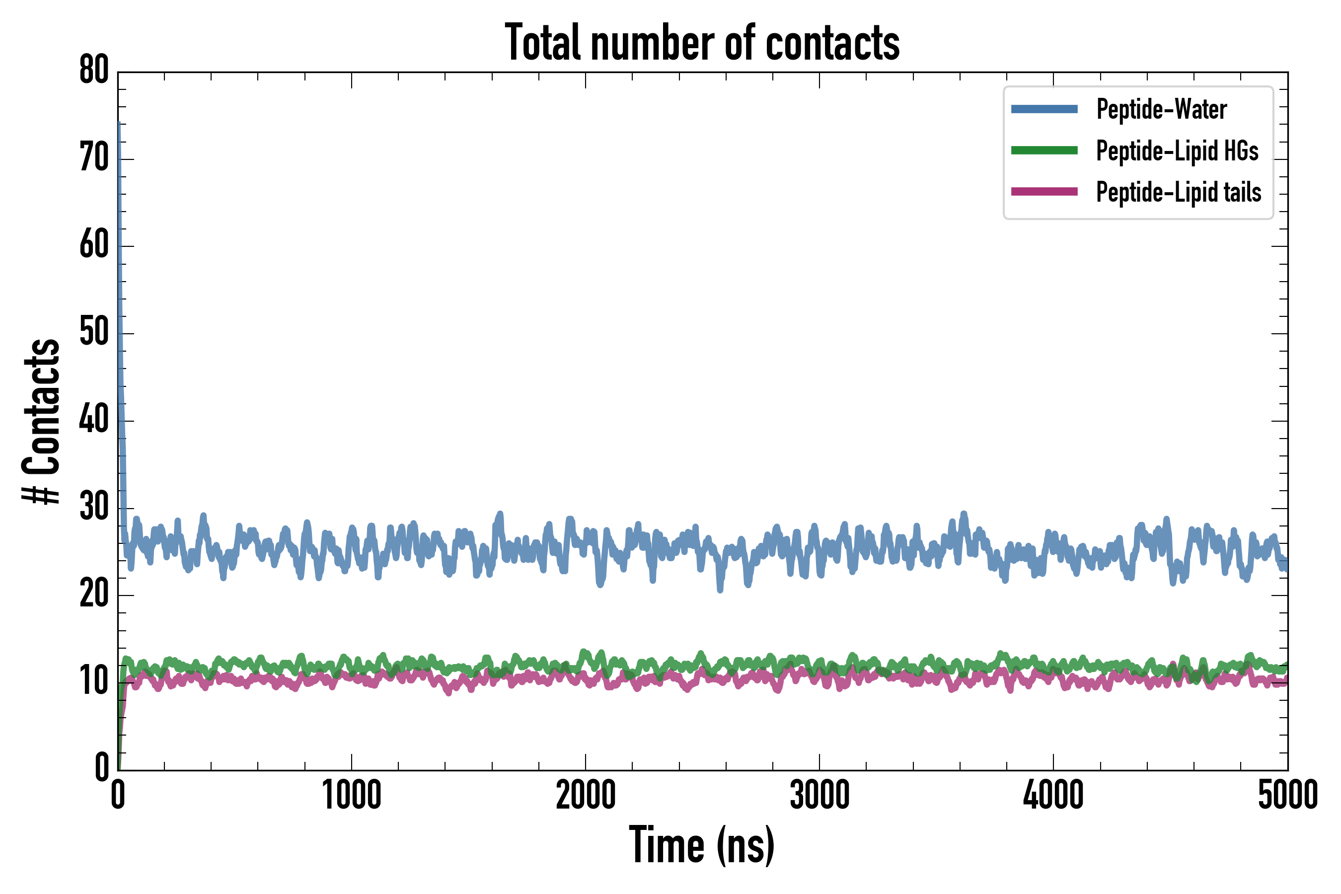 Number of contacts between each residue of the peptide backbone and the different lipid types, averaged over the last microsecond and using a cut-off of 0.6 nm.