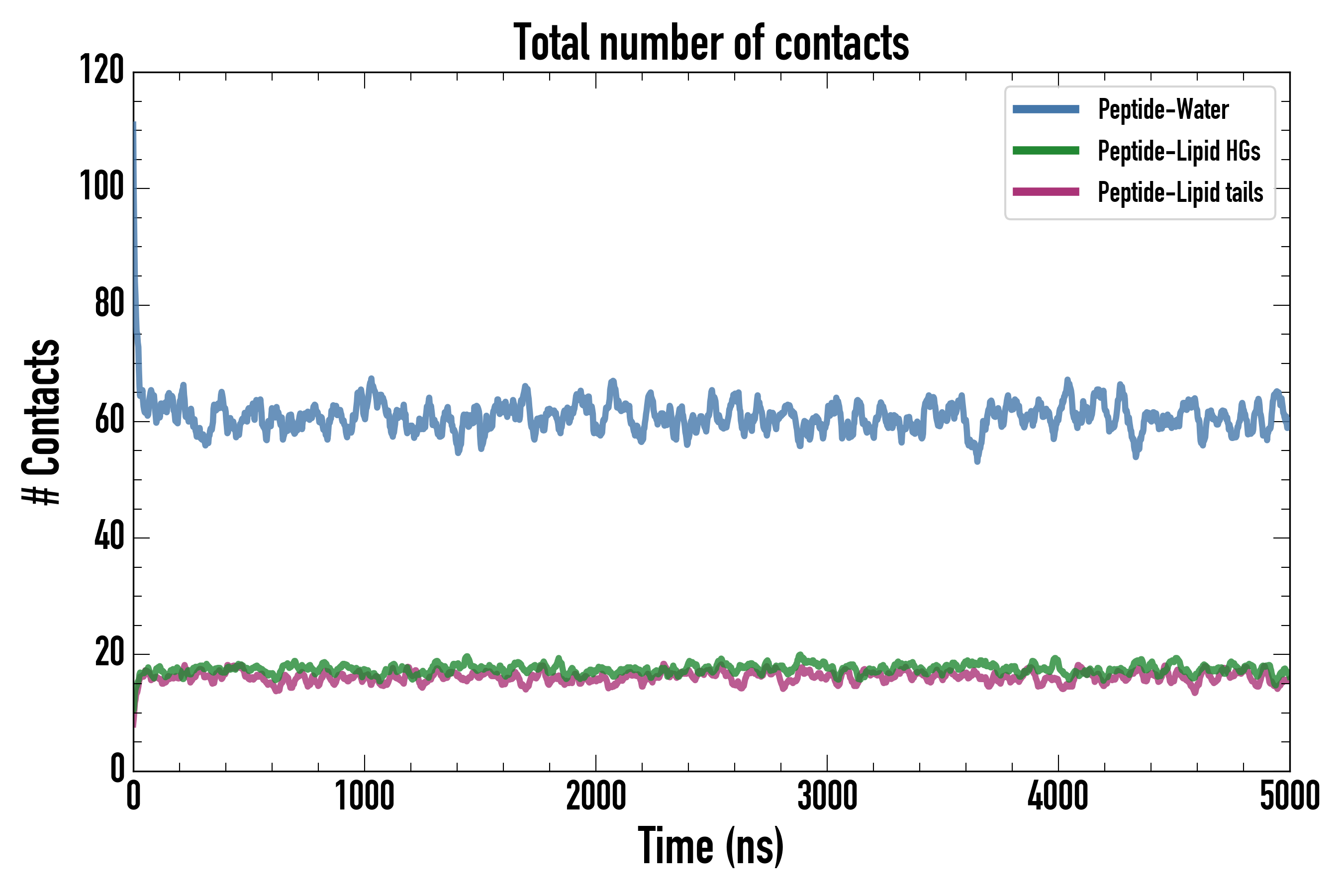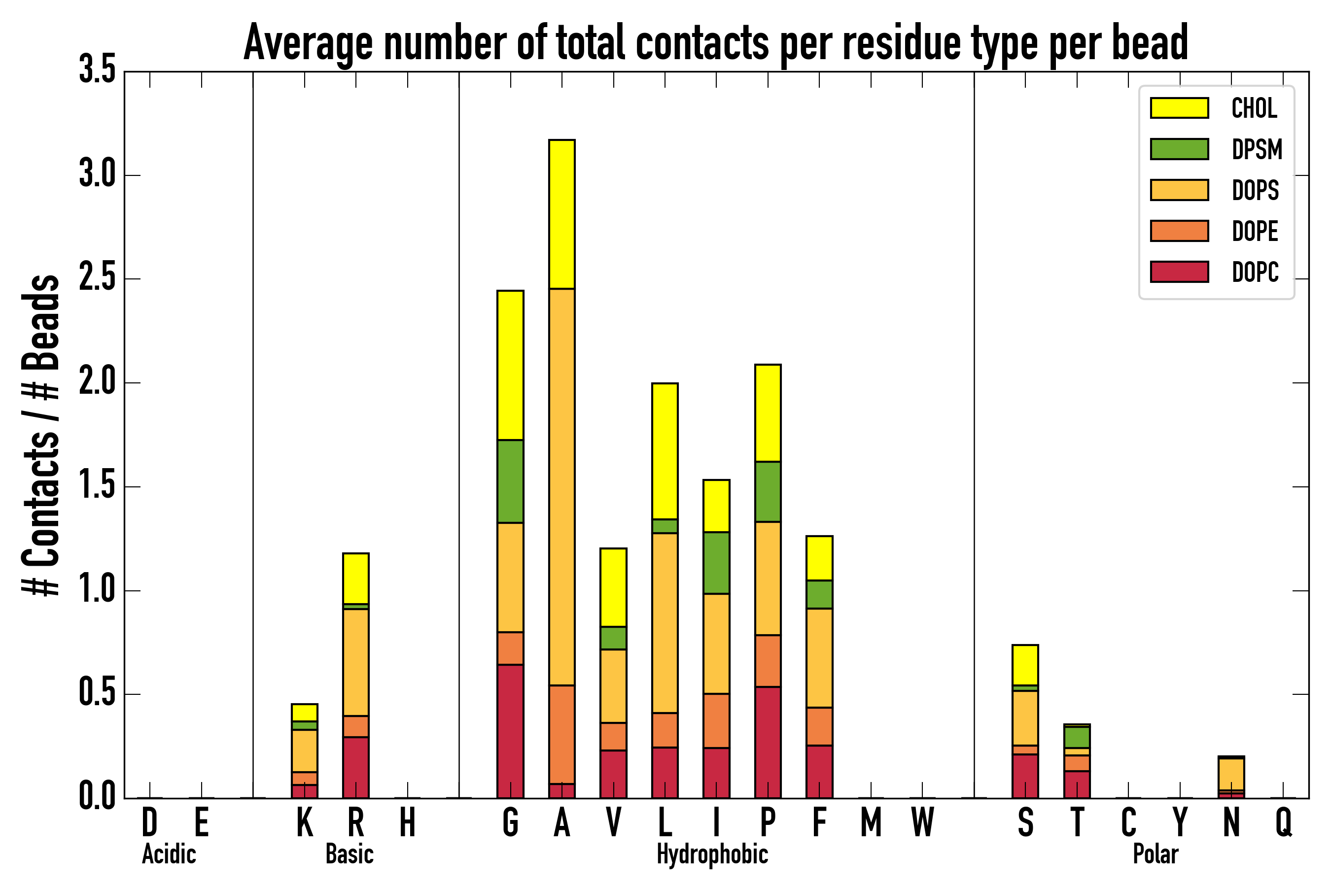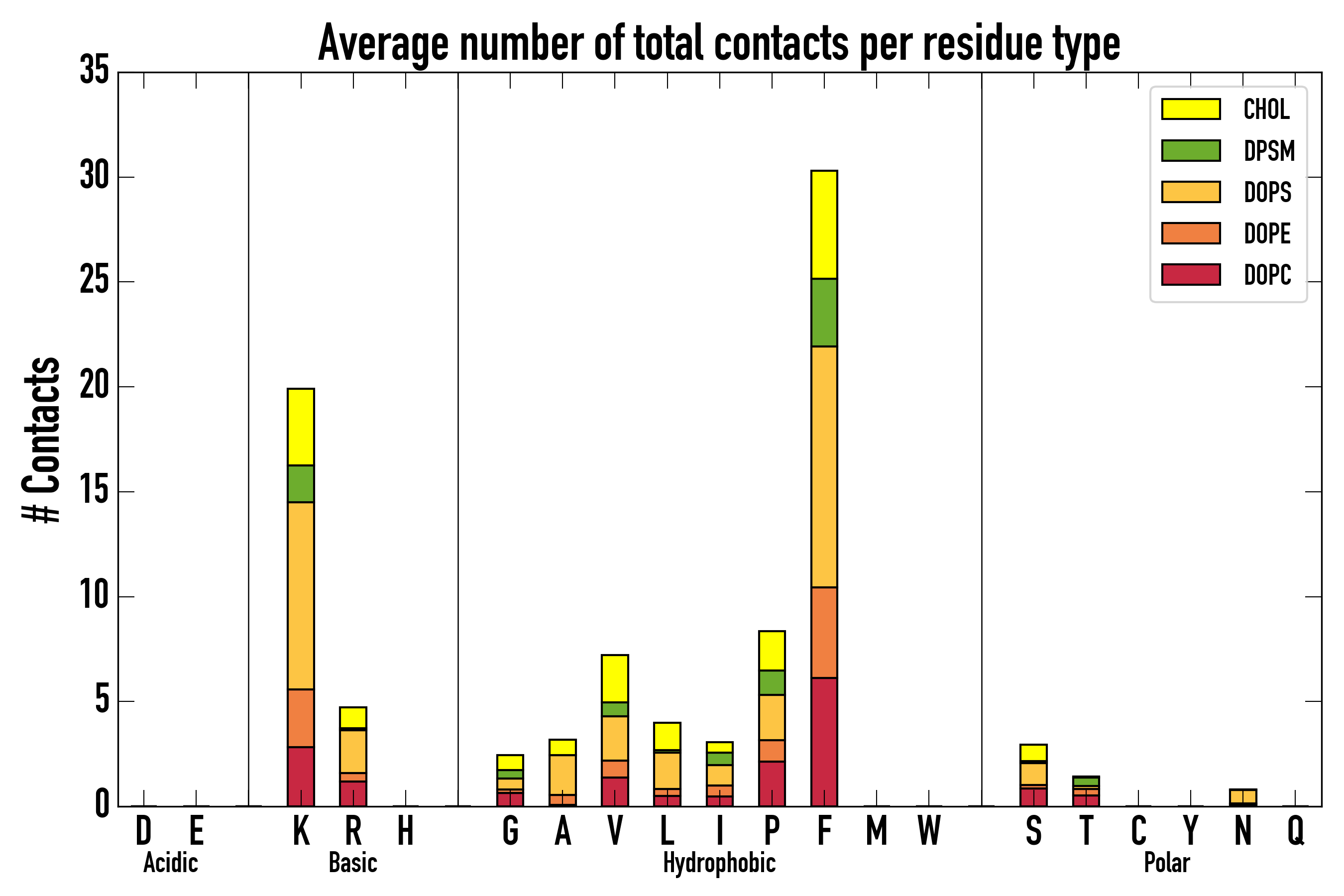 Number of contacts between each residue of the peptide backbone and the different lipid types, averaged over the last microsecond and using a cut-off of 0.6 nm.