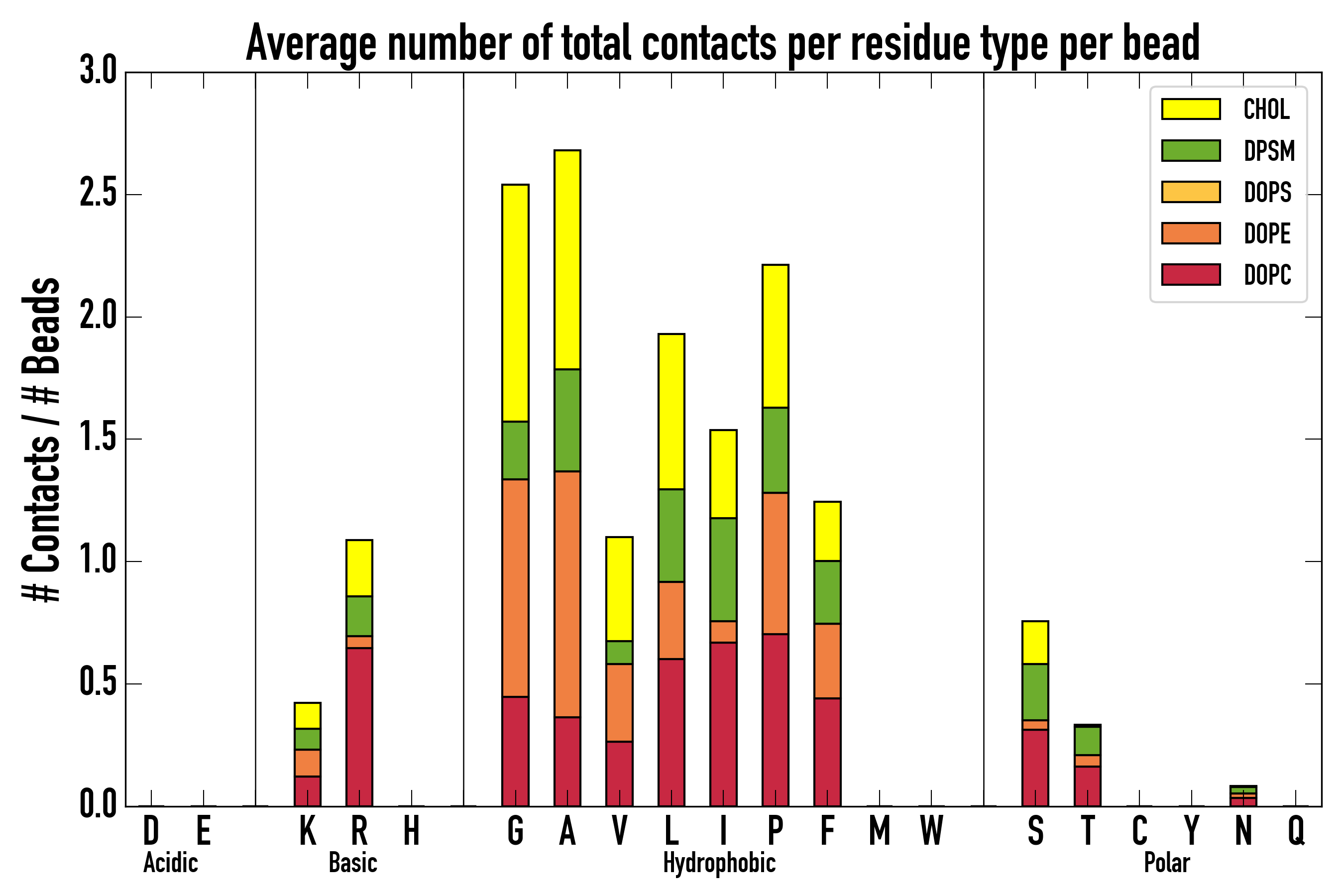 Number of contacts between each residue of the peptide backbone and the different lipid types, averaged over the last microsecond and using a cut-off of 0.6 nm.