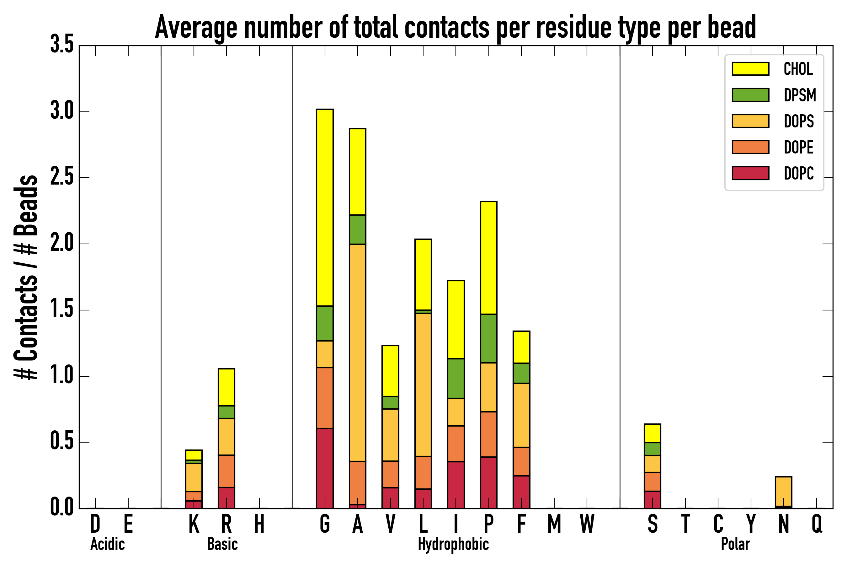 Number of contacts between each residue of the peptide backbone and the different lipid types, averaged over the last microsecond and using a cut-off of 0.6 nm.