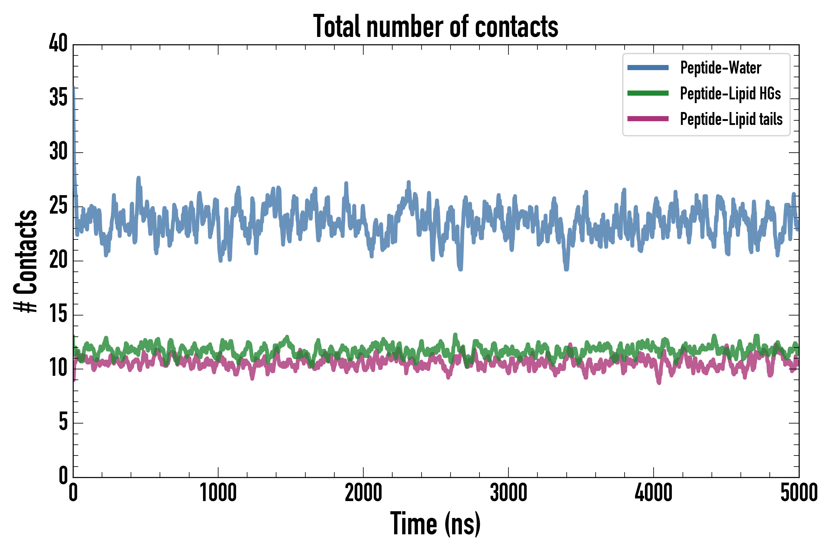 Number of contacts between each residue of the peptide backbone and the different lipid types, averaged over the last microsecond and using a cut-off of 0.6 nm.
