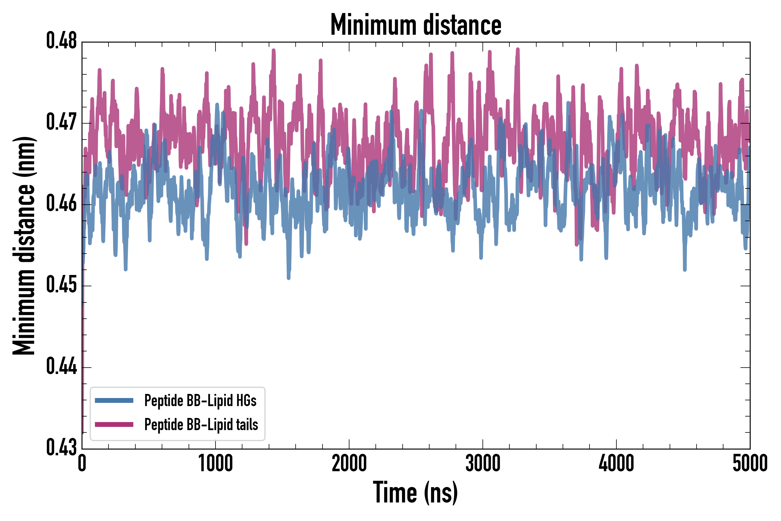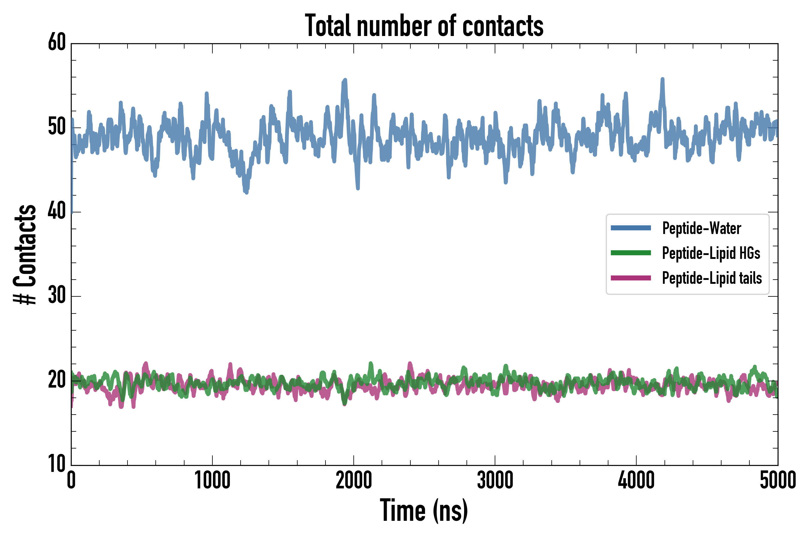 Number of contacts between each residue of the peptide backbone and the different lipid types, averaged over the last microsecond and using a cut-off of 0.6 nm.