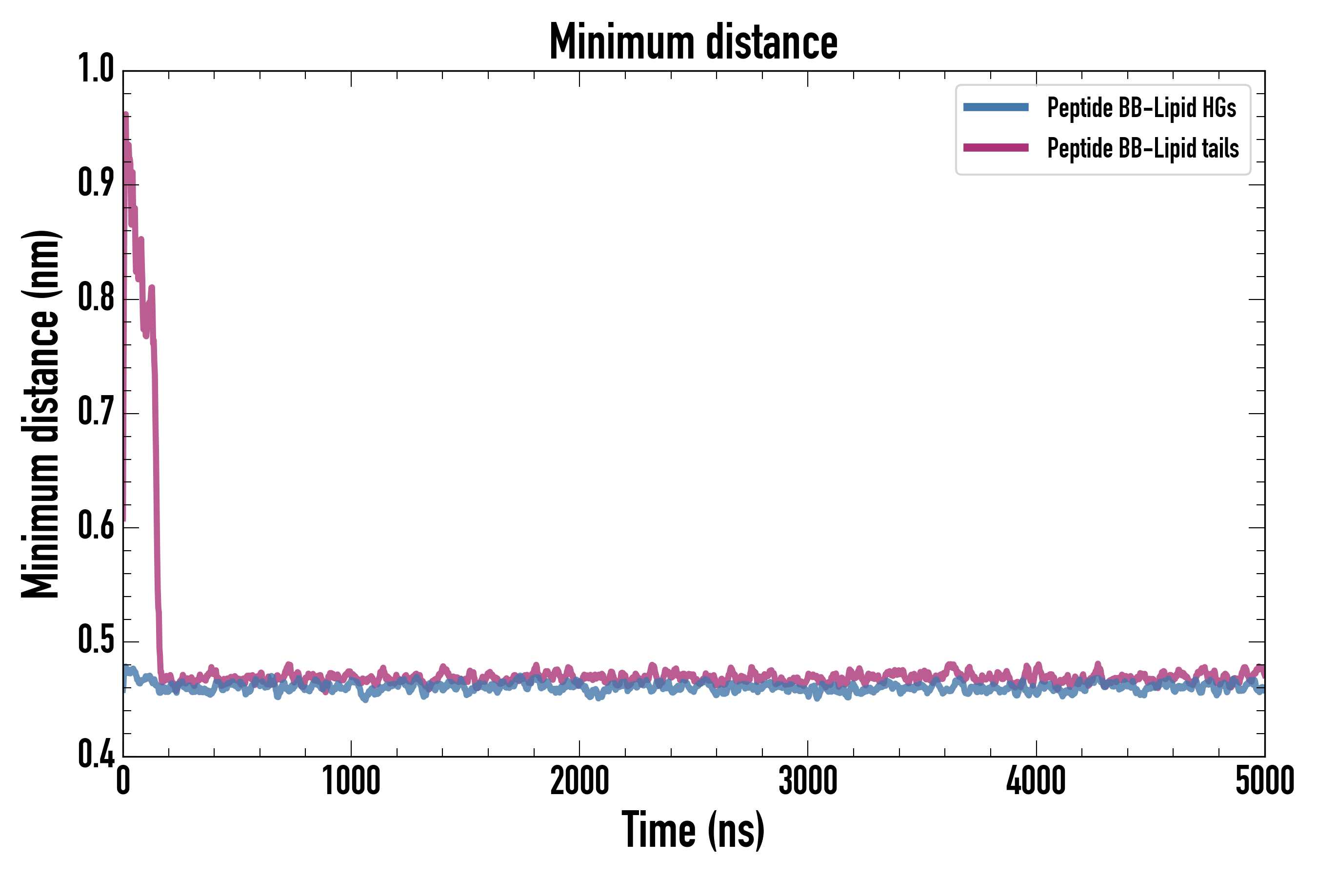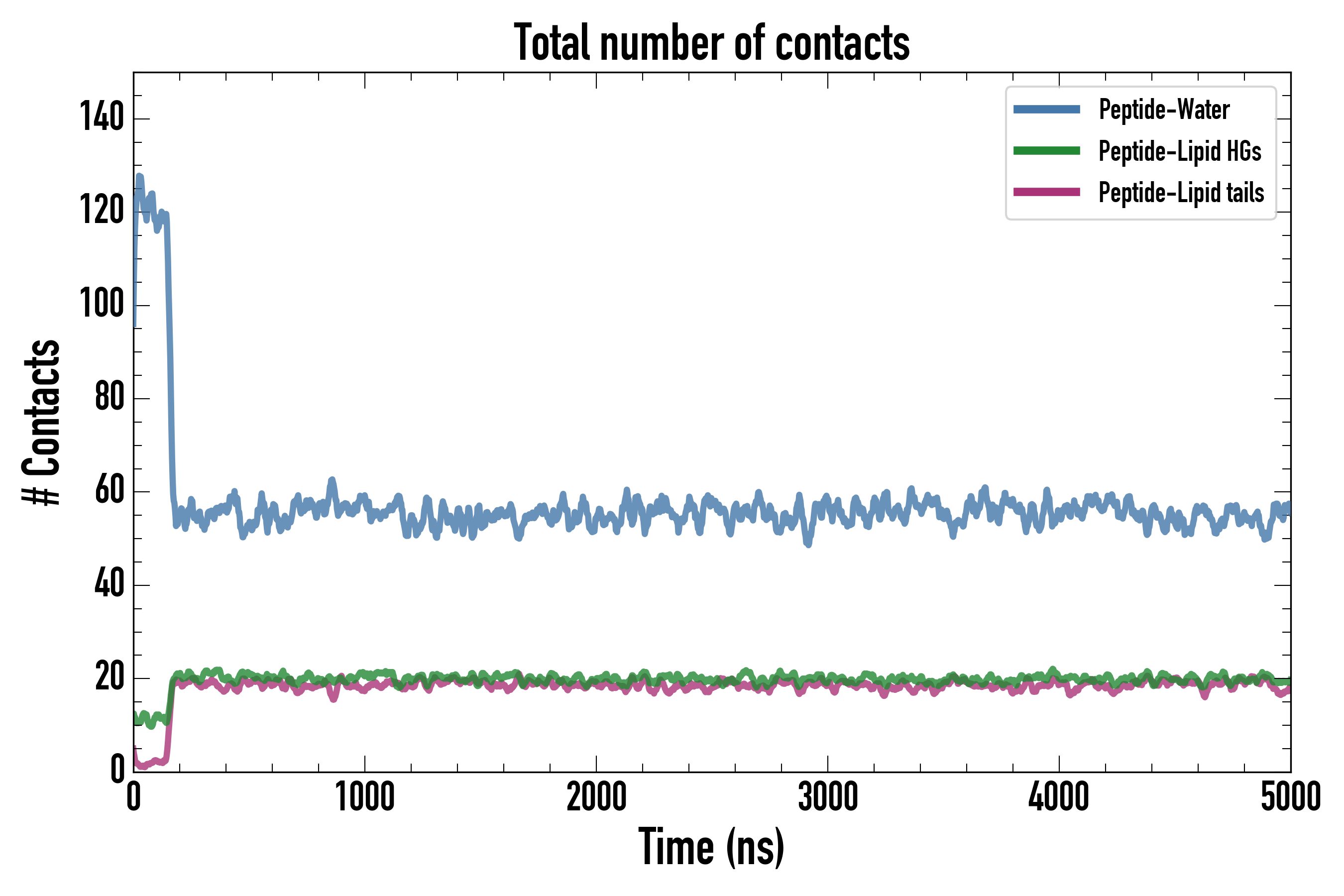 Number of contacts between each residue of the peptide backbone and the different lipid types, averaged over the last microsecond and using a cut-off of 0.6 nm.