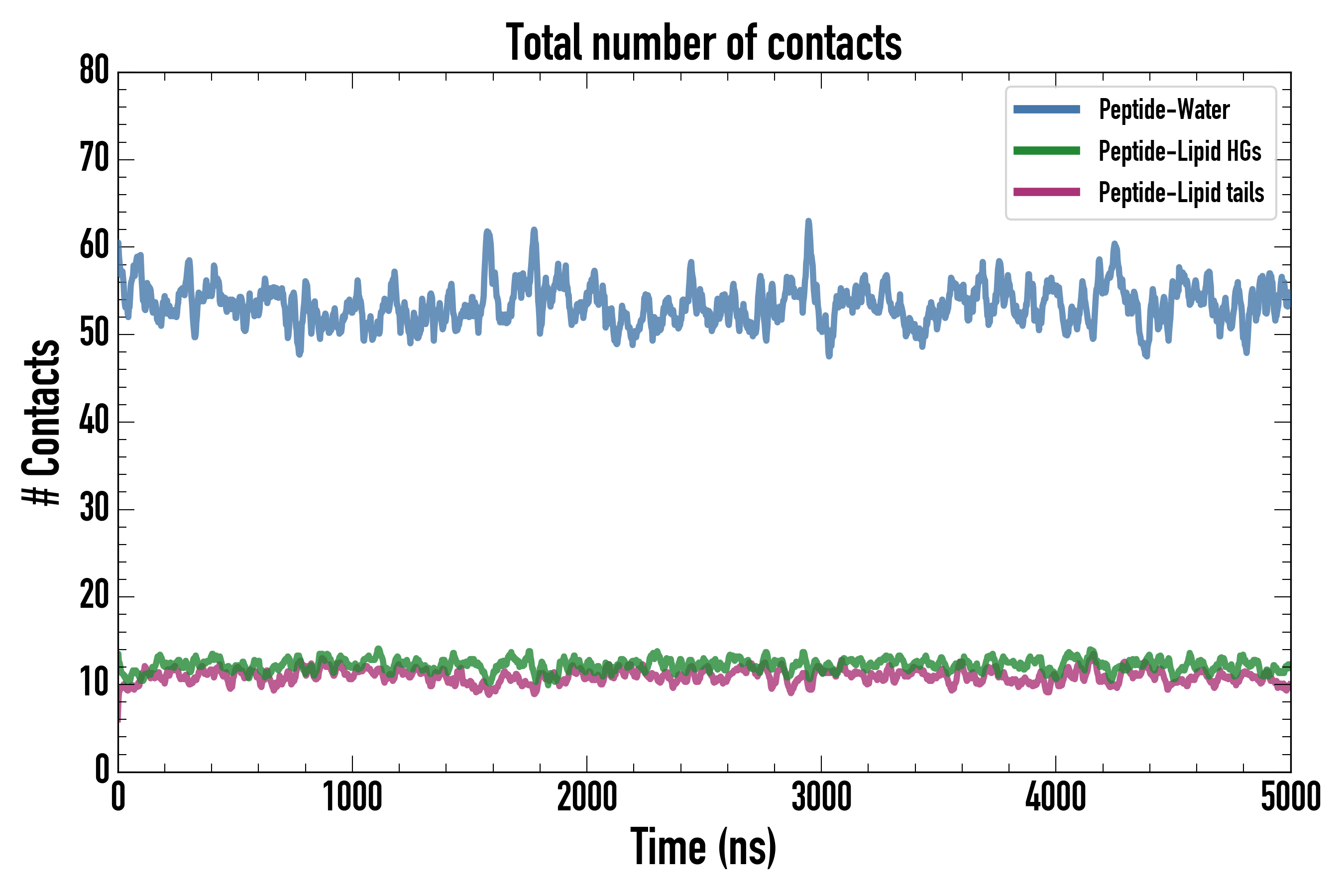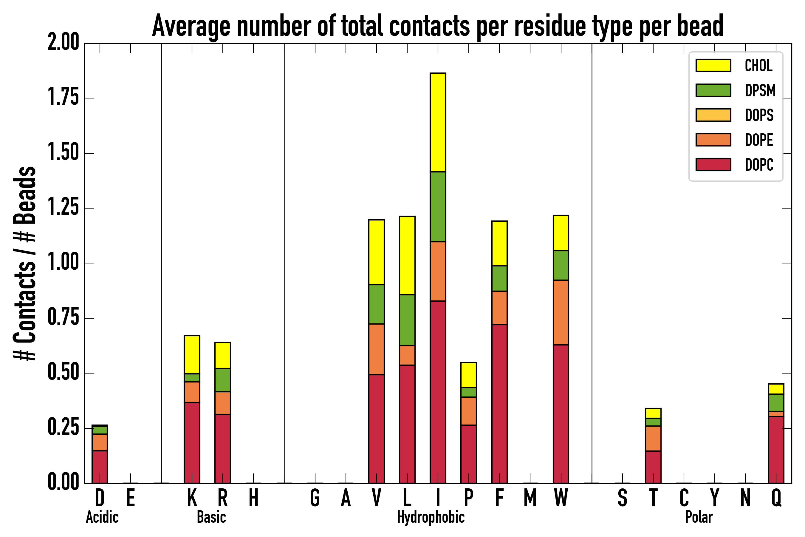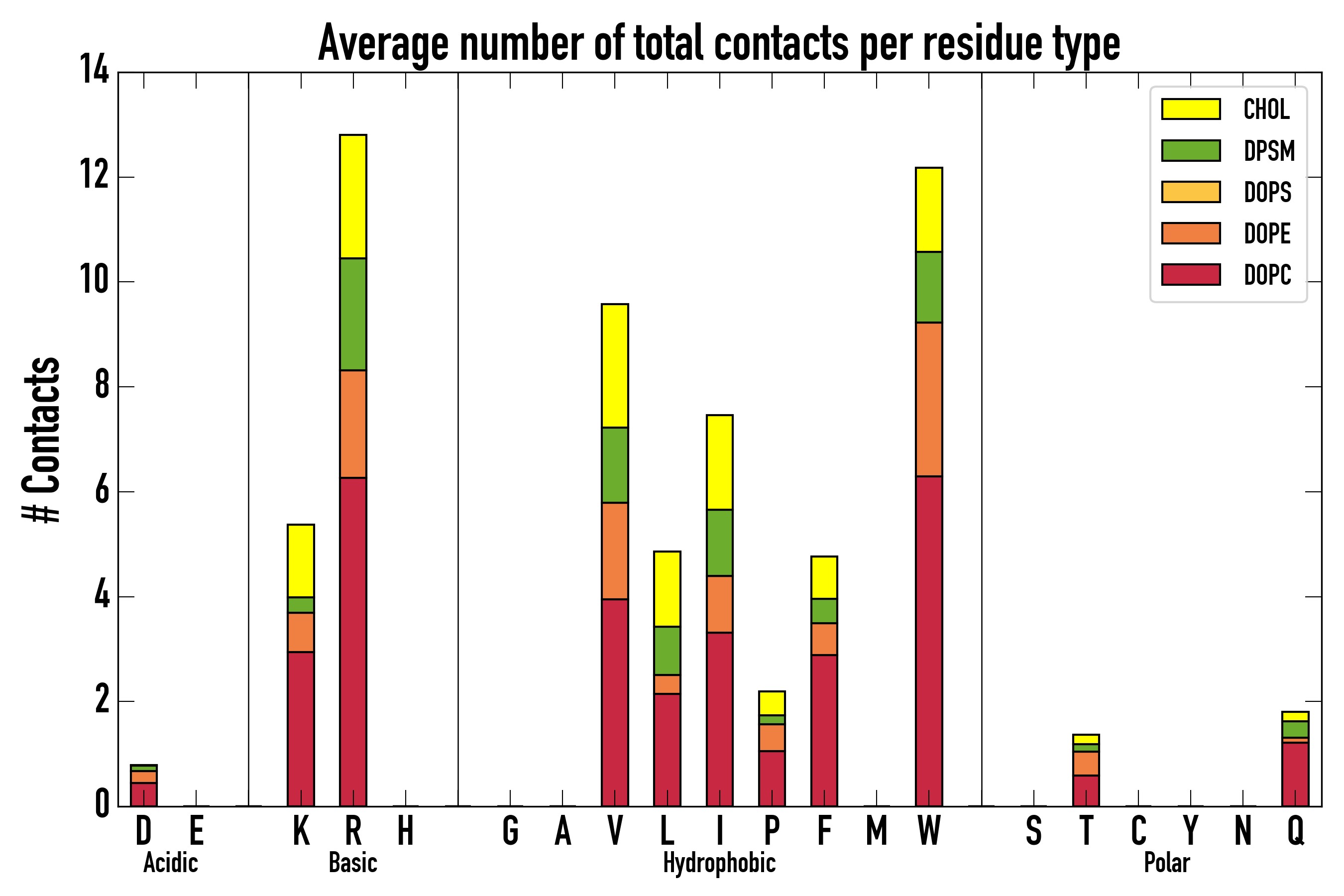 Number of contacts between each residue of the peptide backbone and the different lipid types, averaged over the last microsecond and using a cut-off of 0.6 nm.