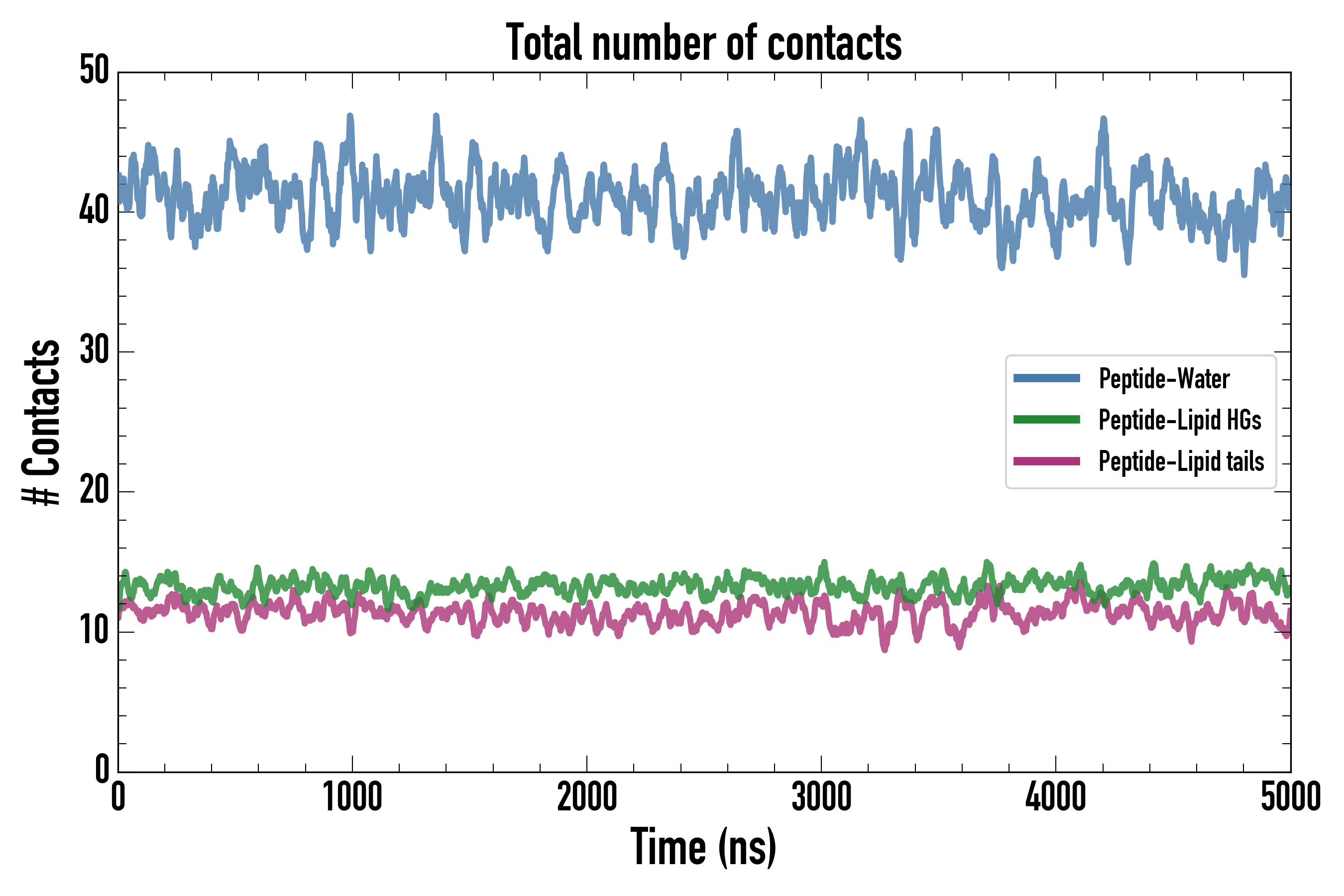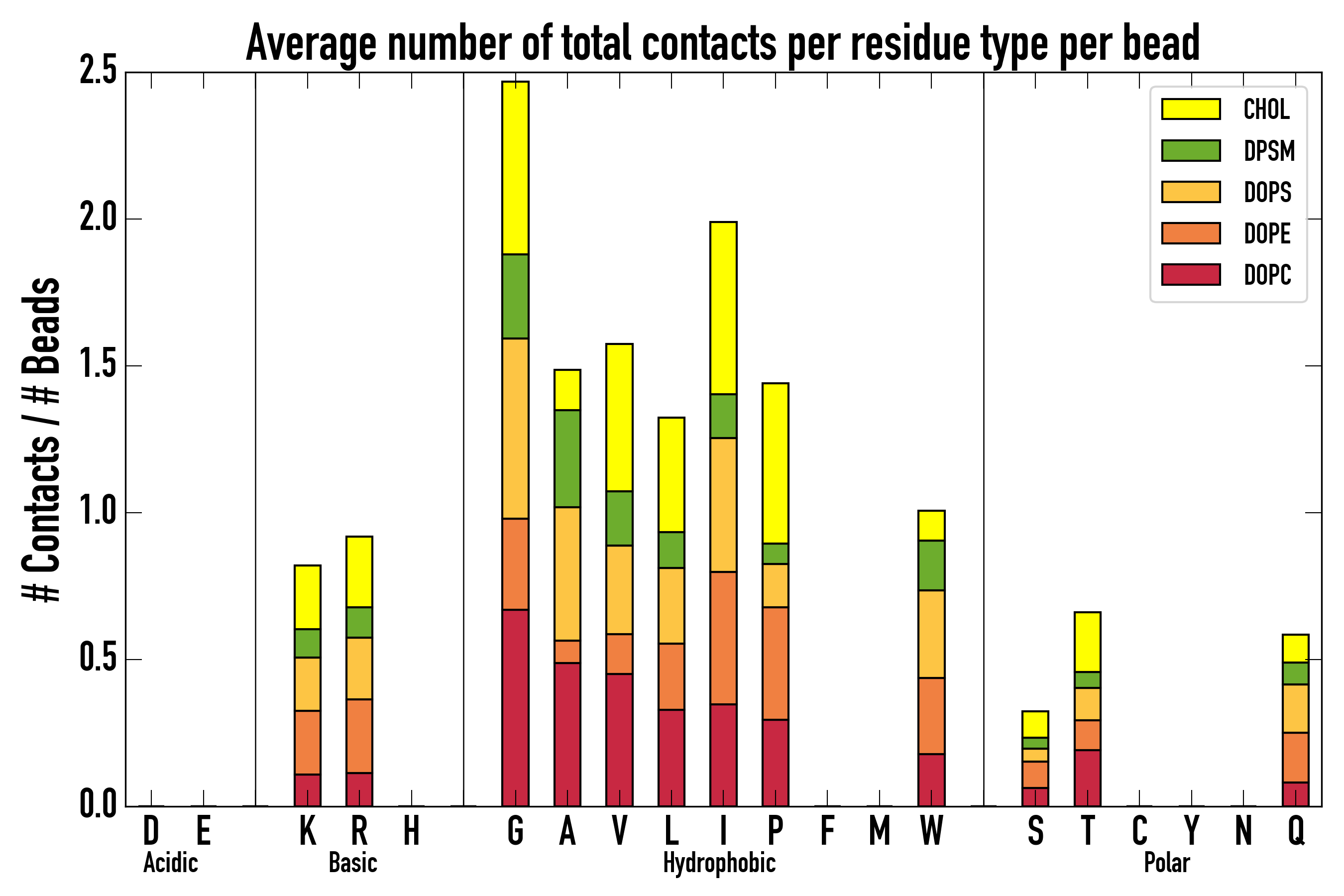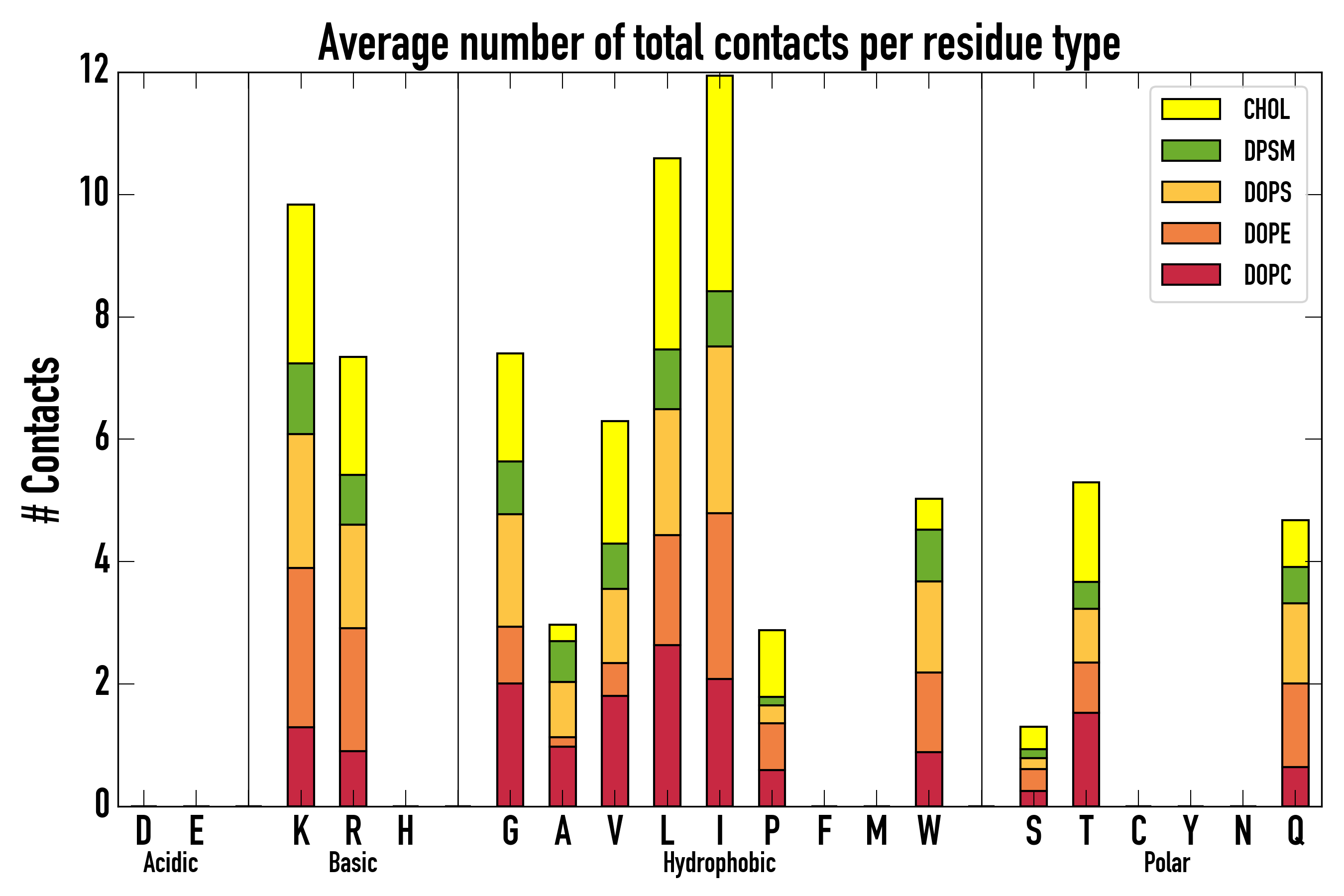 Number of contacts between each residue of the peptide backbone and the different lipid types, averaged over the last microsecond and using a cut-off of 0.6 nm.
