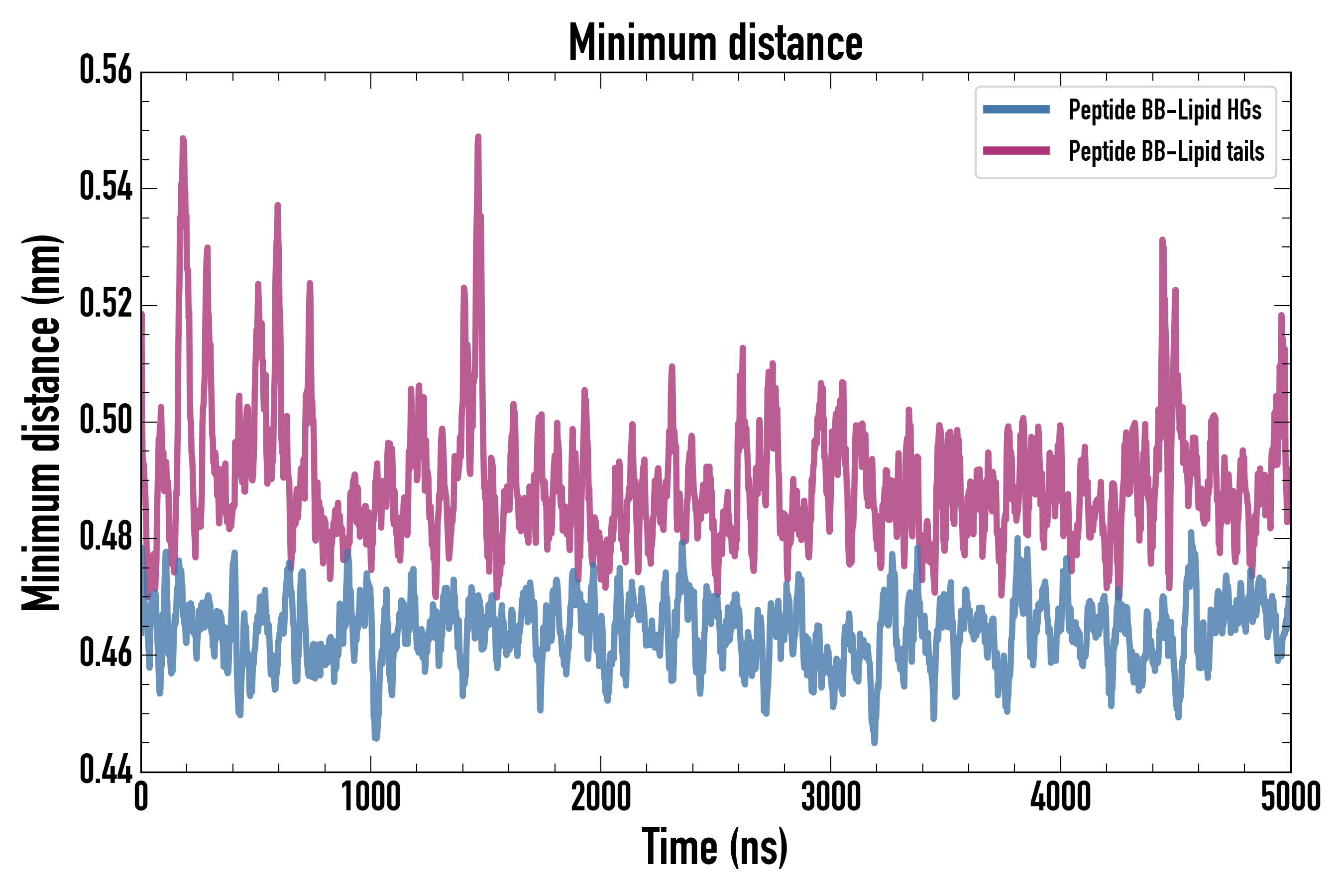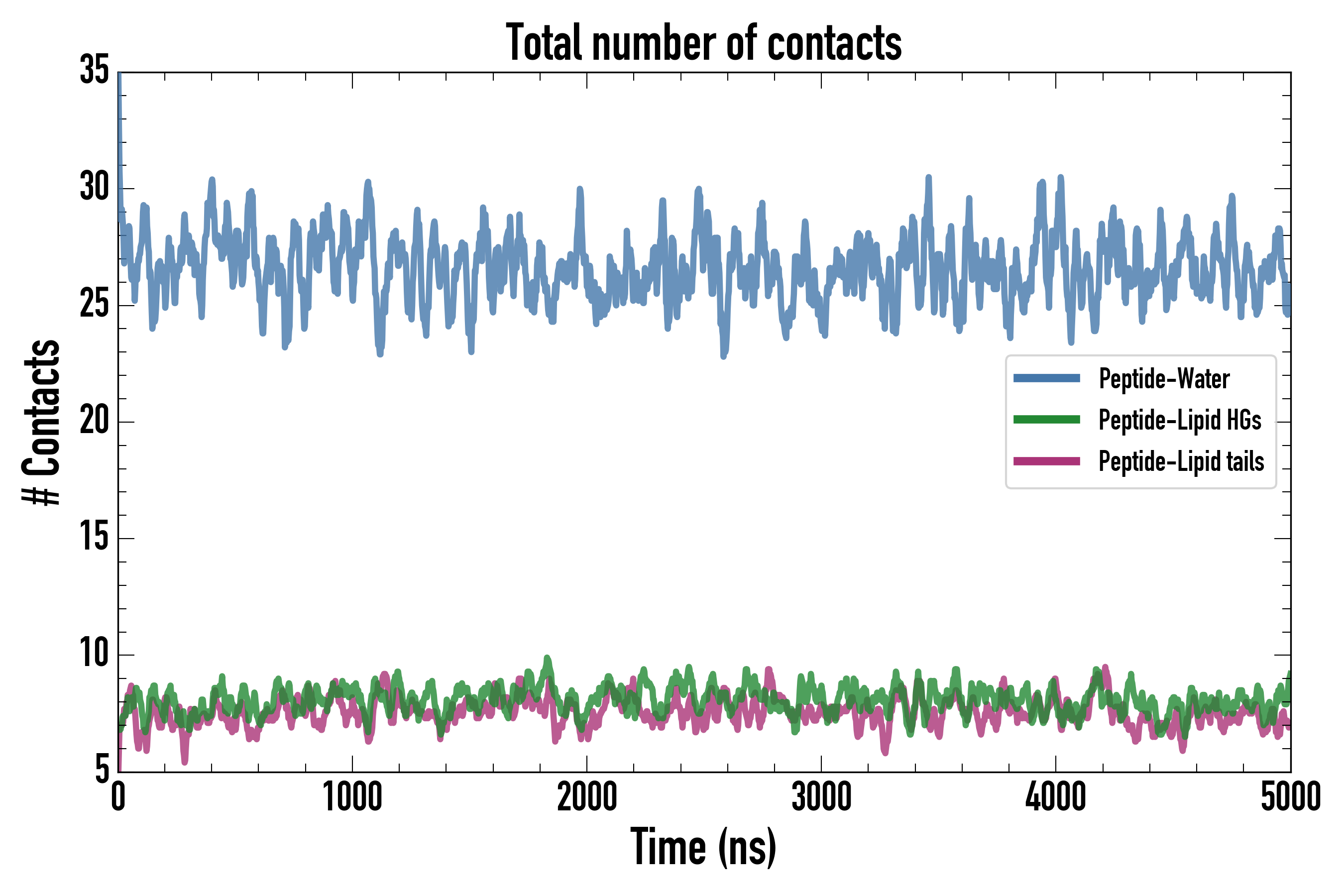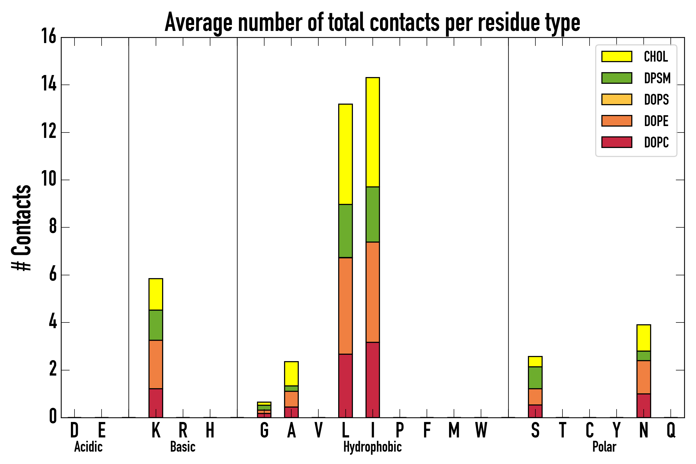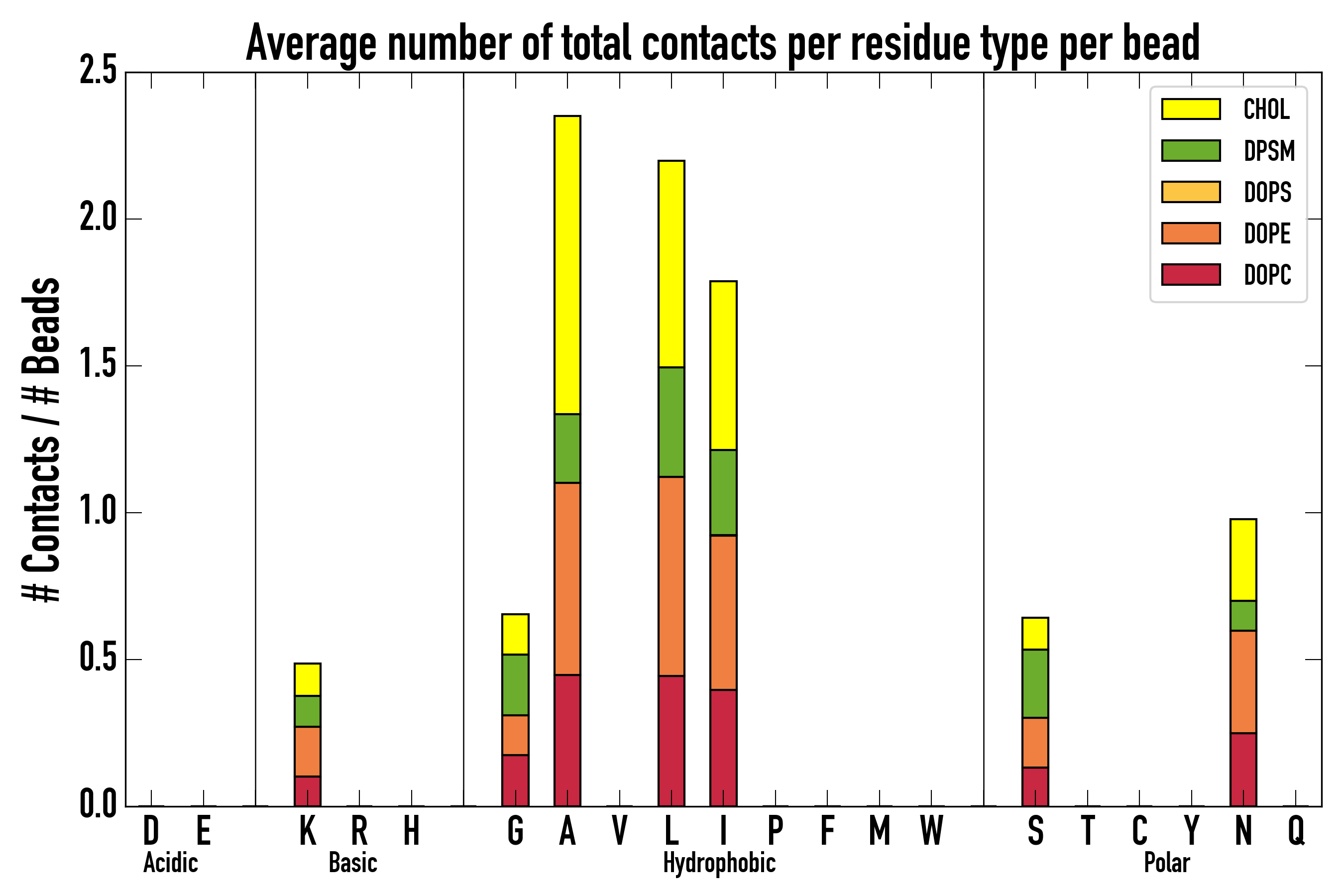 Number of contacts between each residue of the peptide backbone and the different lipid types, averaged over the last microsecond and using a cut-off of 0.6 nm.