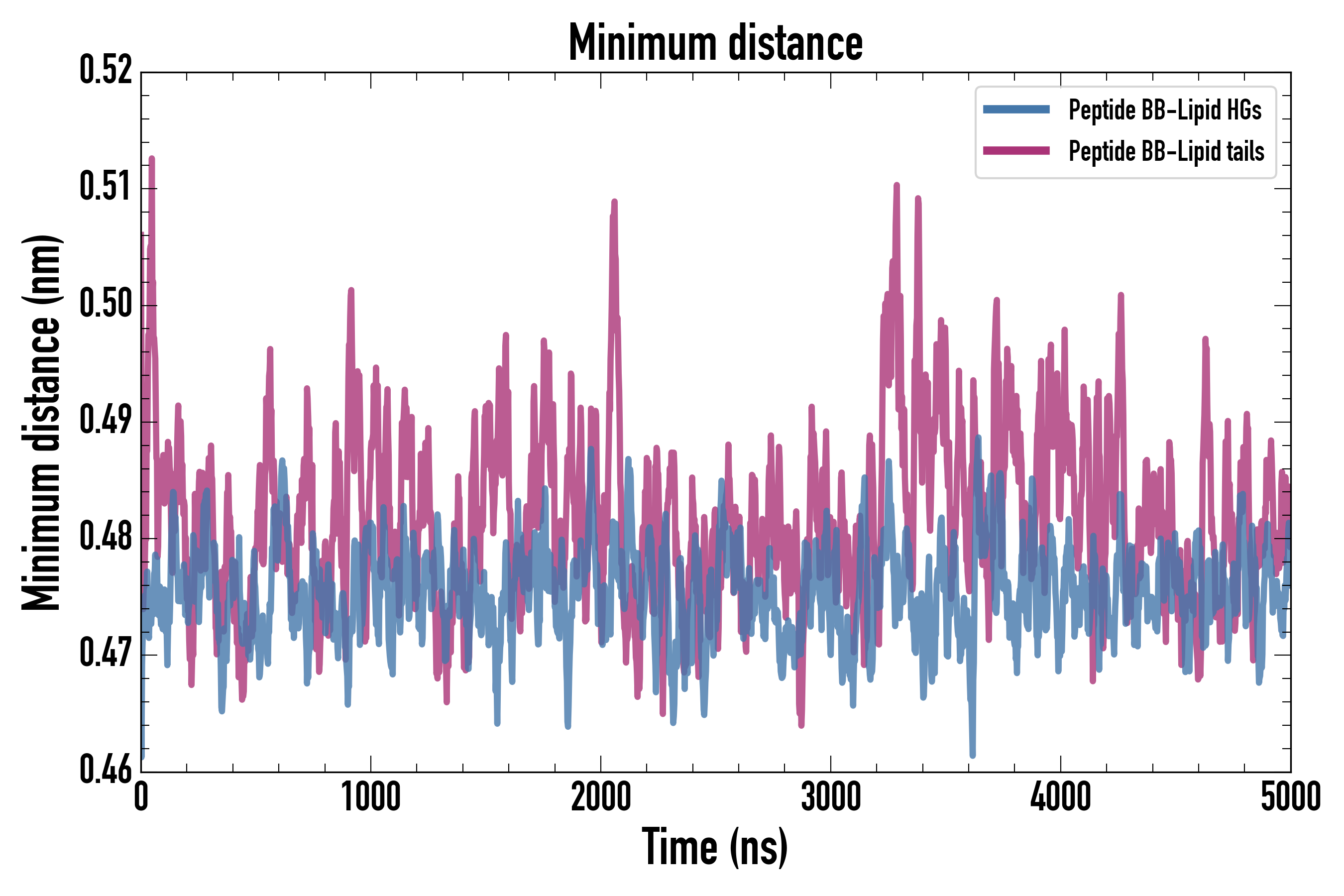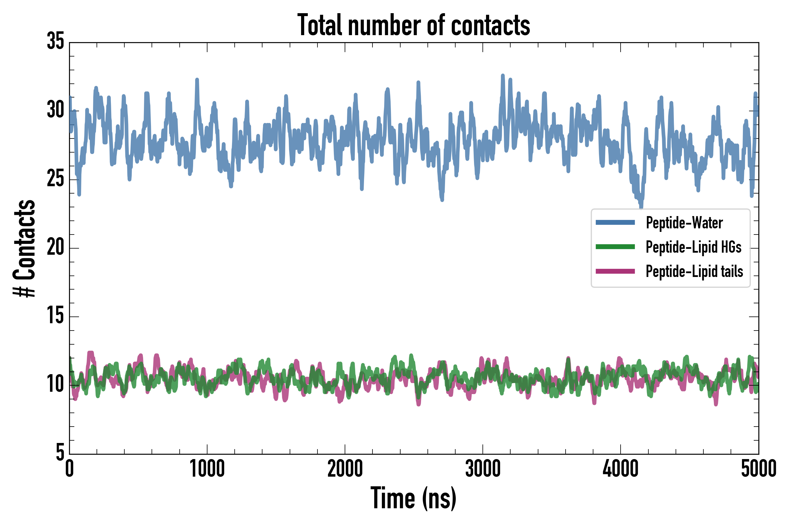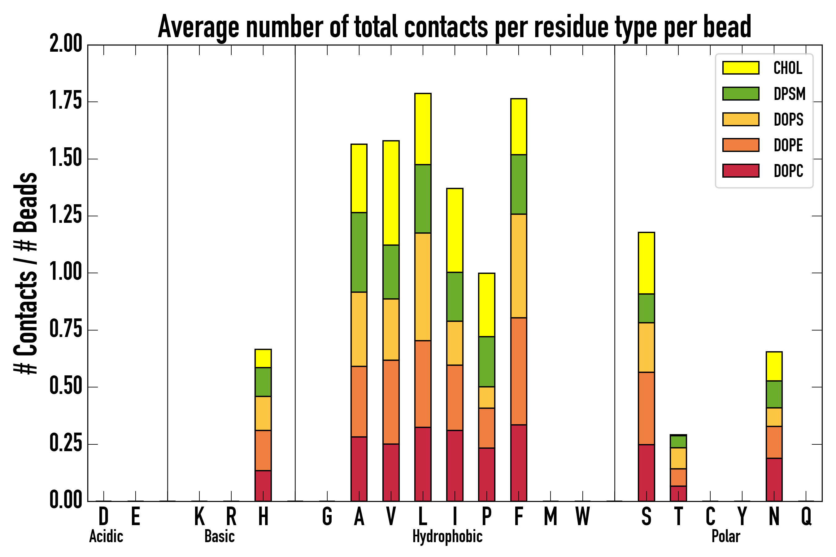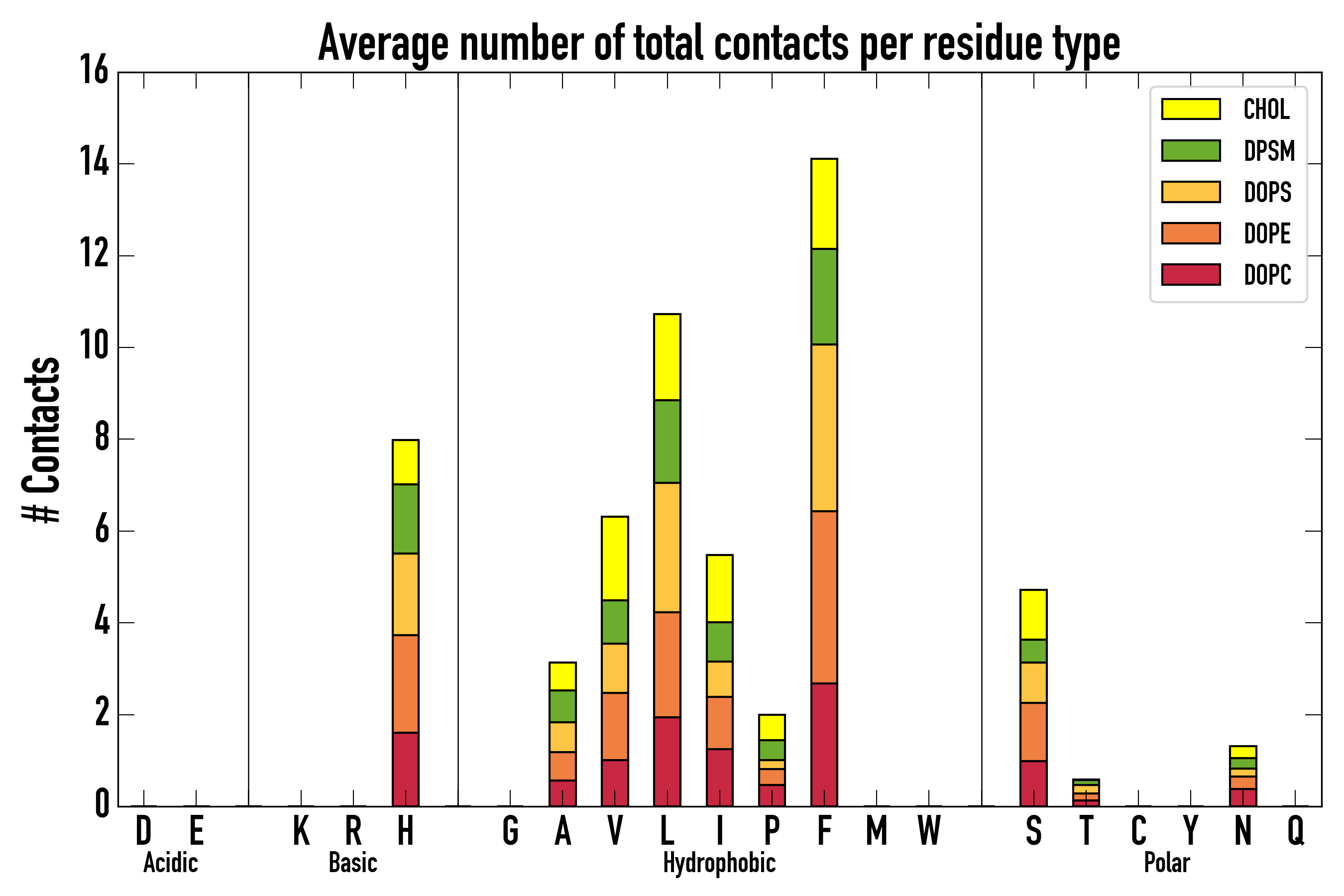 Number of contacts between each residue of the peptide backbone and the different lipid types, averaged over the last microsecond and using a cut-off of 0.6 nm.