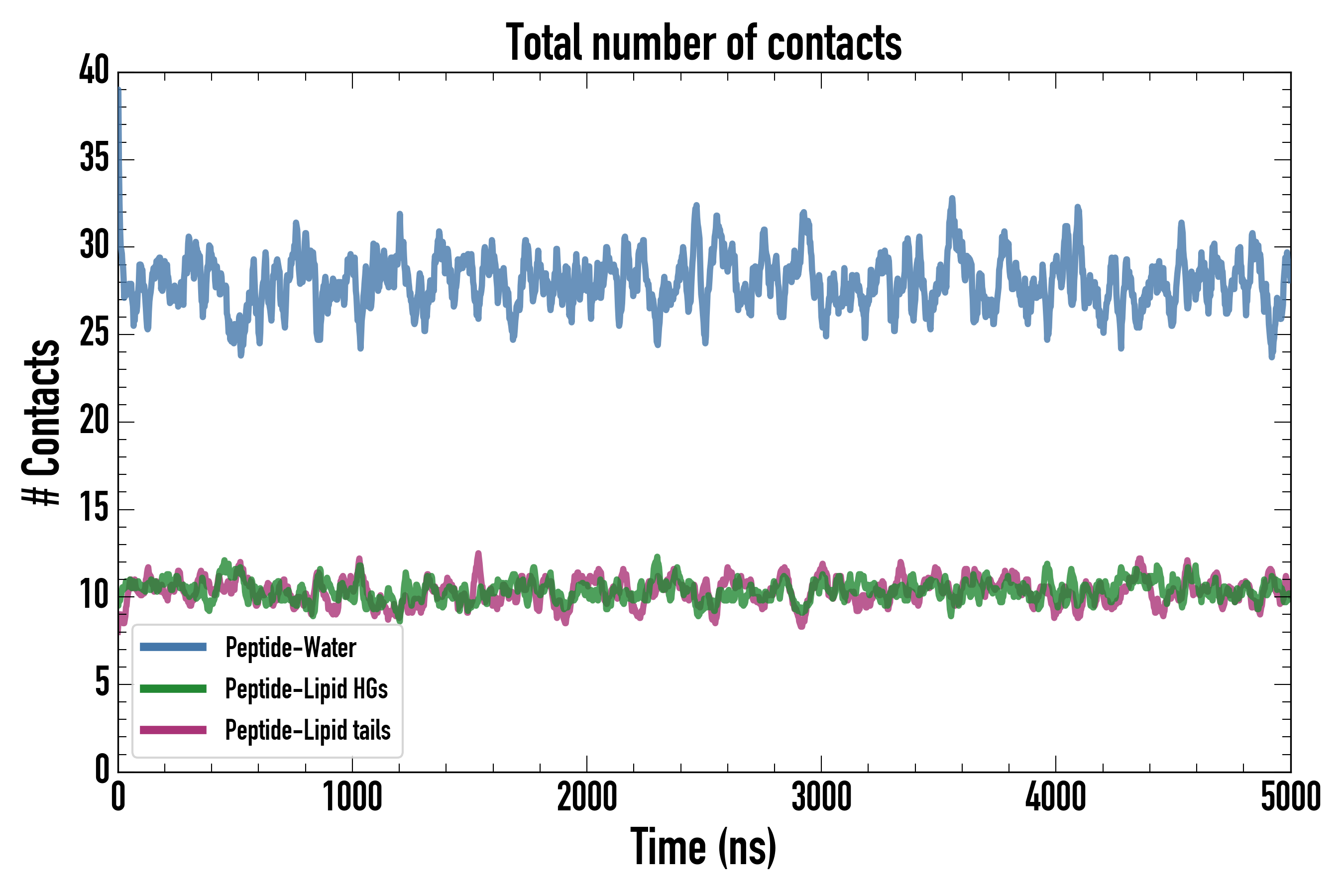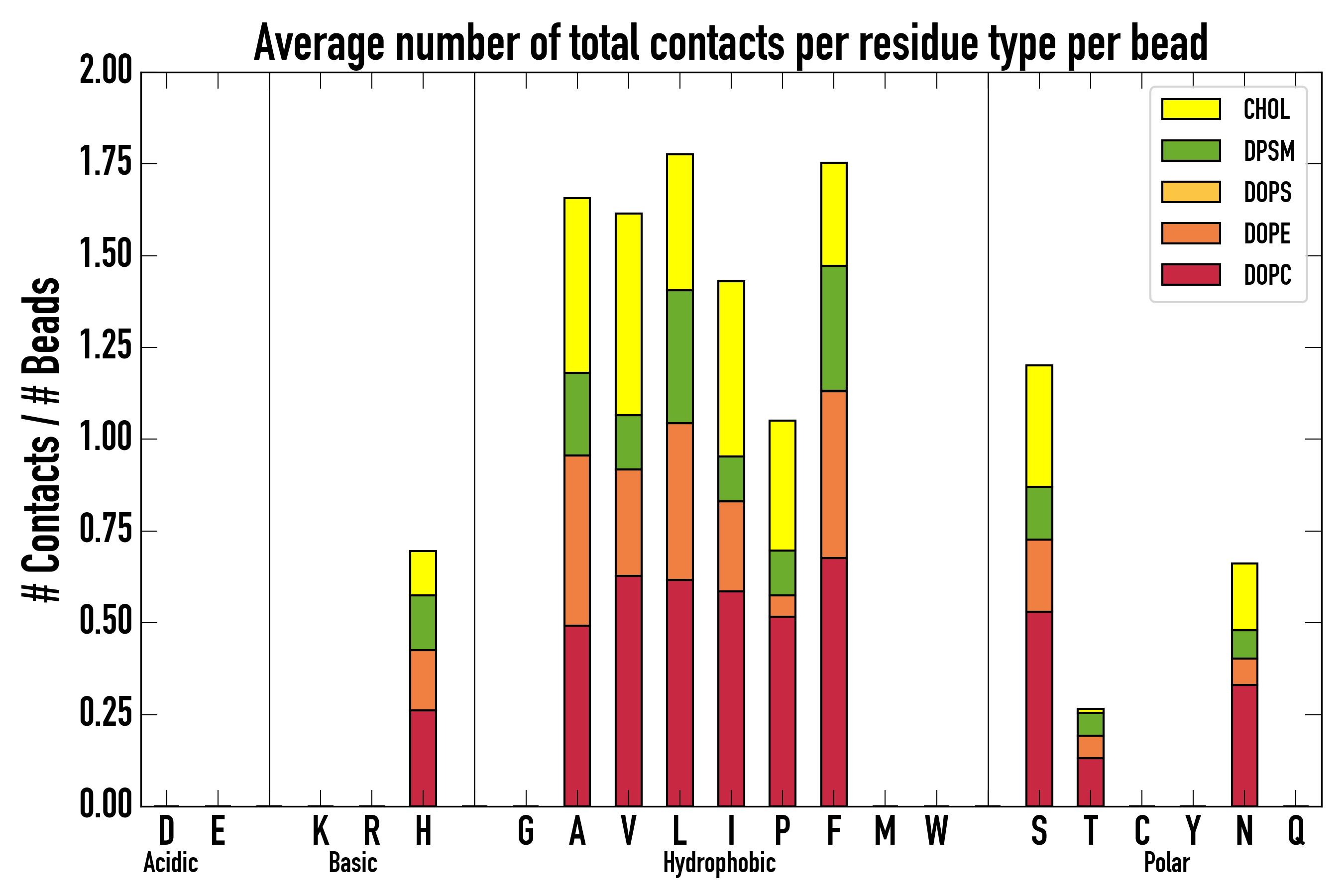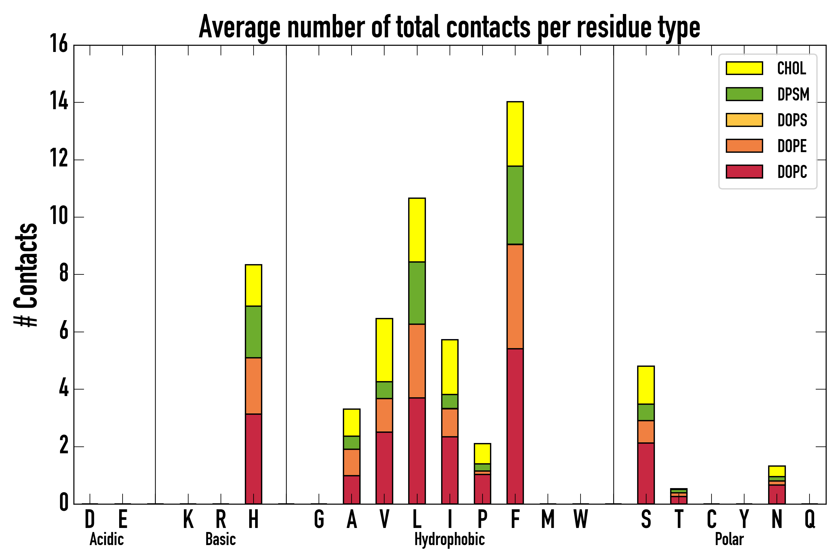 Number of contacts between each residue of the peptide backbone and the different lipid types, averaged over the last microsecond and using a cut-off of 0.6 nm.