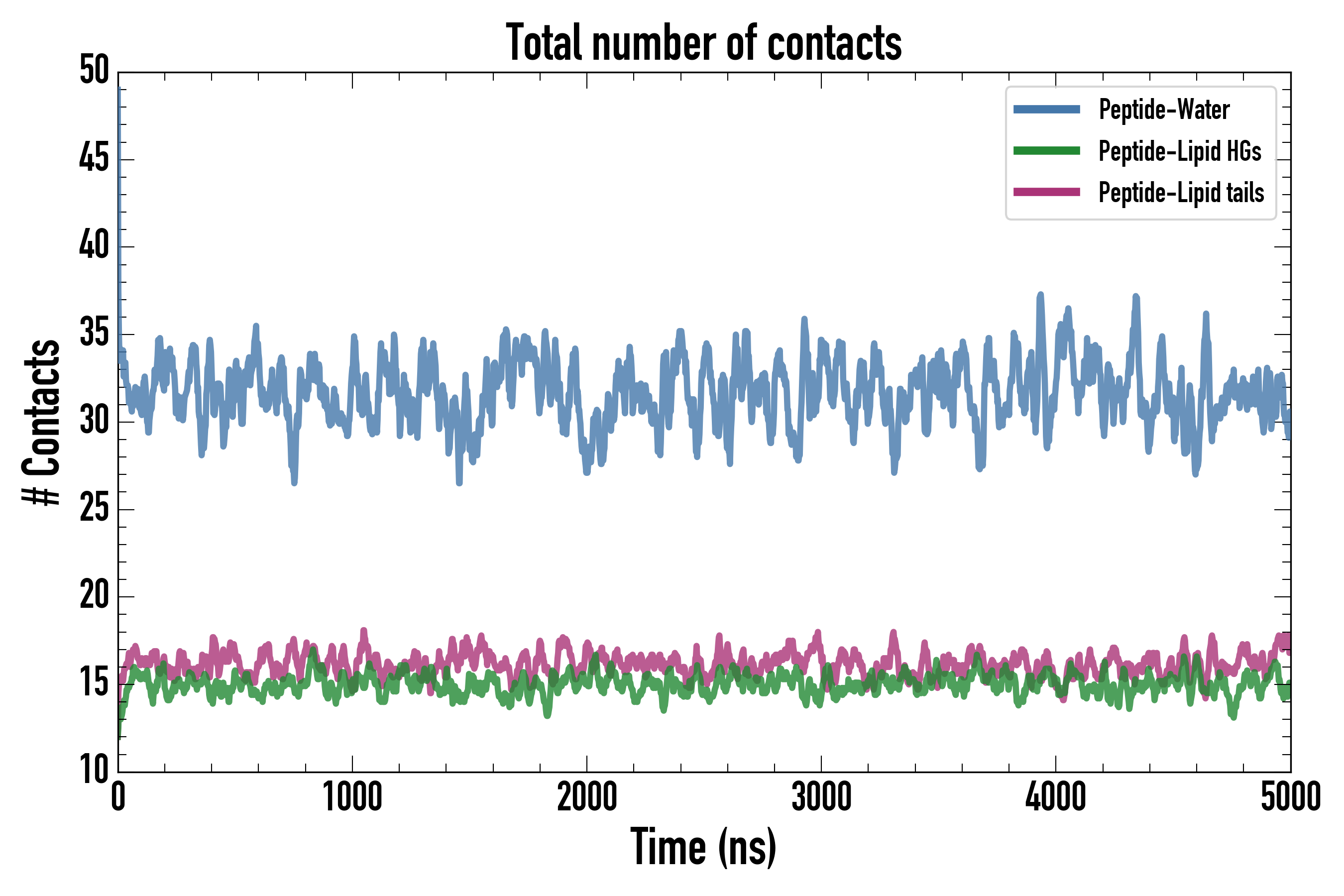 Number of contacts between each residue of the peptide backbone and the different lipid types, averaged over the last microsecond and using a cut-off of 0.6 nm.