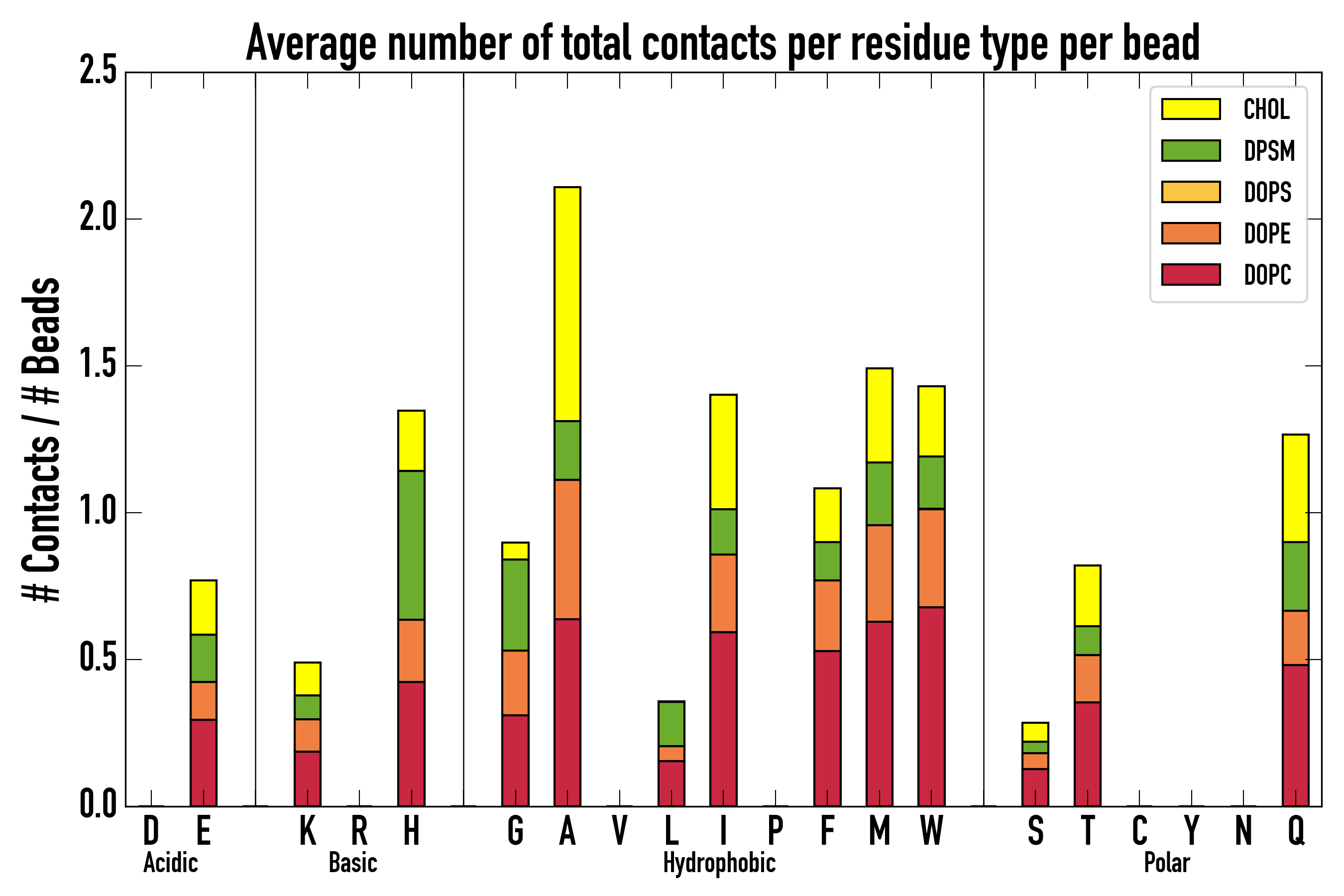 Number of contacts between each residue of the peptide backbone and the different lipid types, averaged over the last microsecond and using a cut-off of 0.6 nm.