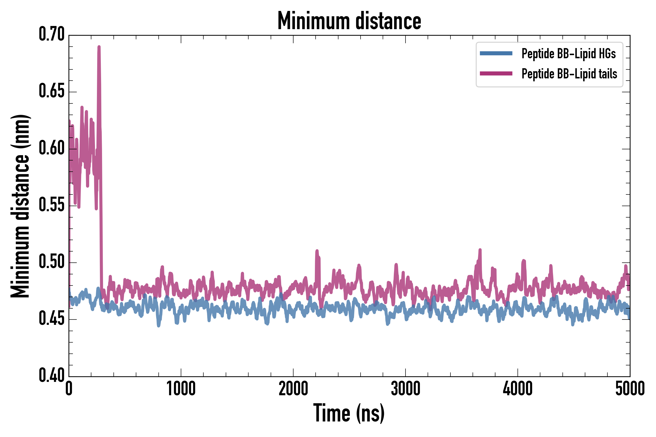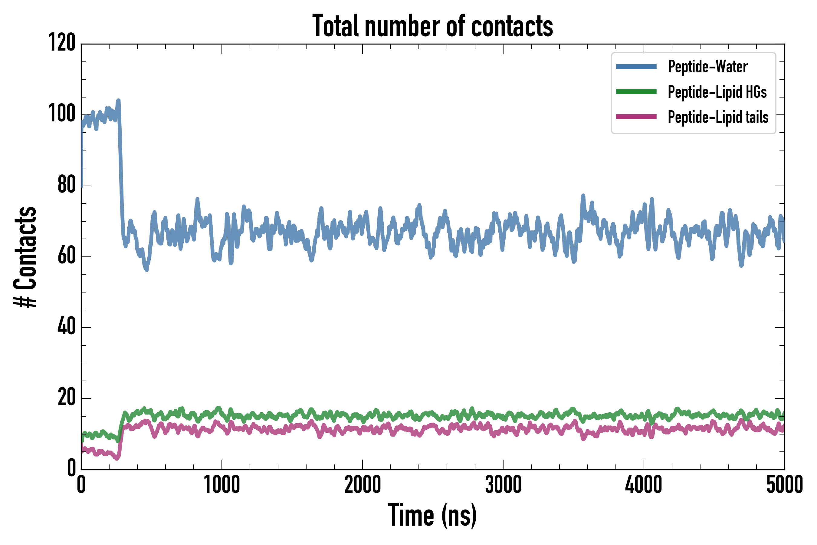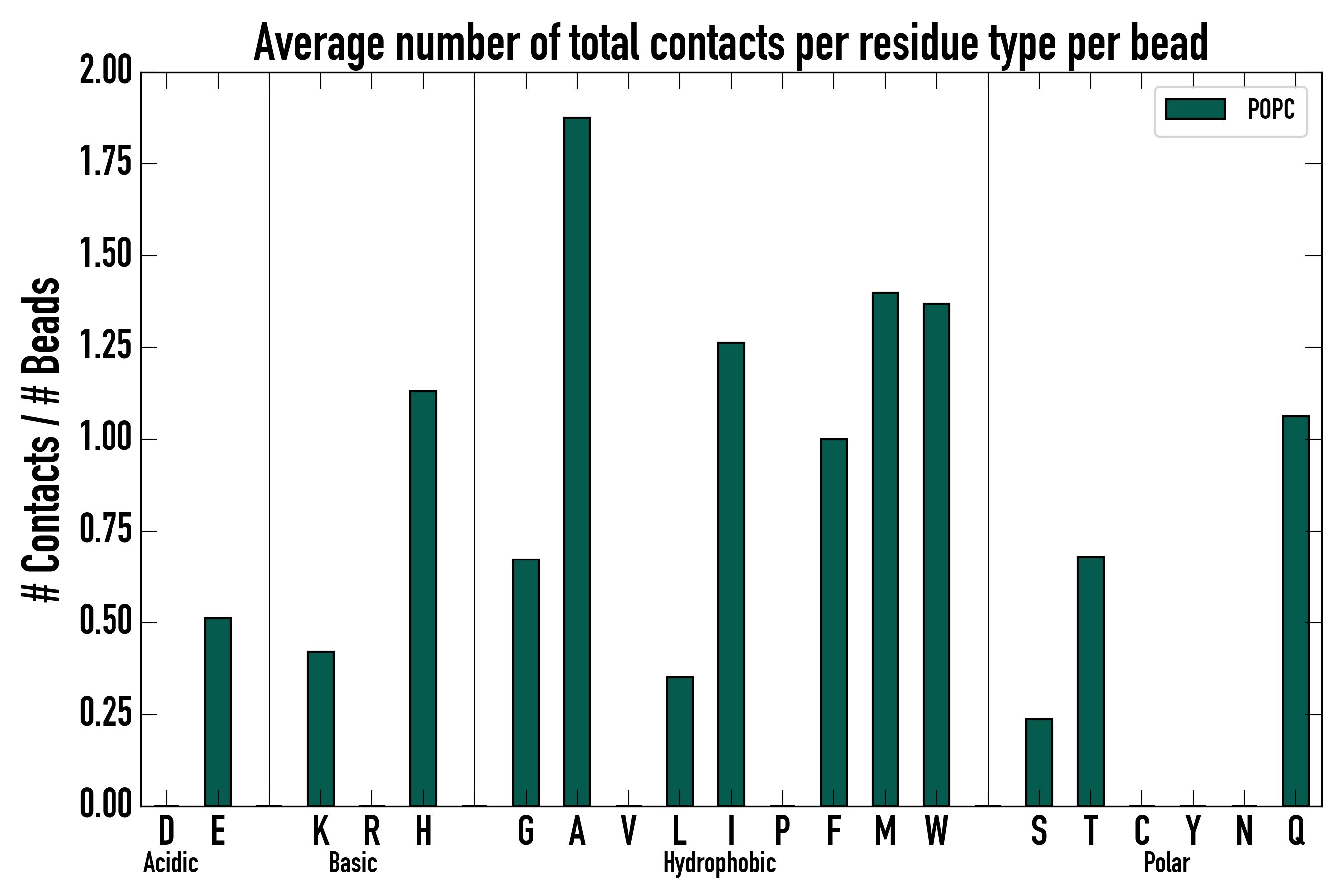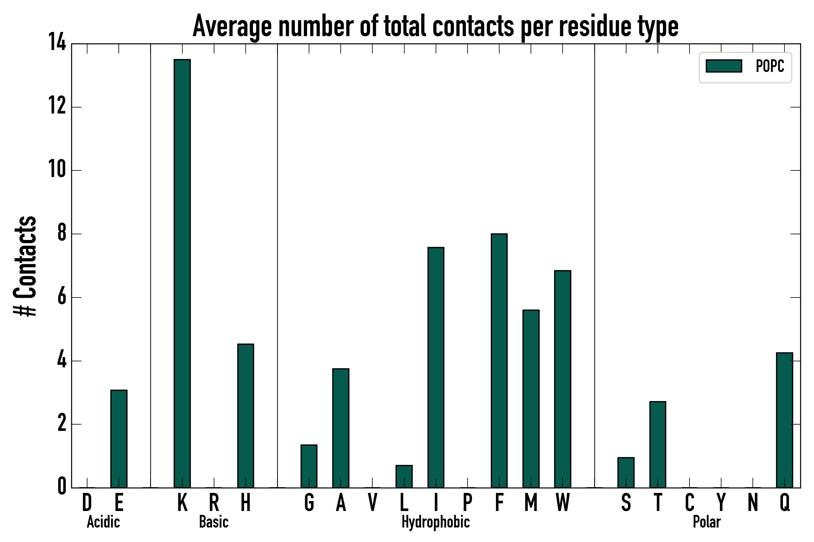Number of contacts between each residue of the peptide backbone and the different lipid types, averaged over the last microsecond and using a cut-off of 0.6 nm.