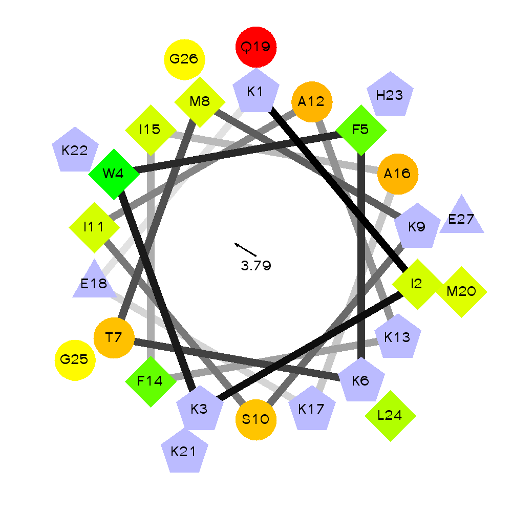By amino acid: Basic: 9 Acidic: 2 Hydrophobic: 13 Polar: 3 Electrostatic Dipolar Moment (e nm): 10.9