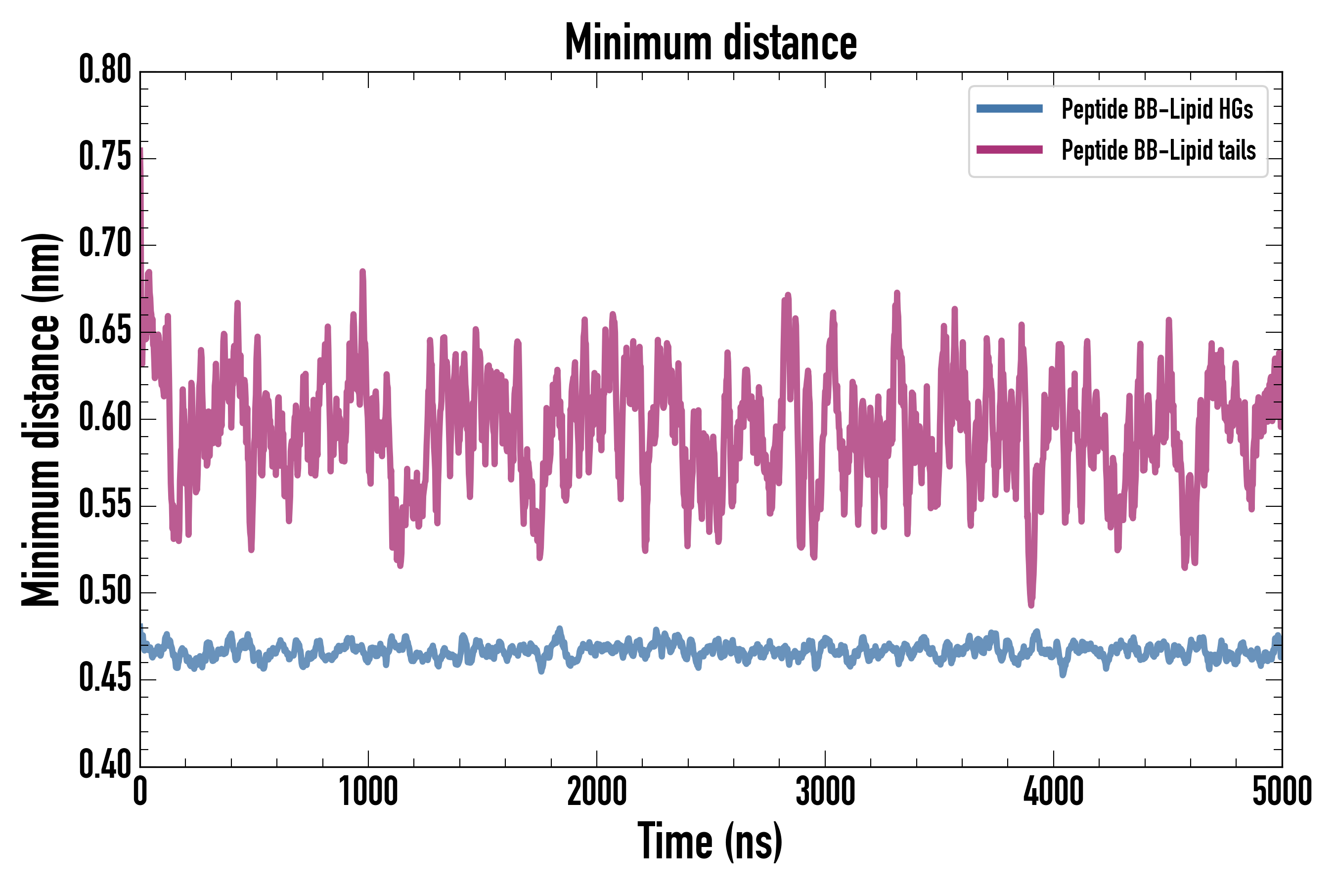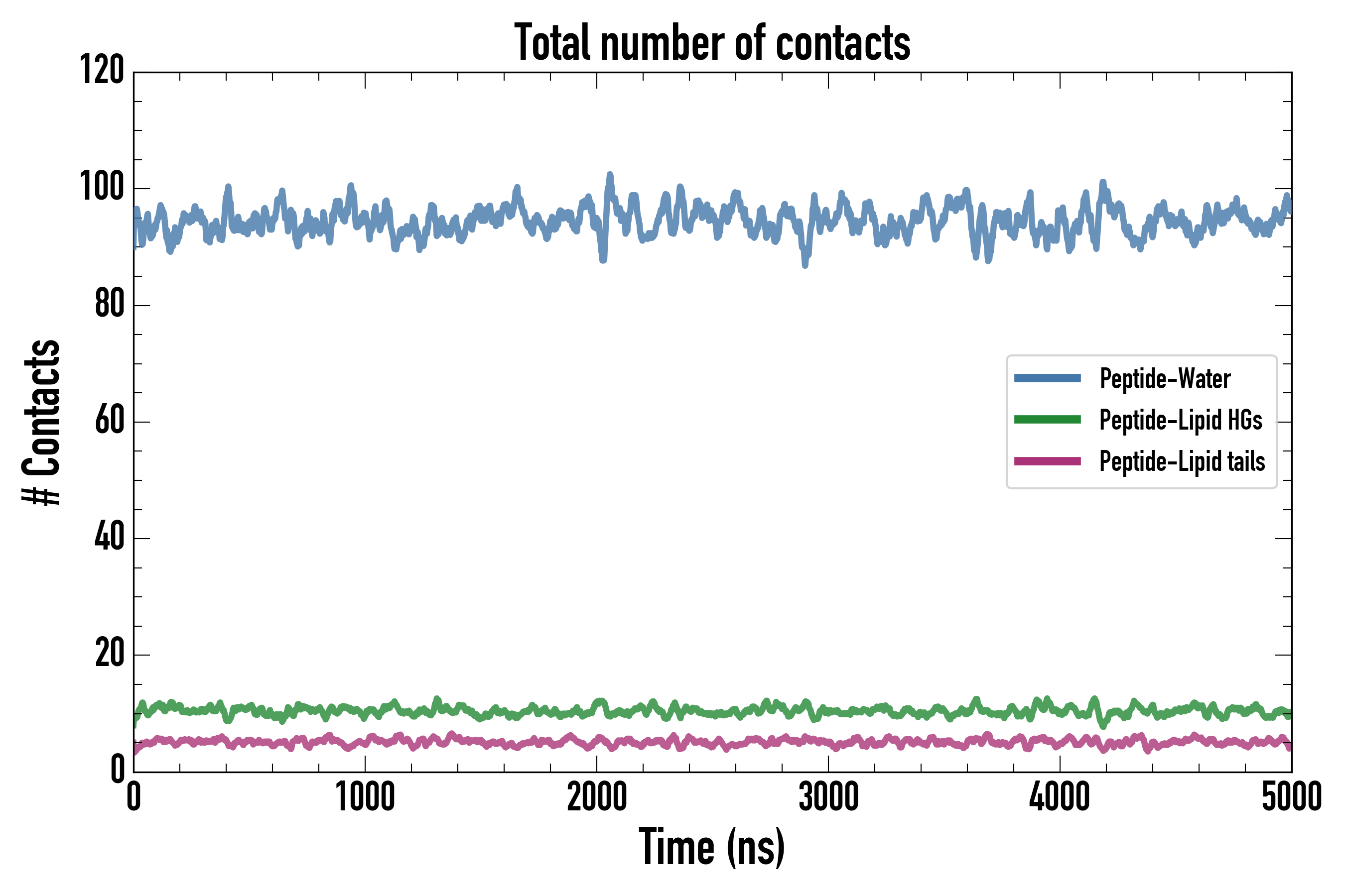 Number of contacts between each residue of the peptide backbone and the different lipid types, averaged over the last microsecond and using a cut-off of 0.6 nm.