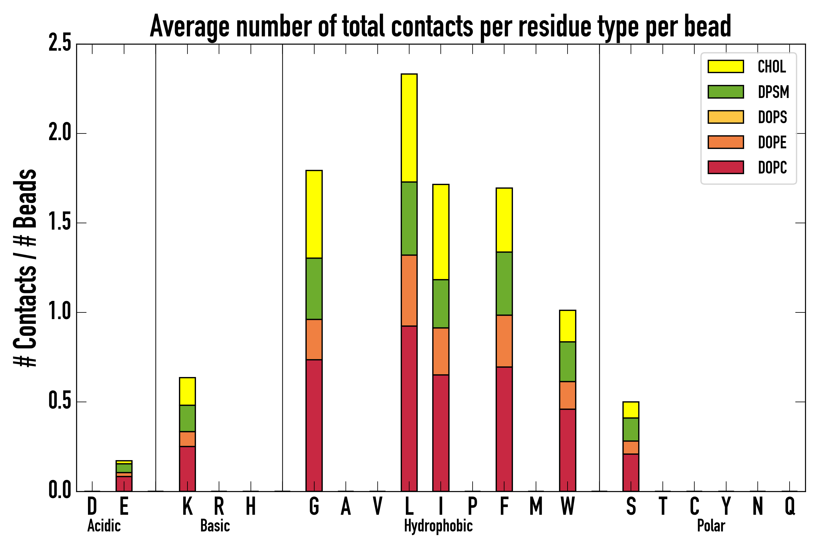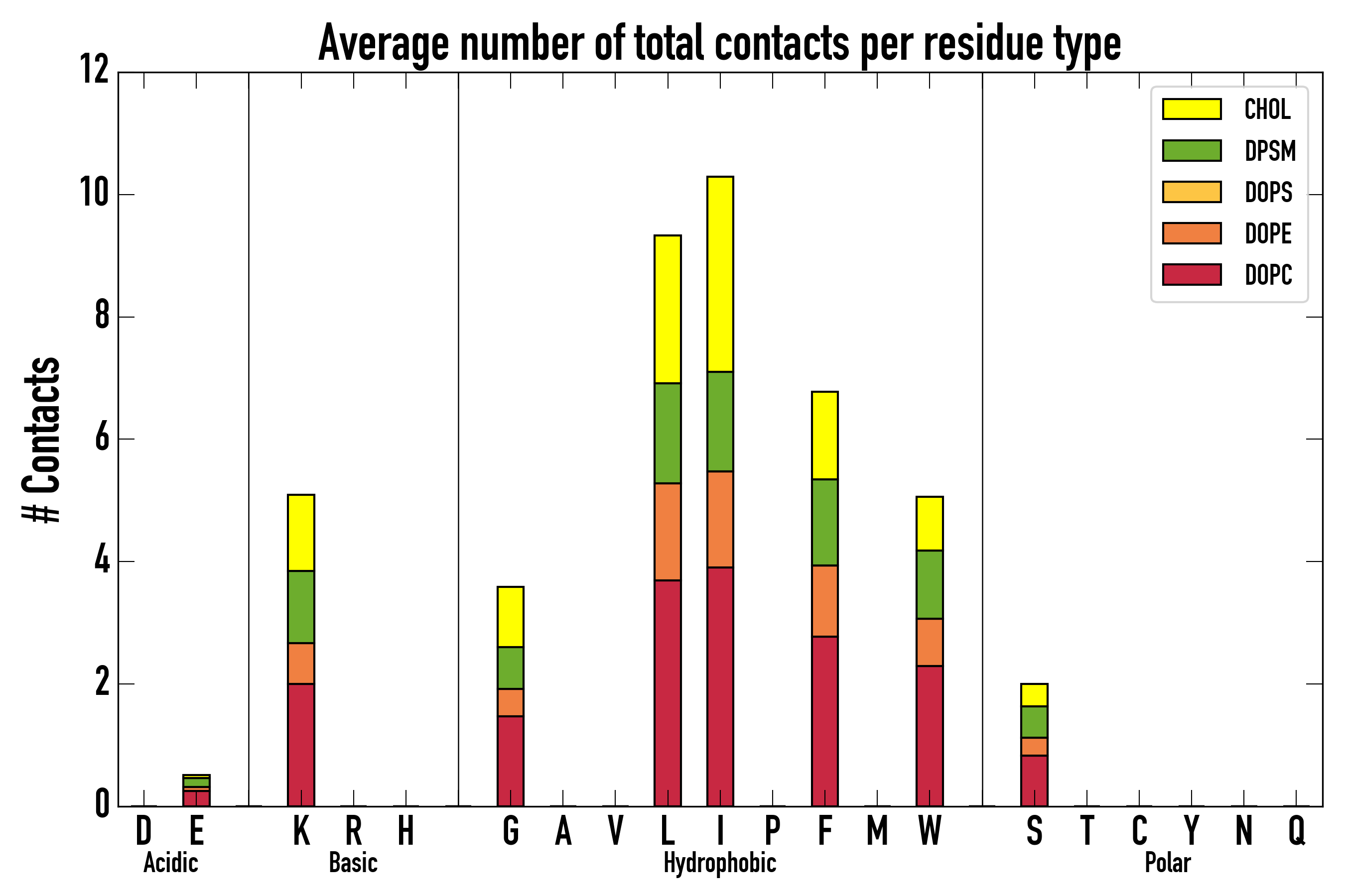 Number of contacts between each residue of the peptide backbone and the different lipid types, averaged over the last microsecond and using a cut-off of 0.6 nm.