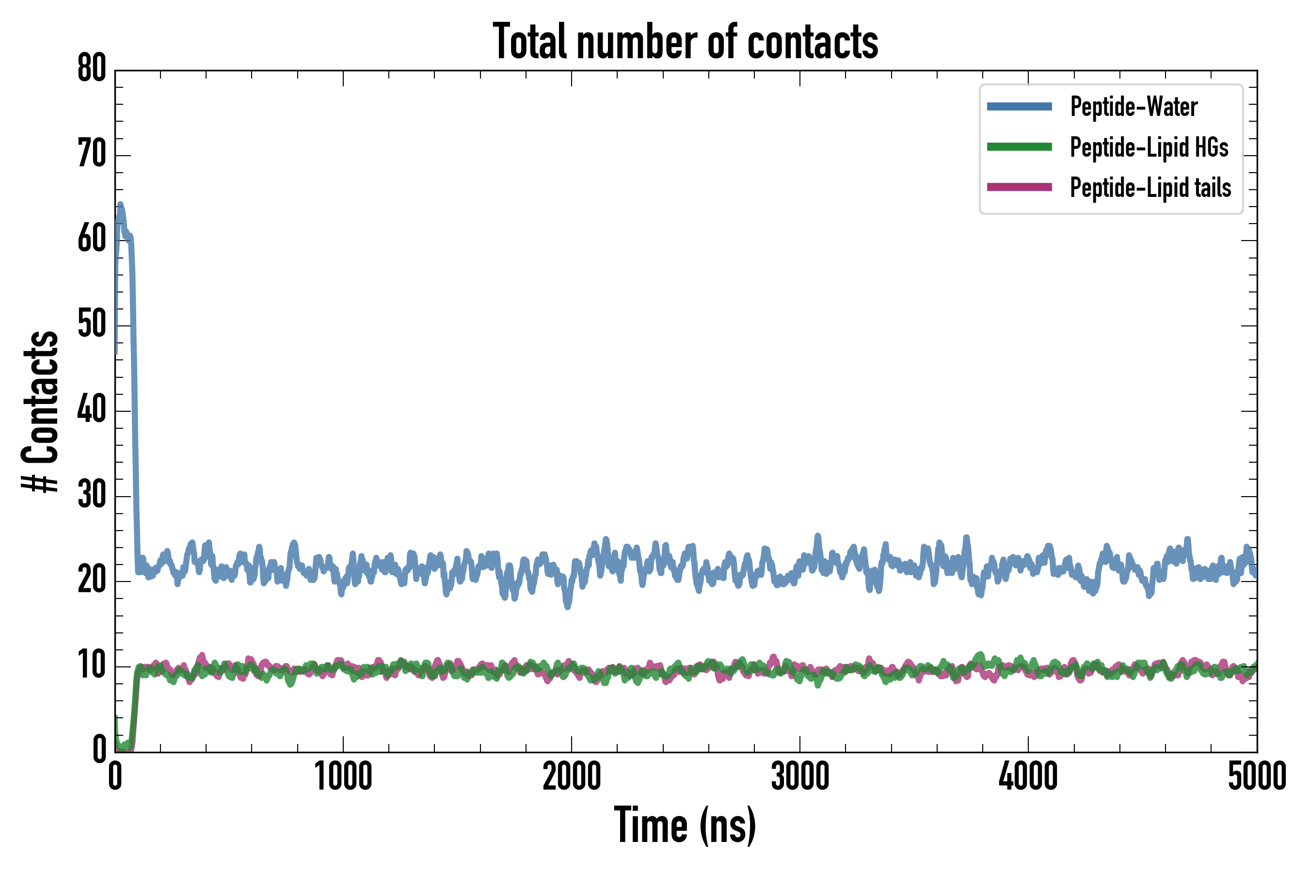 Number of contacts between each residue of the peptide backbone and the different lipid types, averaged over the last microsecond and using a cut-off of 0.6 nm.