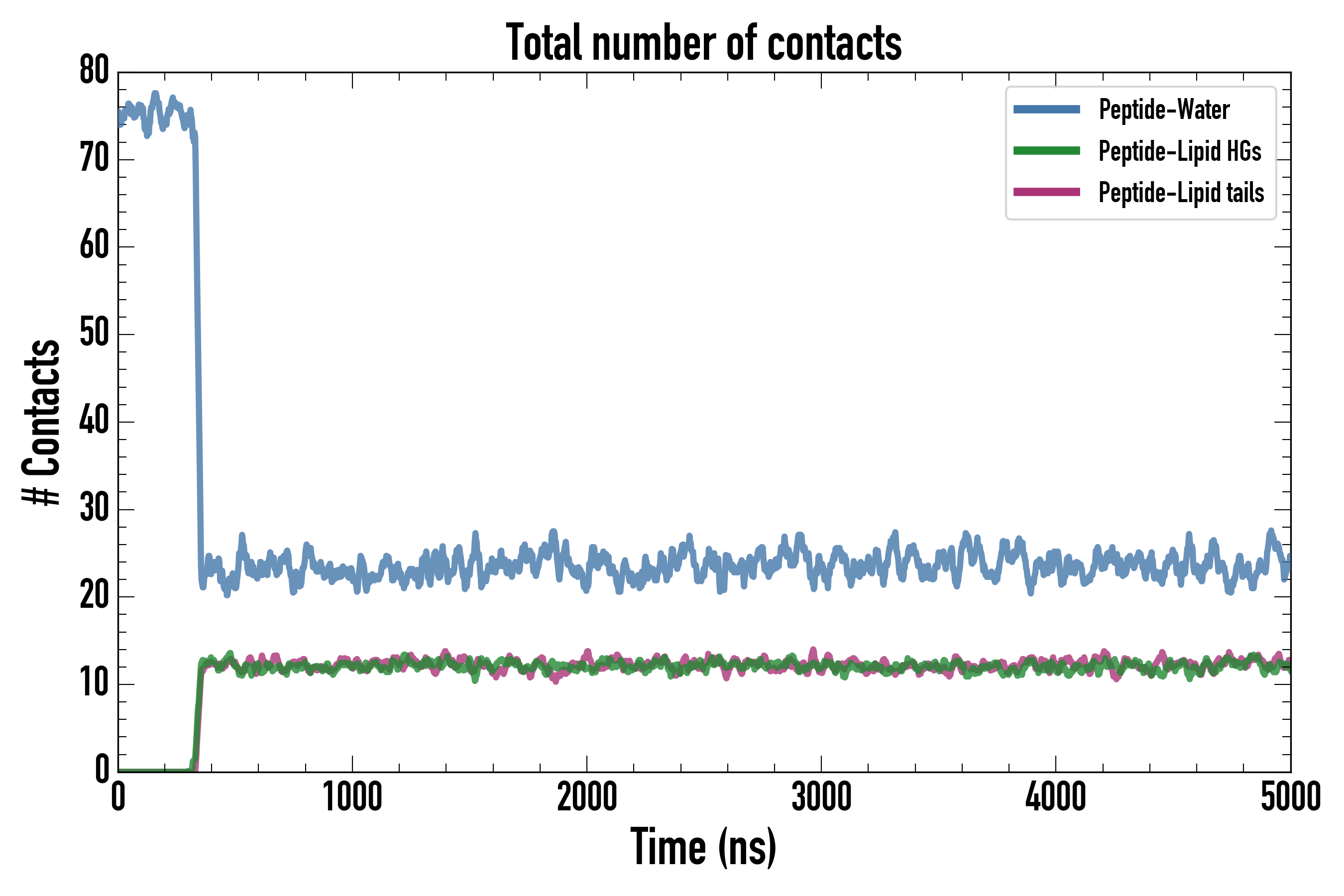 Number of contacts between each residue of the peptide backbone and the different lipid types, averaged over the last microsecond and using a cut-off of 0.6 nm.