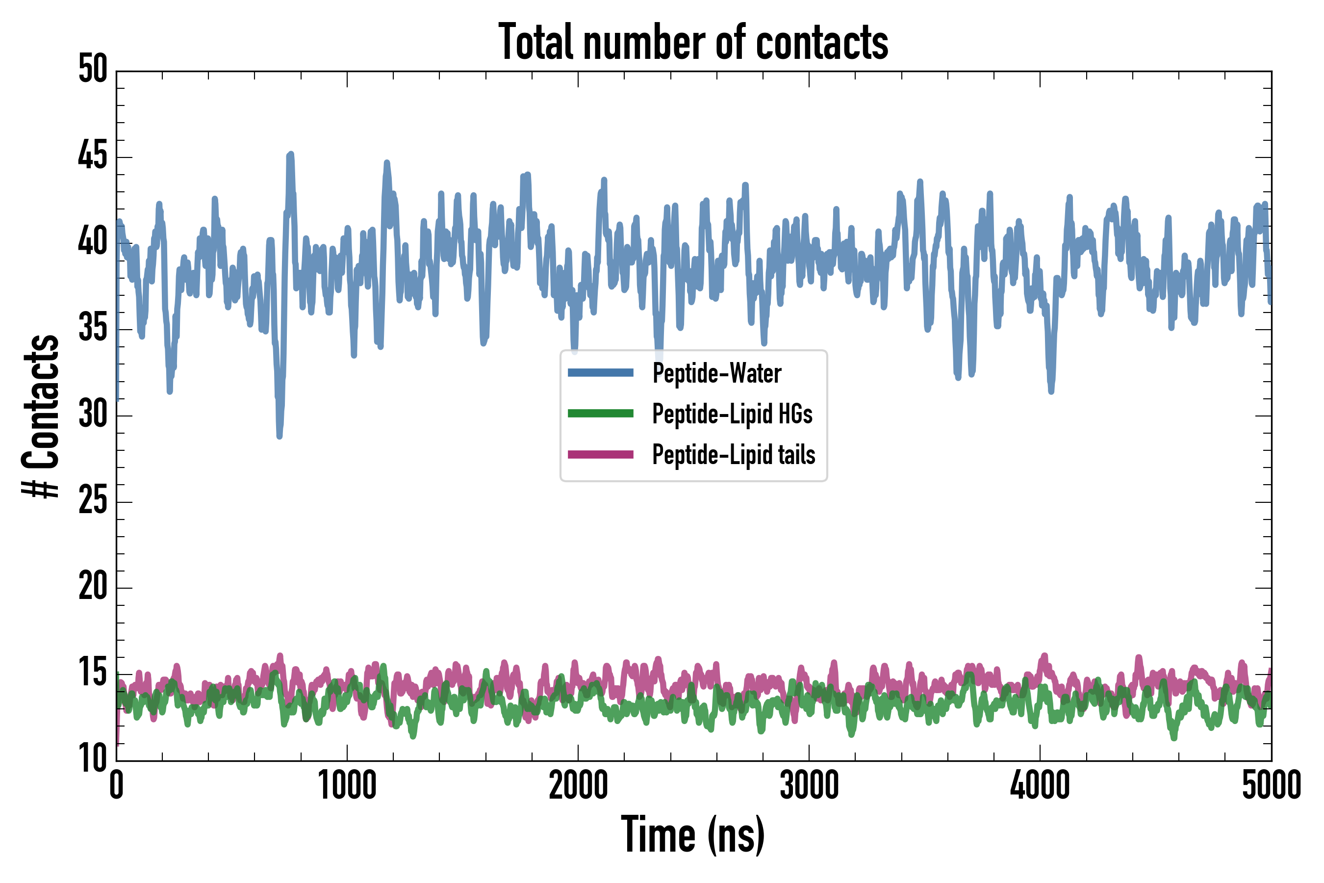 Number of contacts between each residue of the peptide backbone and the different lipid types, averaged over the last microsecond and using a cut-off of 0.6 nm.