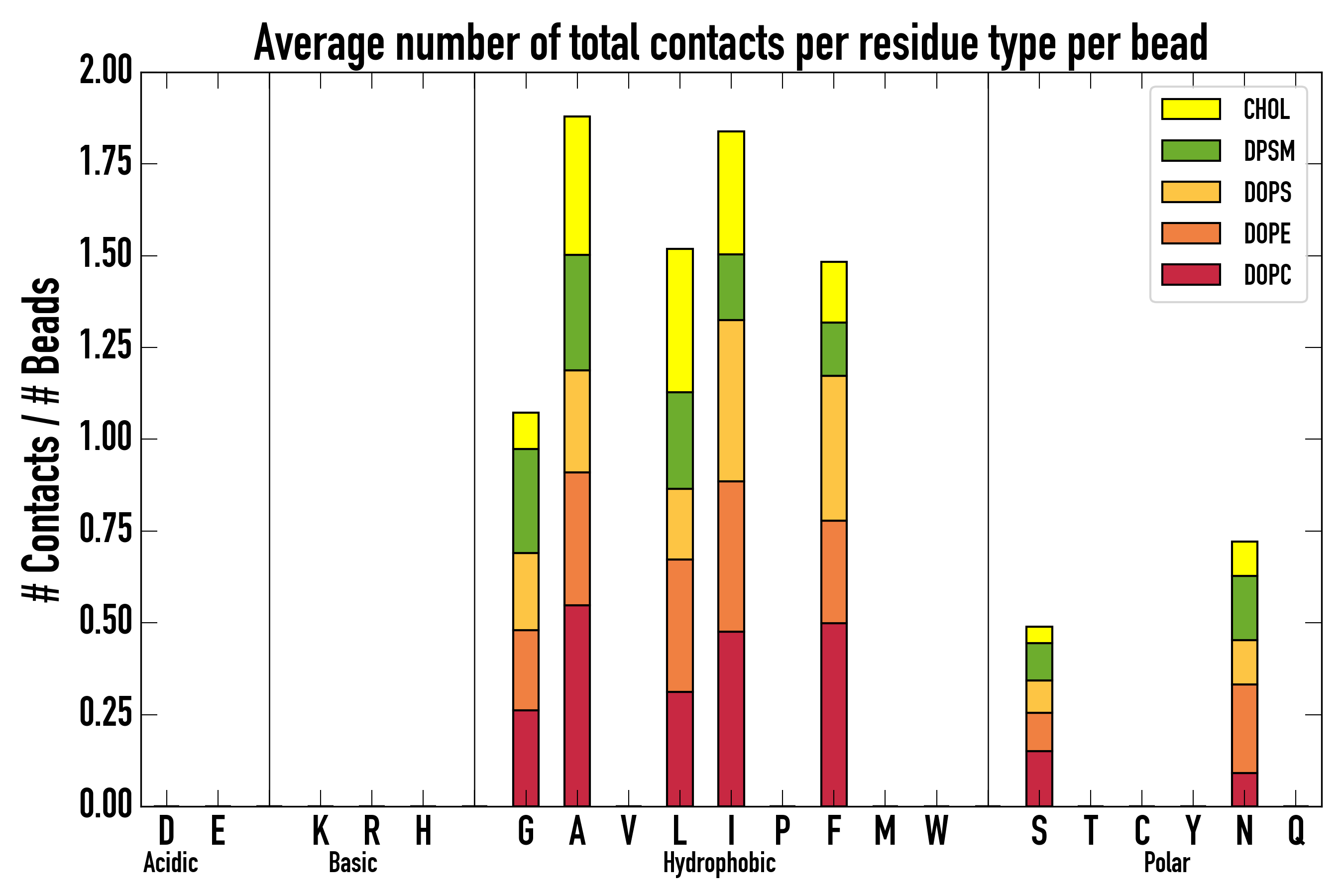 Number of contacts between each residue of the peptide backbone and the different lipid types, averaged over the last microsecond and using a cut-off of 0.6 nm.