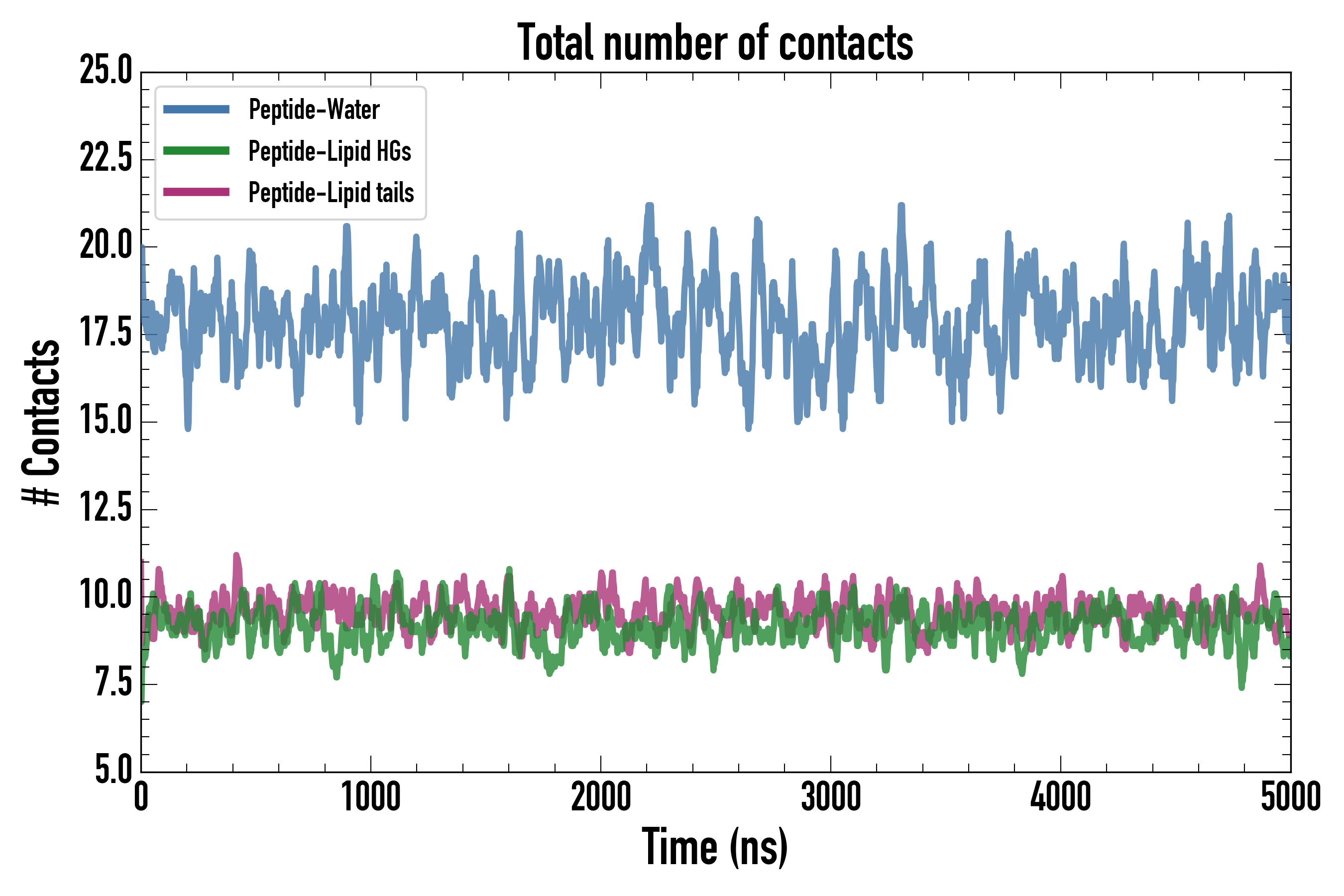 Number of contacts between each residue of the peptide backbone and the different lipid types, averaged over the last microsecond and using a cut-off of 0.6 nm.