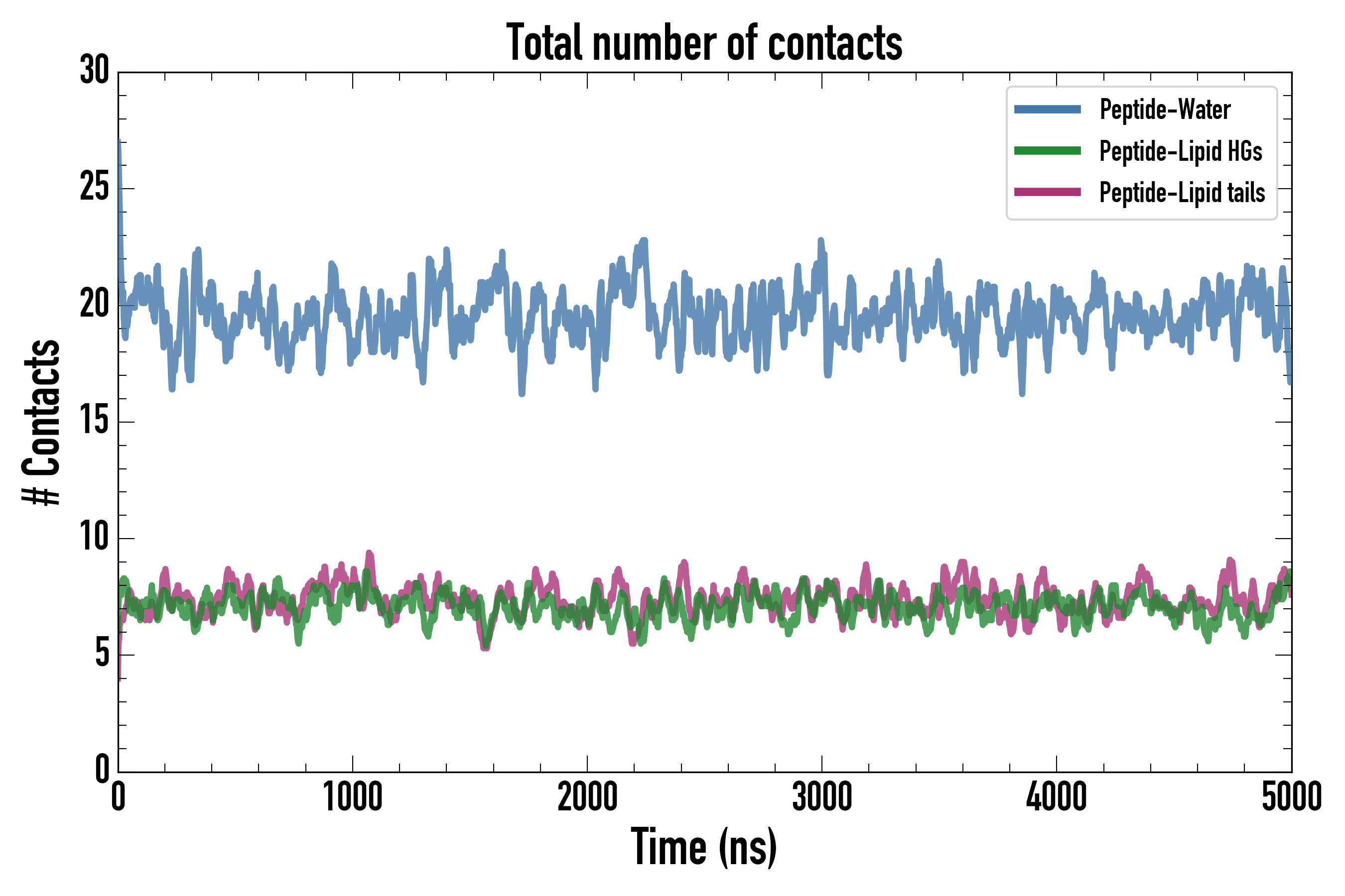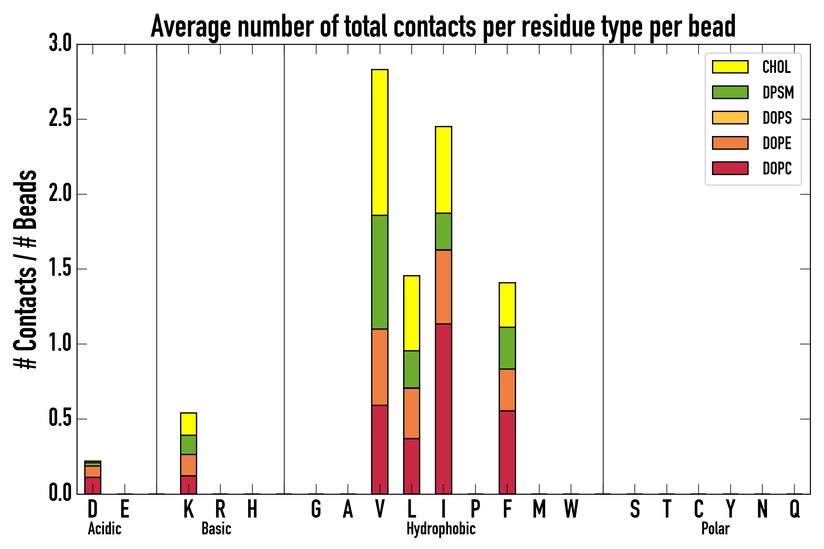 Number of contacts between each residue of the peptide backbone and the different lipid types, averaged over the last microsecond and using a cut-off of 0.6 nm.