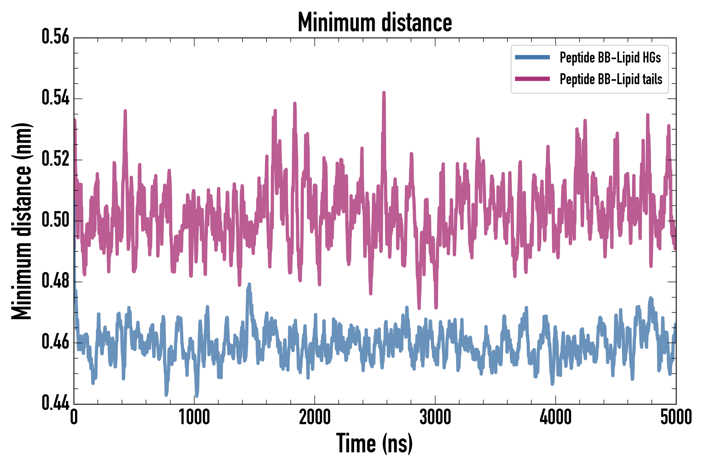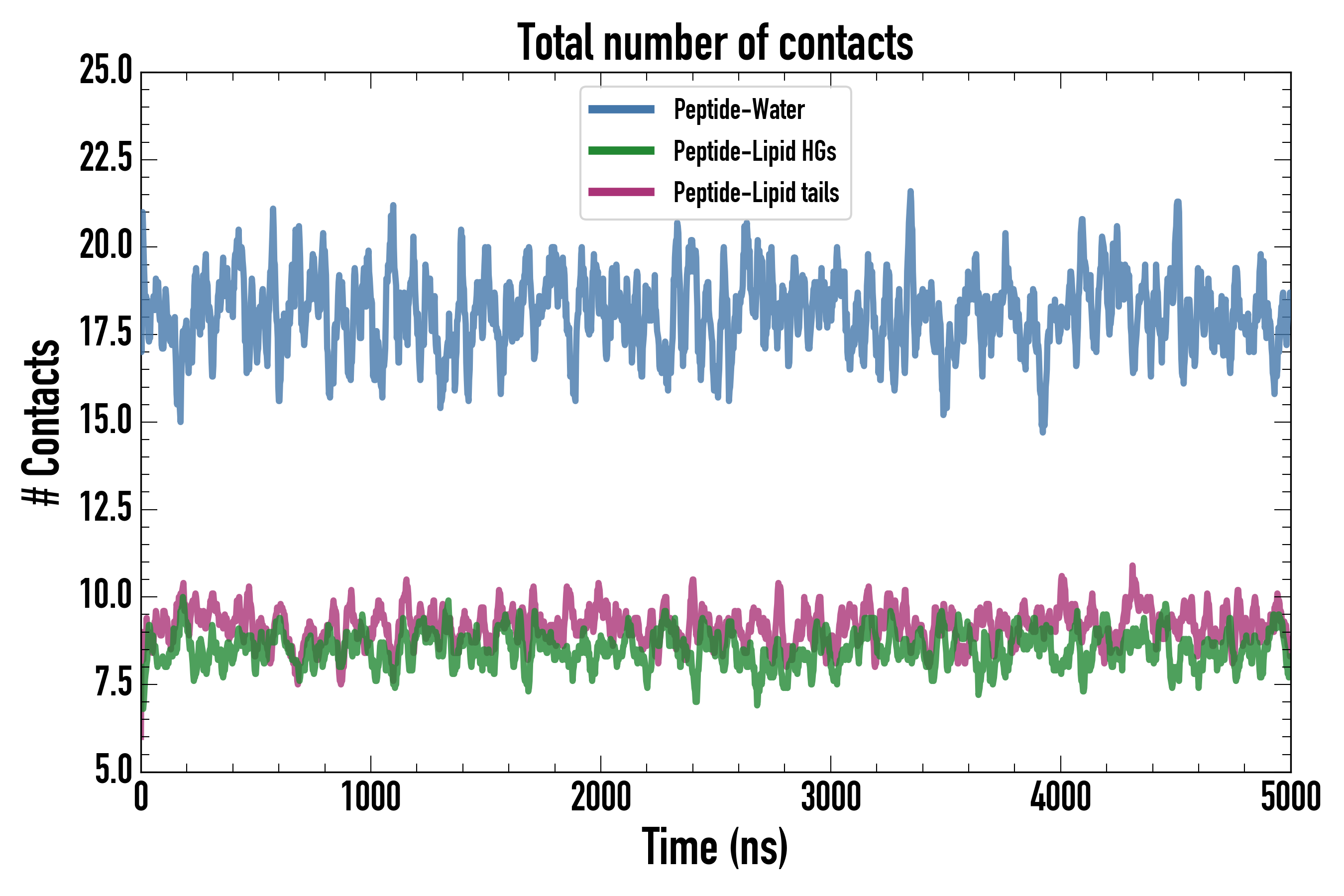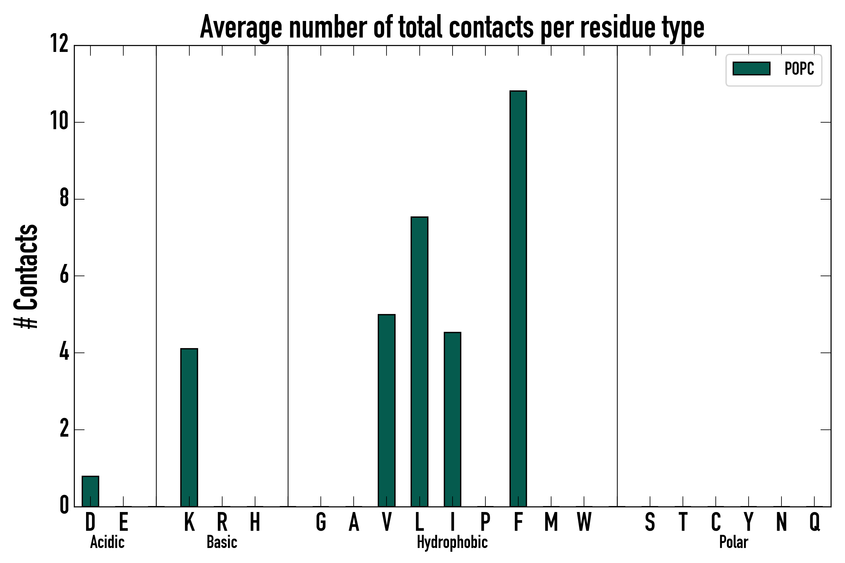 Number of contacts between each residue of the peptide backbone and the different lipid types, averaged over the last microsecond and using a cut-off of 0.6 nm.
