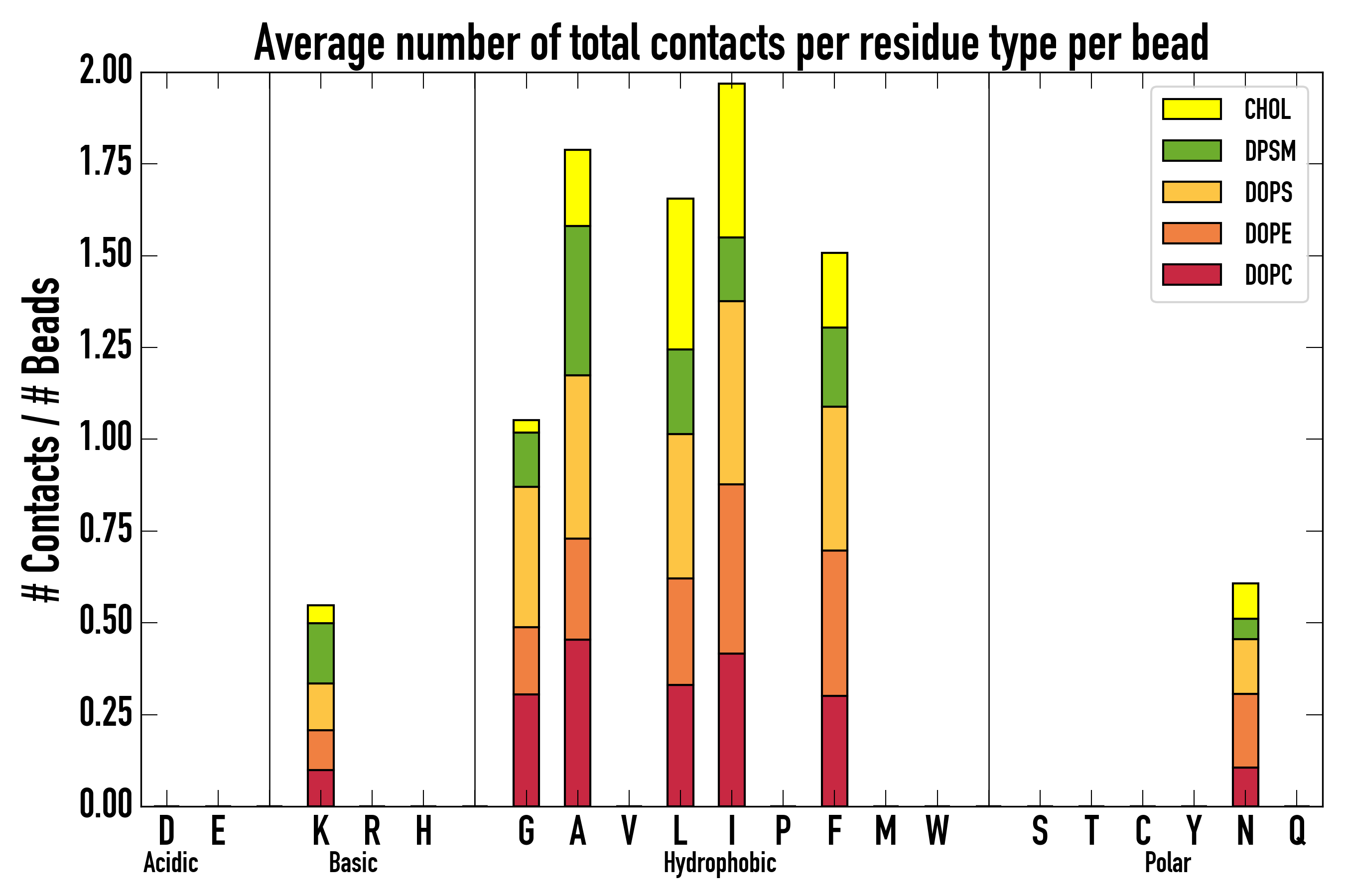 Number of contacts between each residue of the peptide backbone and the different lipid types, averaged over the last microsecond and using a cut-off of 0.6 nm.