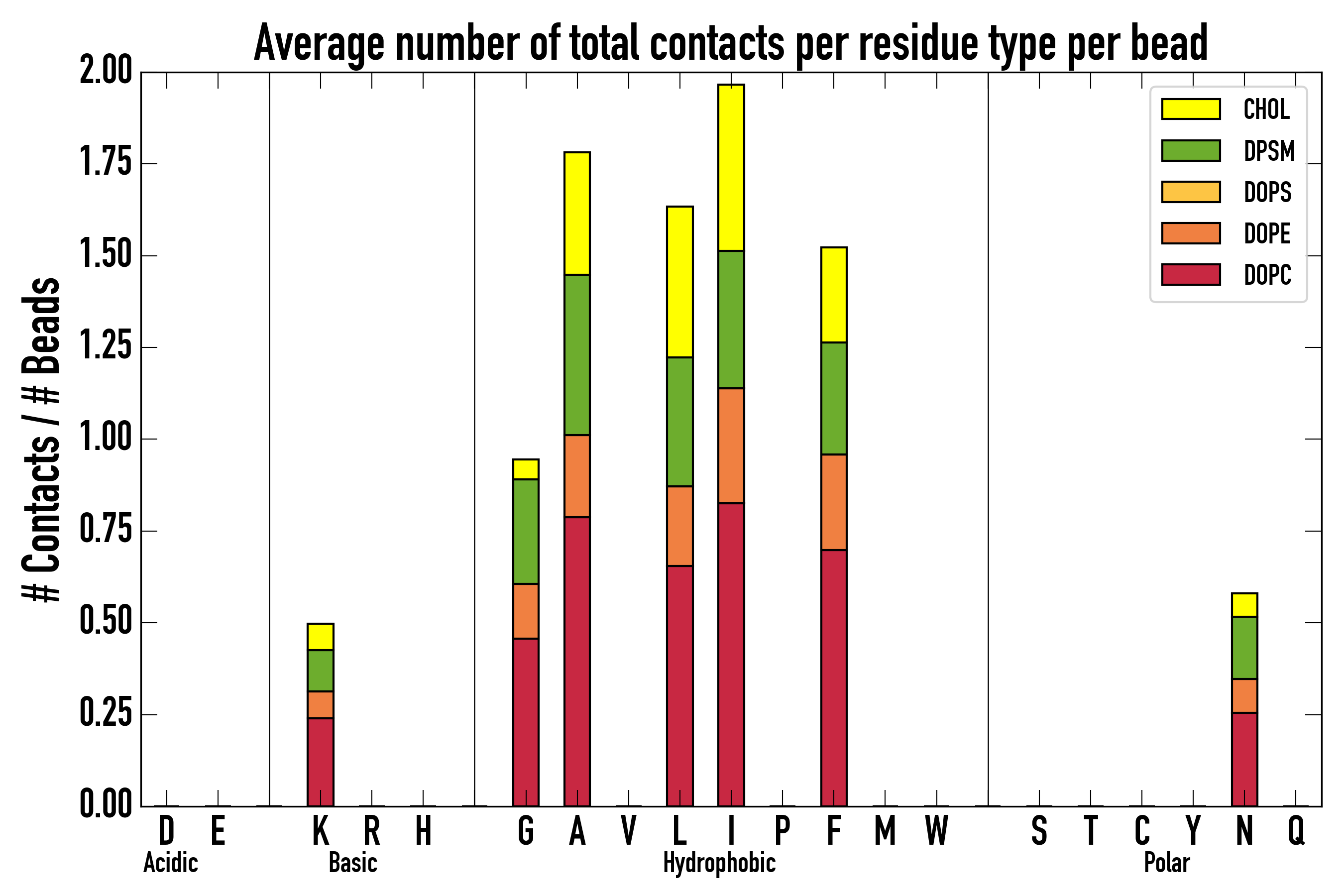 Number of contacts between each residue of the peptide backbone and the different lipid types, averaged over the last microsecond and using a cut-off of 0.6 nm.