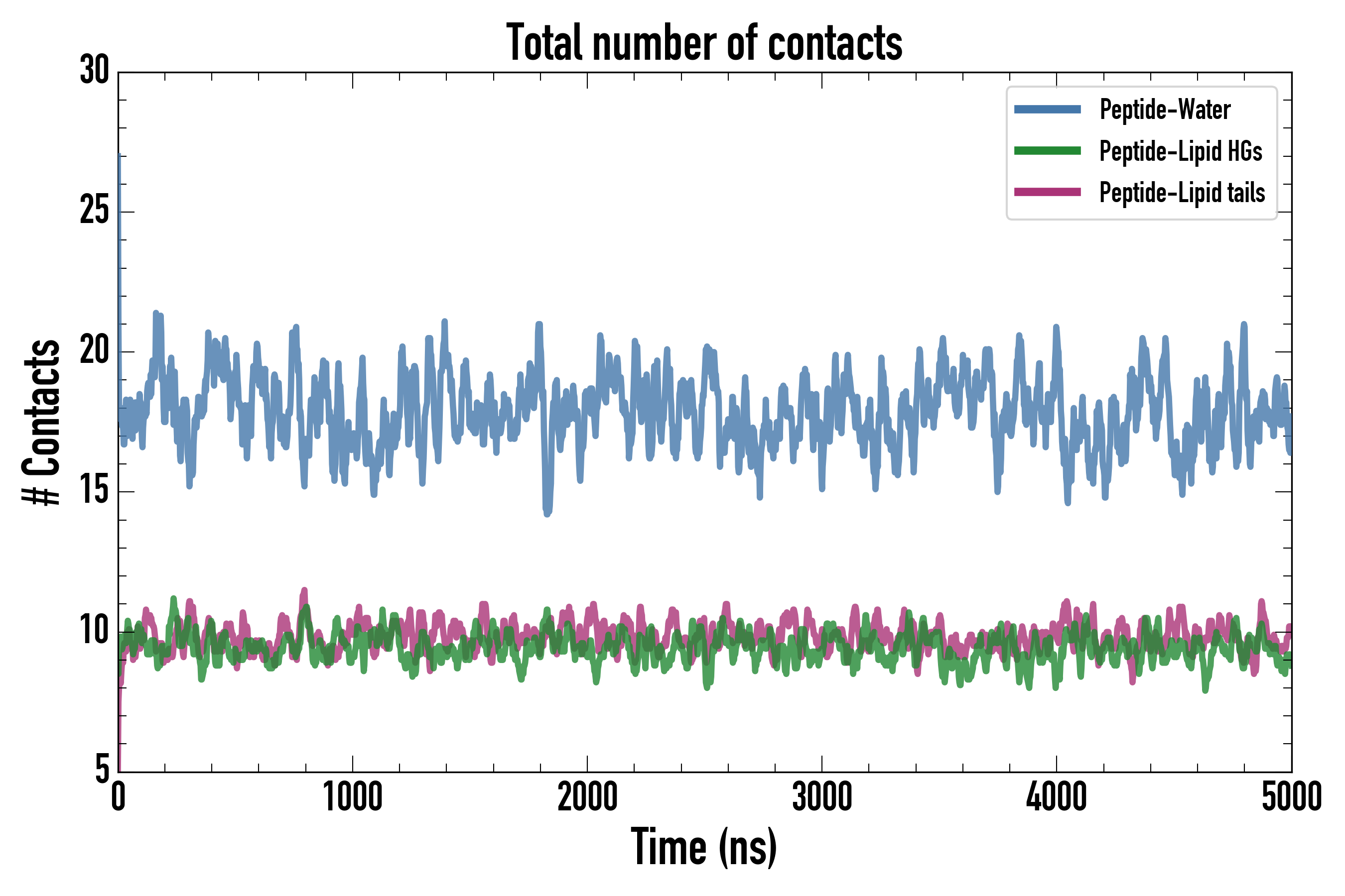 Number of contacts between each residue of the peptide backbone and the different lipid types, averaged over the last microsecond and using a cut-off of 0.6 nm.