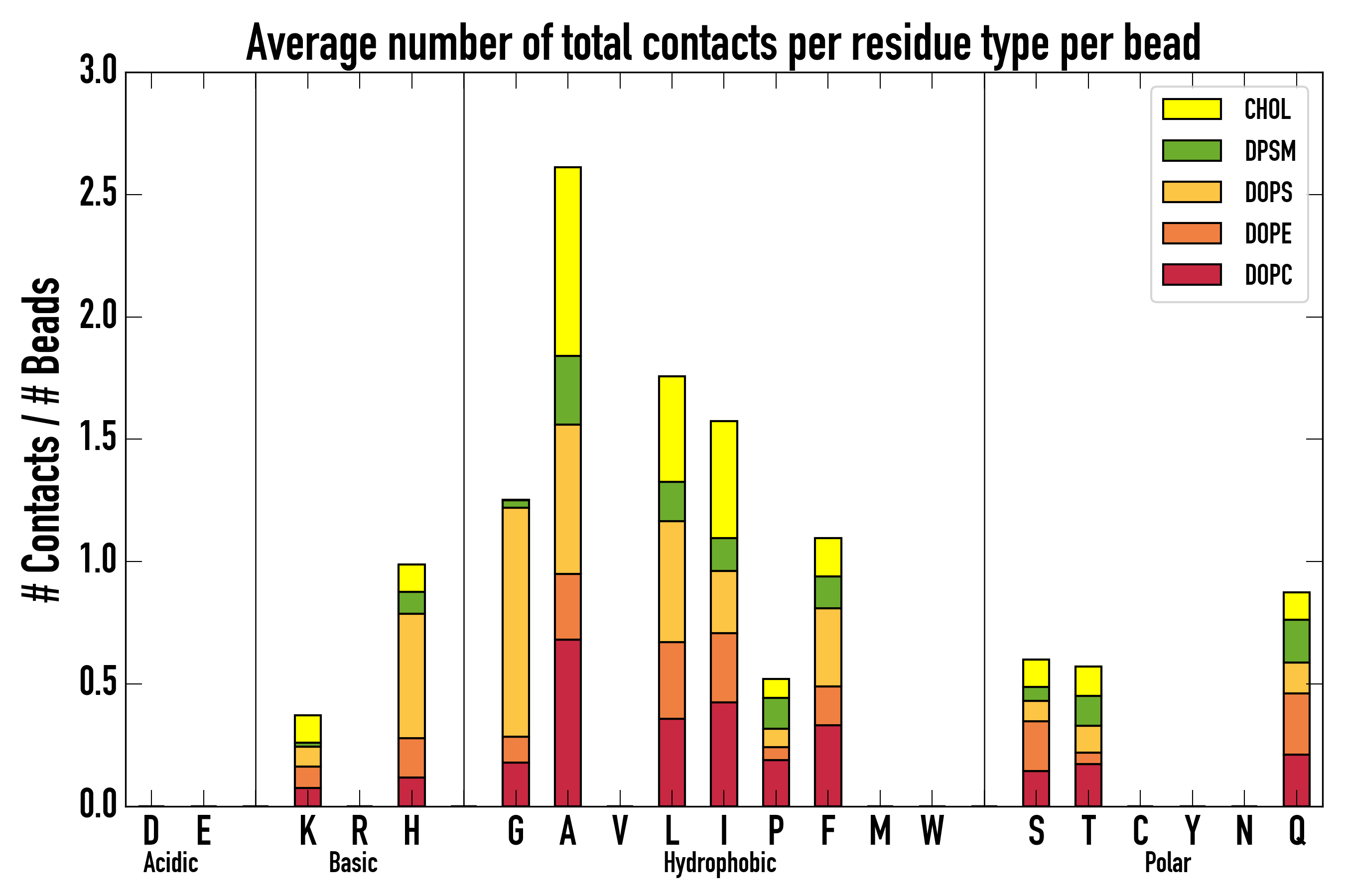 Number of contacts between each residue of the peptide backbone and the different lipid types, averaged over the last microsecond and using a cut-off of 0.6 nm.