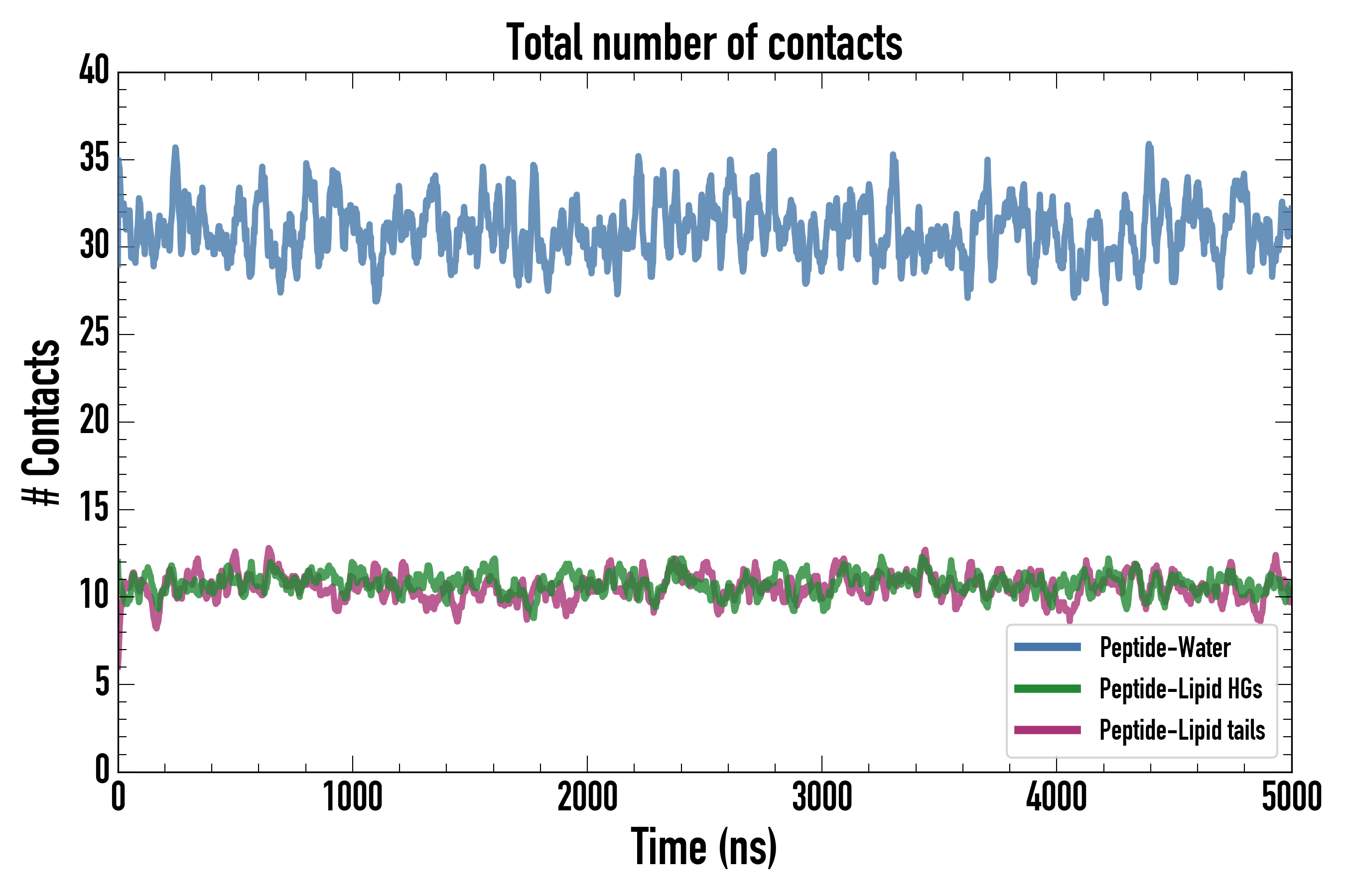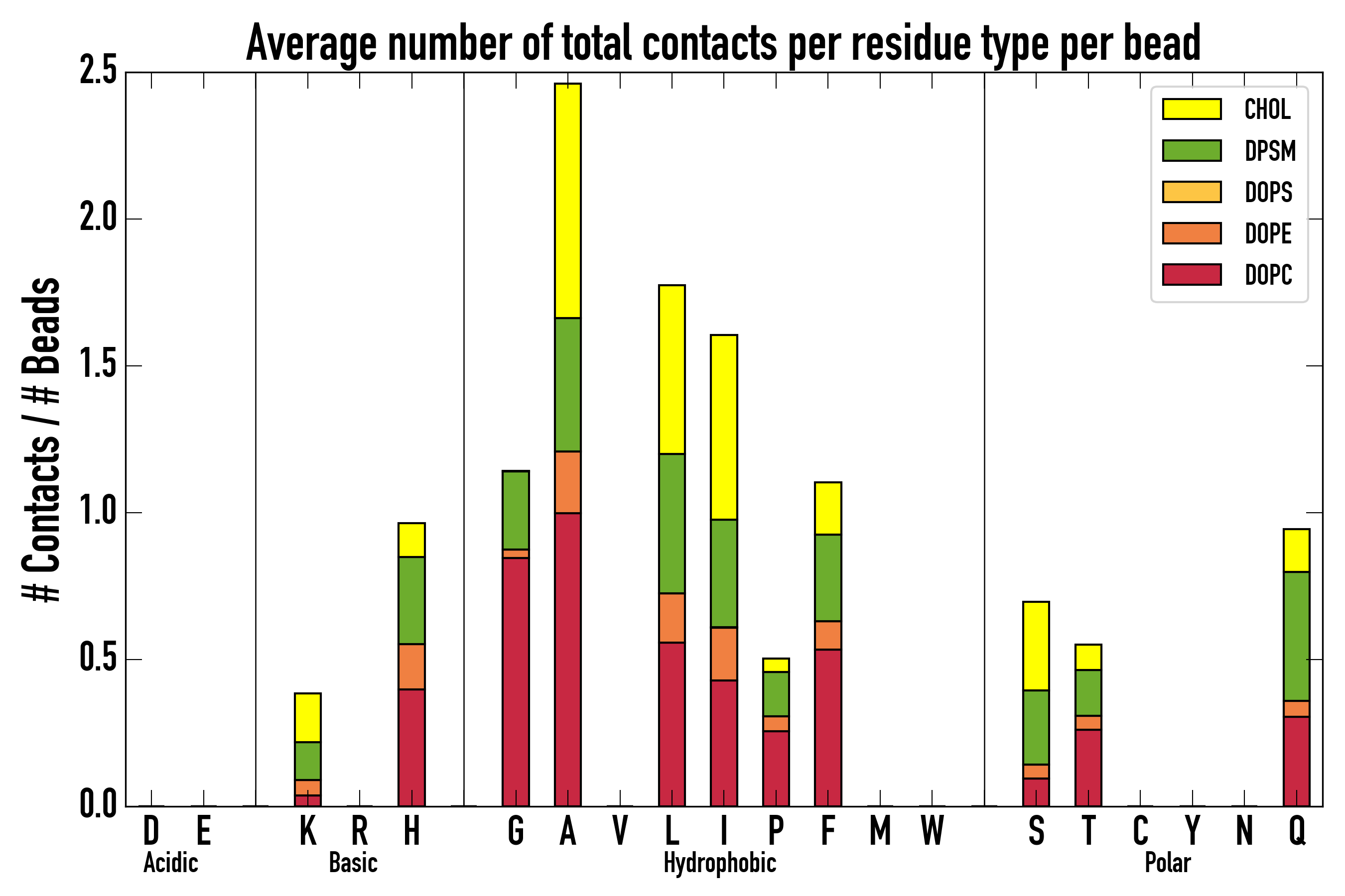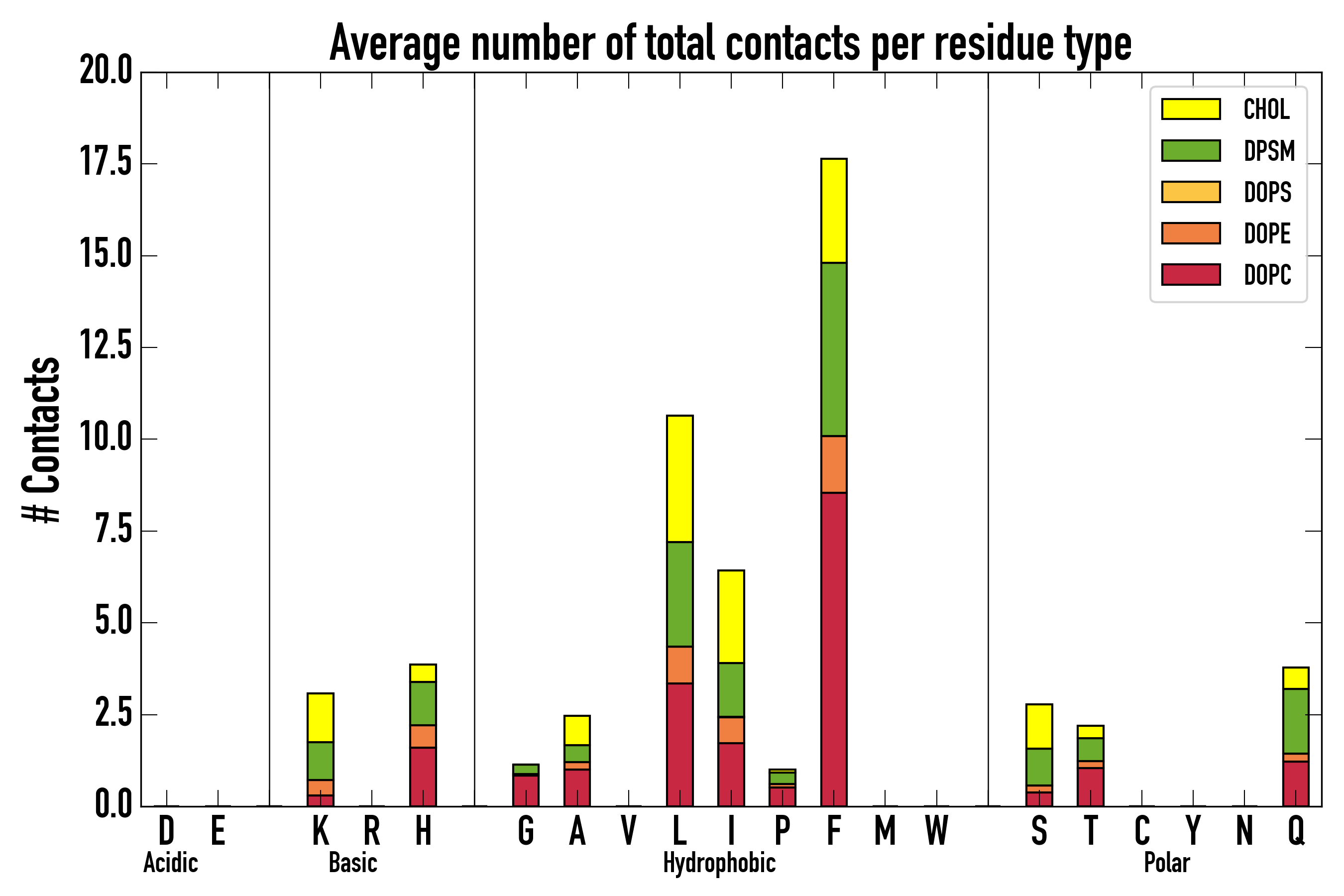 Number of contacts between each residue of the peptide backbone and the different lipid types, averaged over the last microsecond and using a cut-off of 0.6 nm.