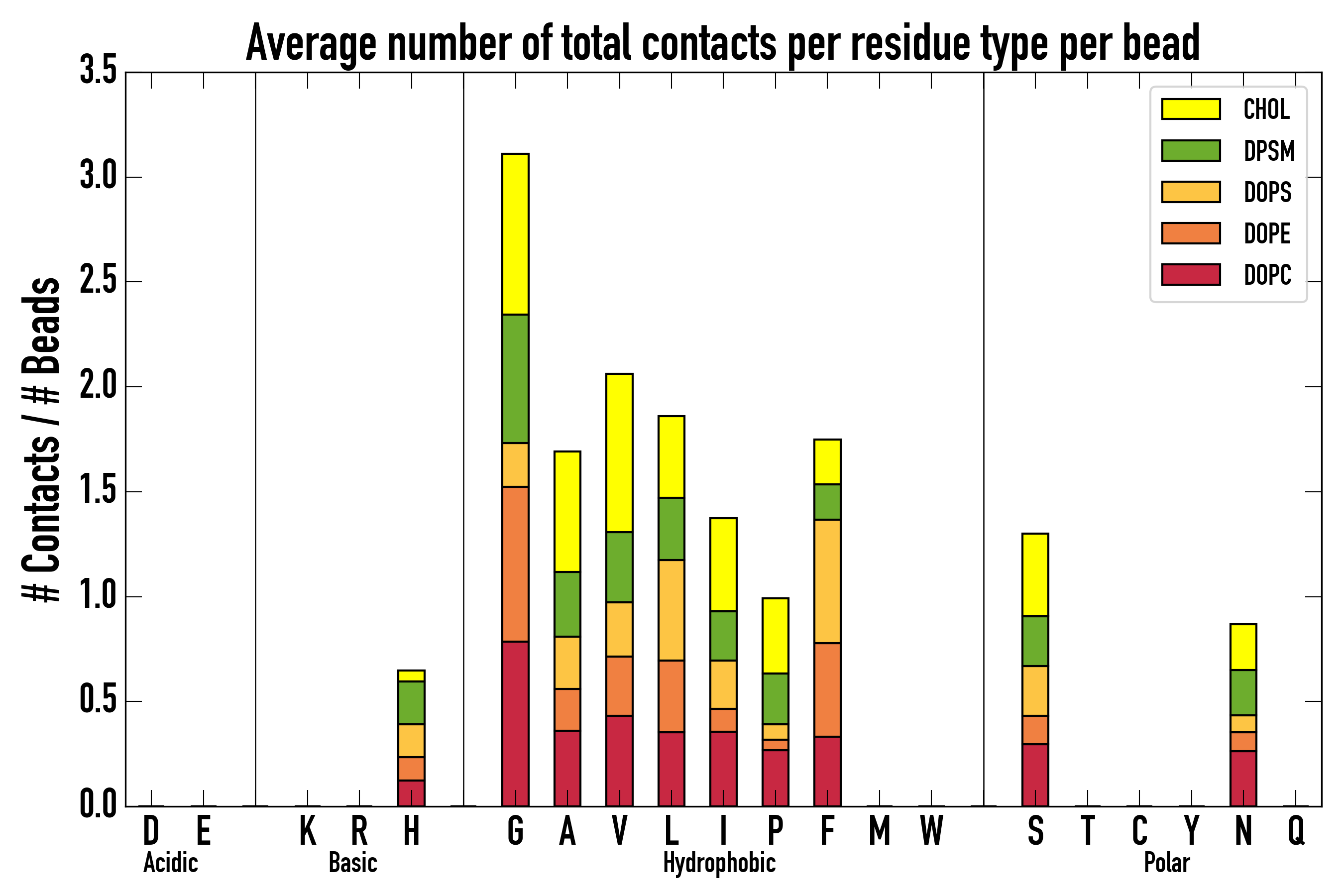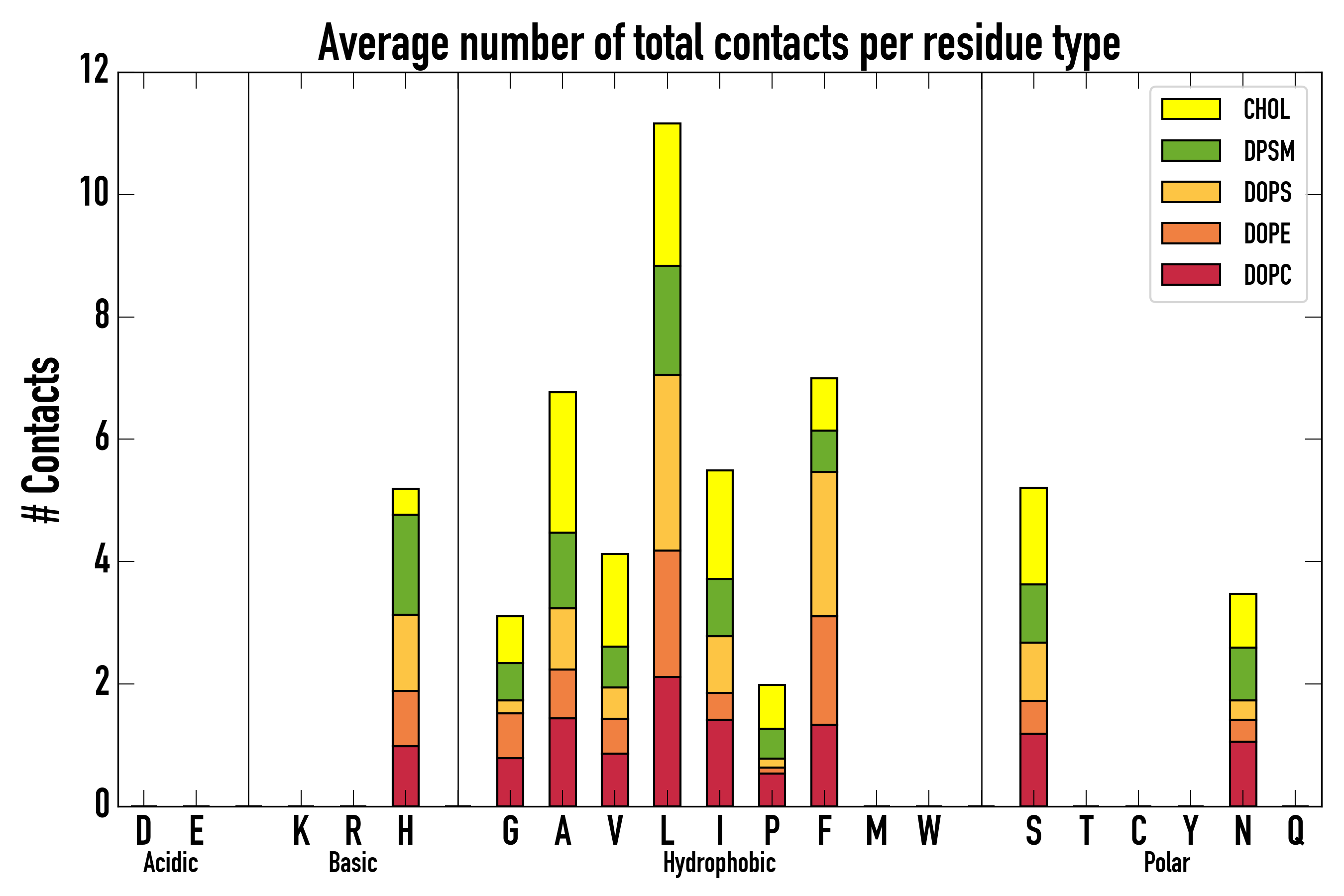 Number of contacts between each residue of the peptide backbone and the different lipid types, averaged over the last microsecond and using a cut-off of 0.6 nm.