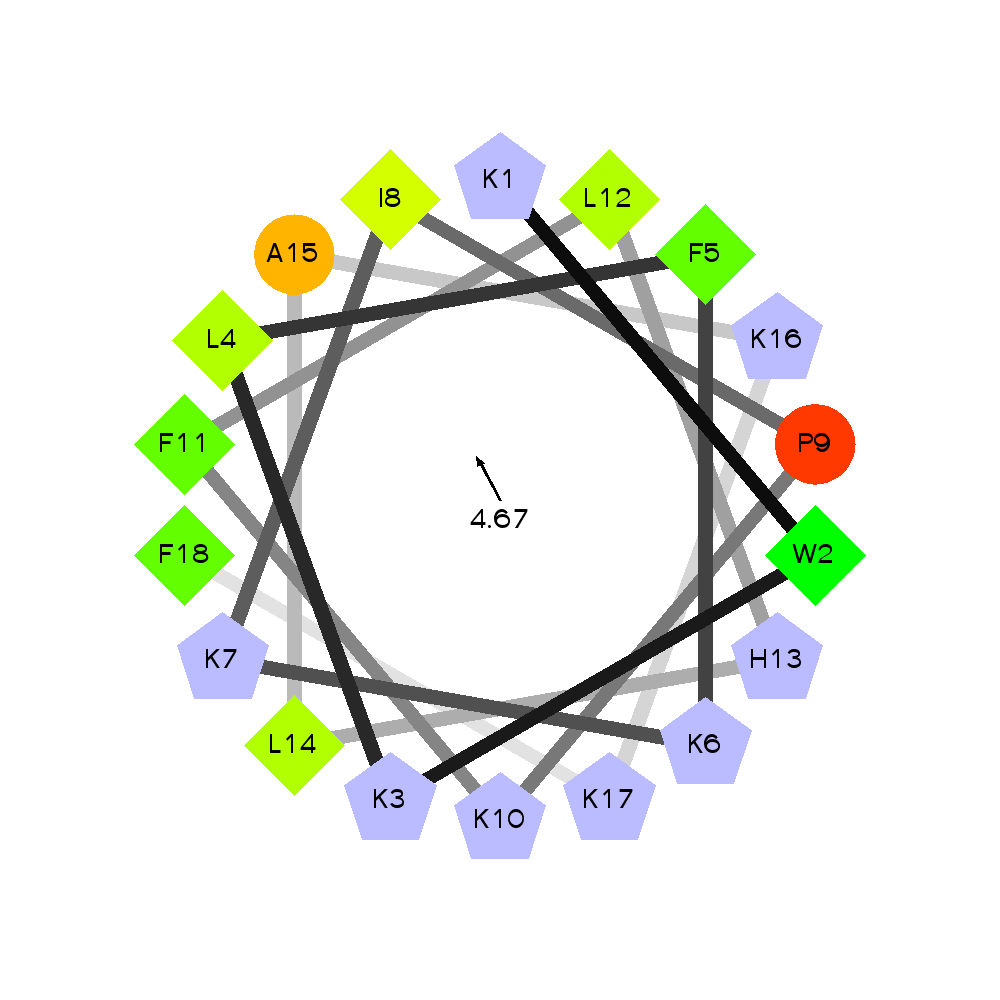 By amino acid: Basic: 8 Acidic: 0 Hydrophobic: 10 Polar: 0 Electrostatic Dipolar Moment (e nm): 5.11