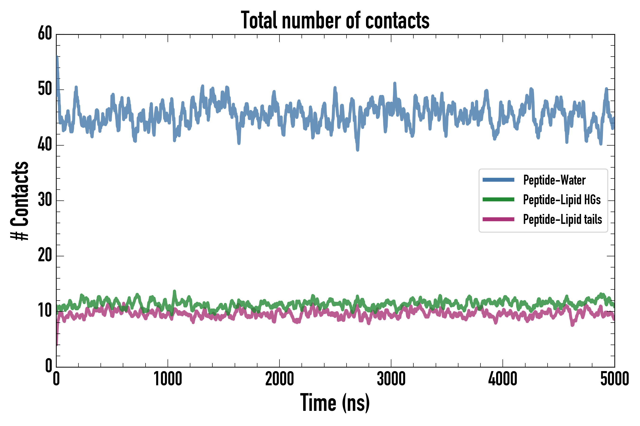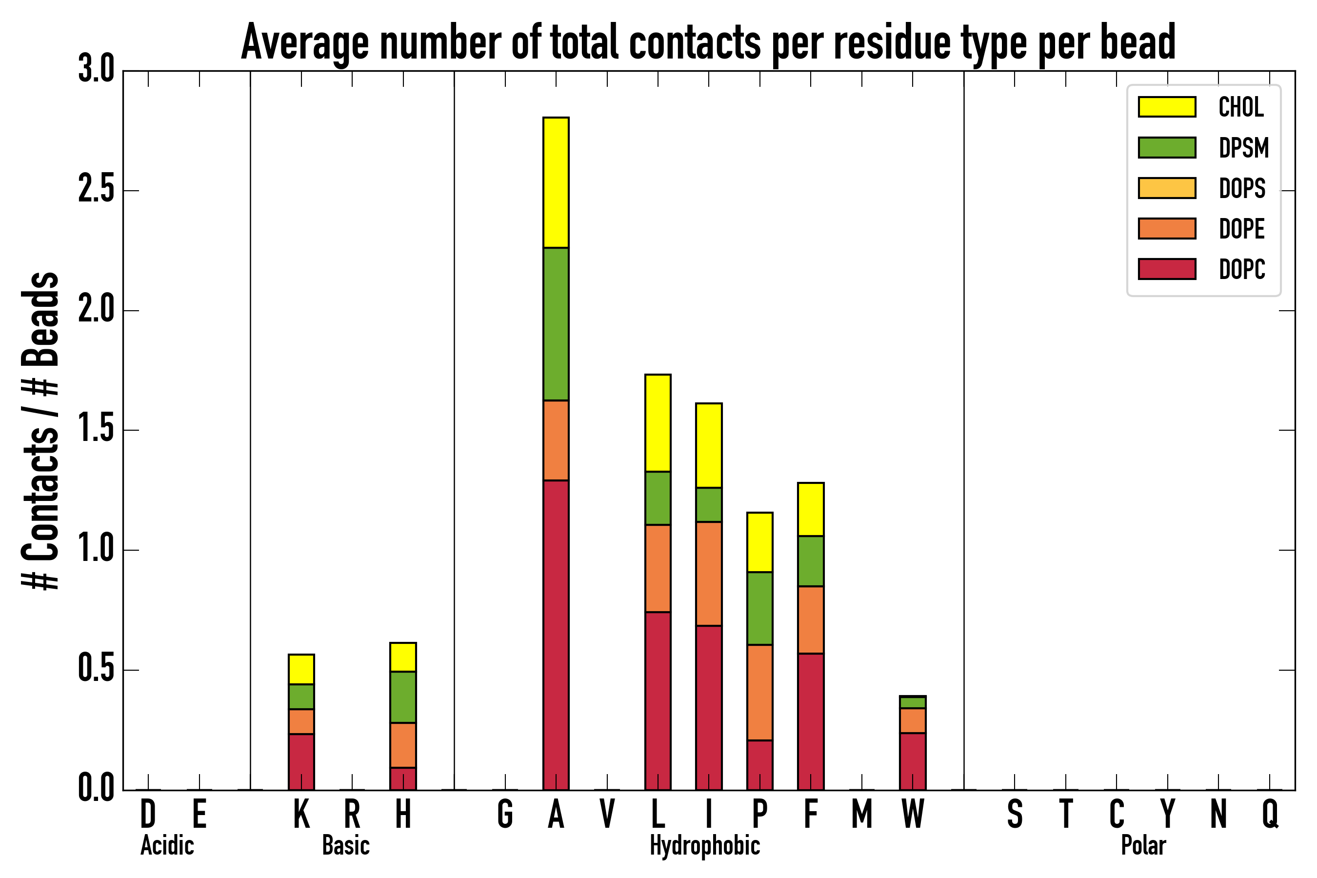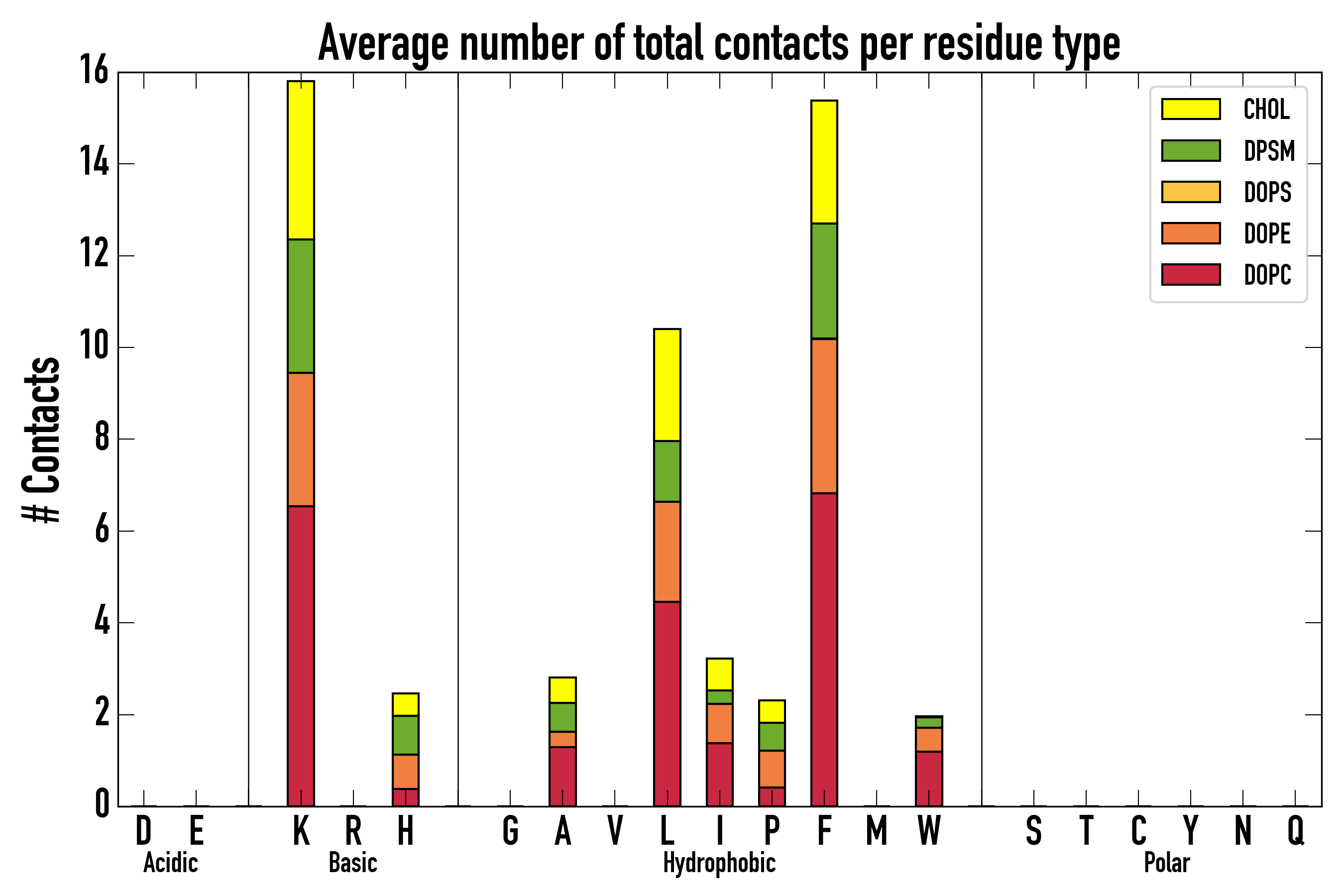 Number of contacts between each residue of the peptide backbone and the different lipid types, averaged over the last microsecond and using a cut-off of 0.6 nm.