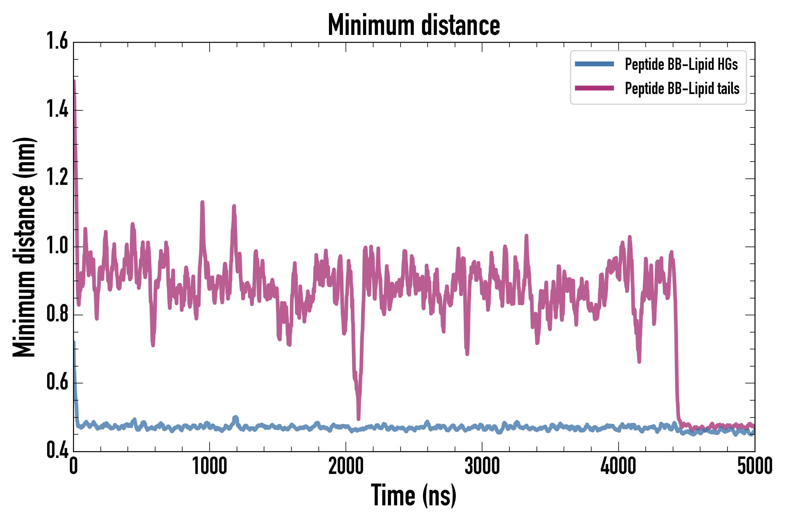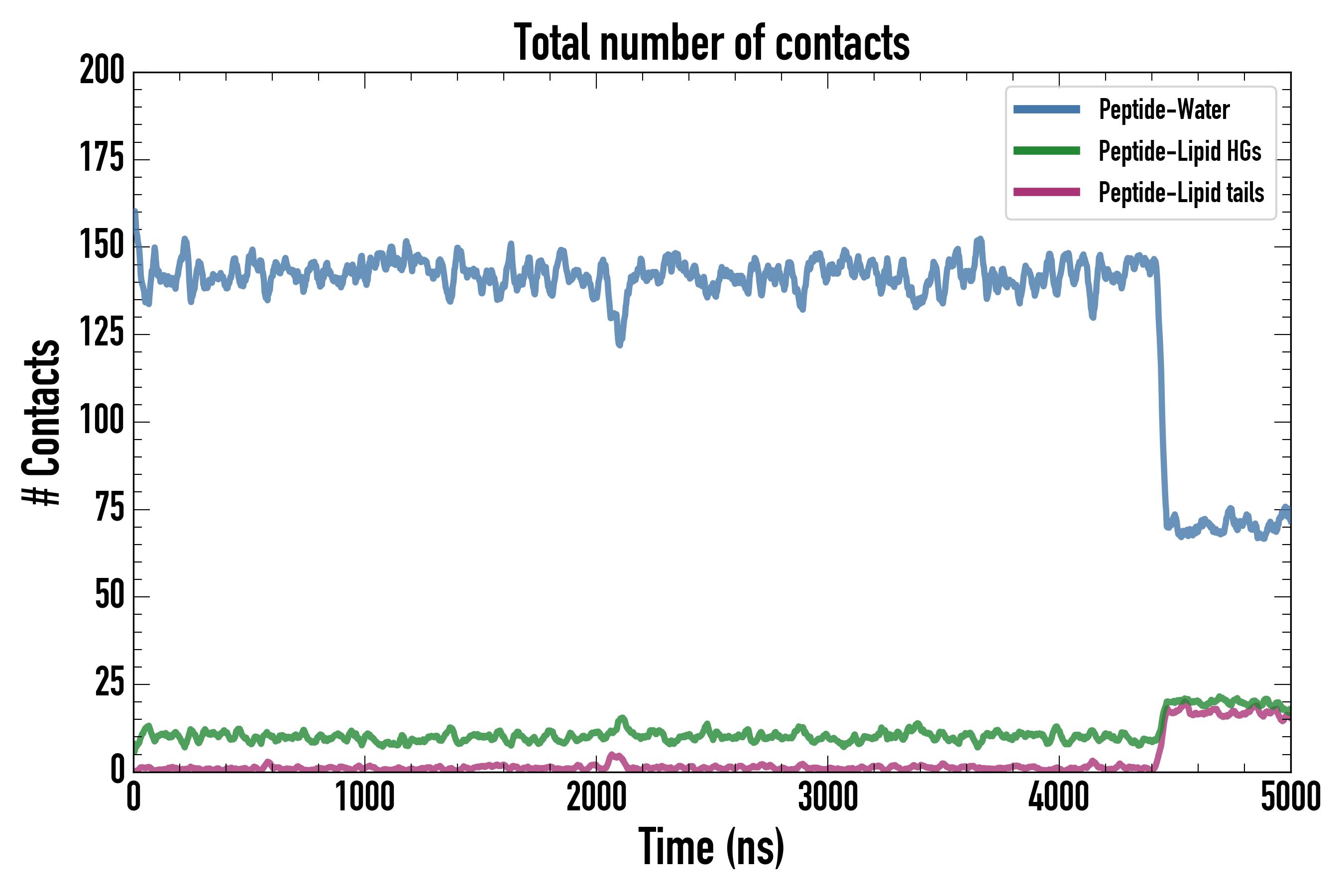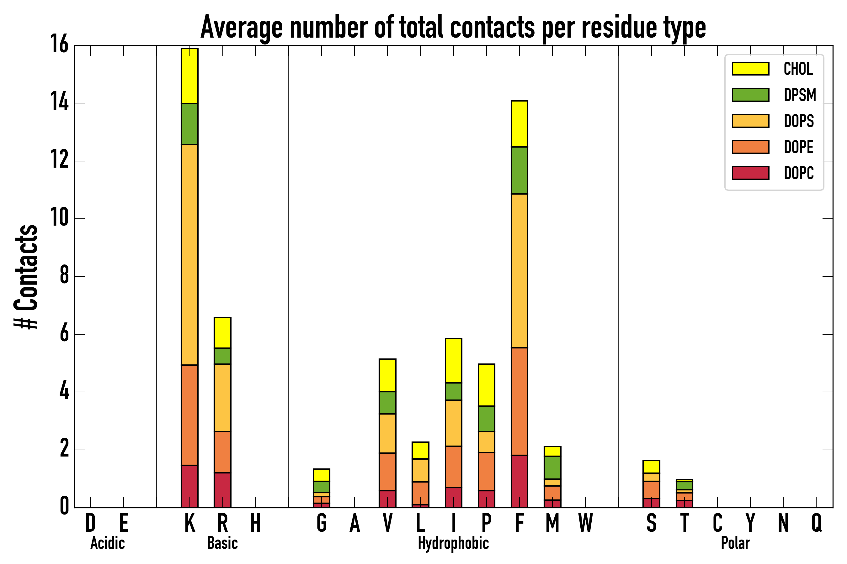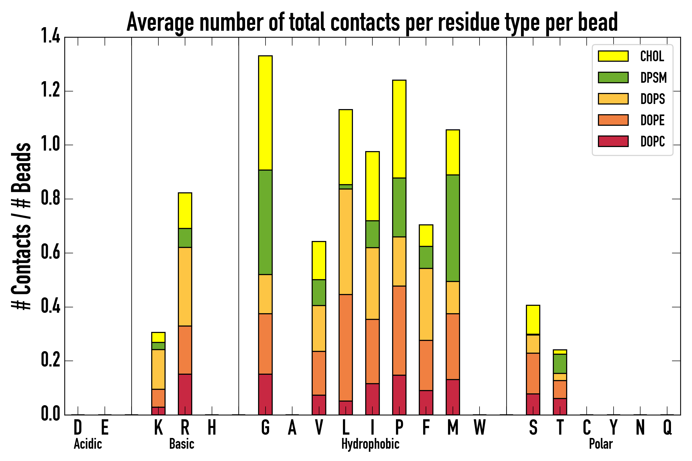 Number of contacts between each residue of the peptide backbone and the different lipid types, averaged over the last microsecond and using a cut-off of 0.6 nm.