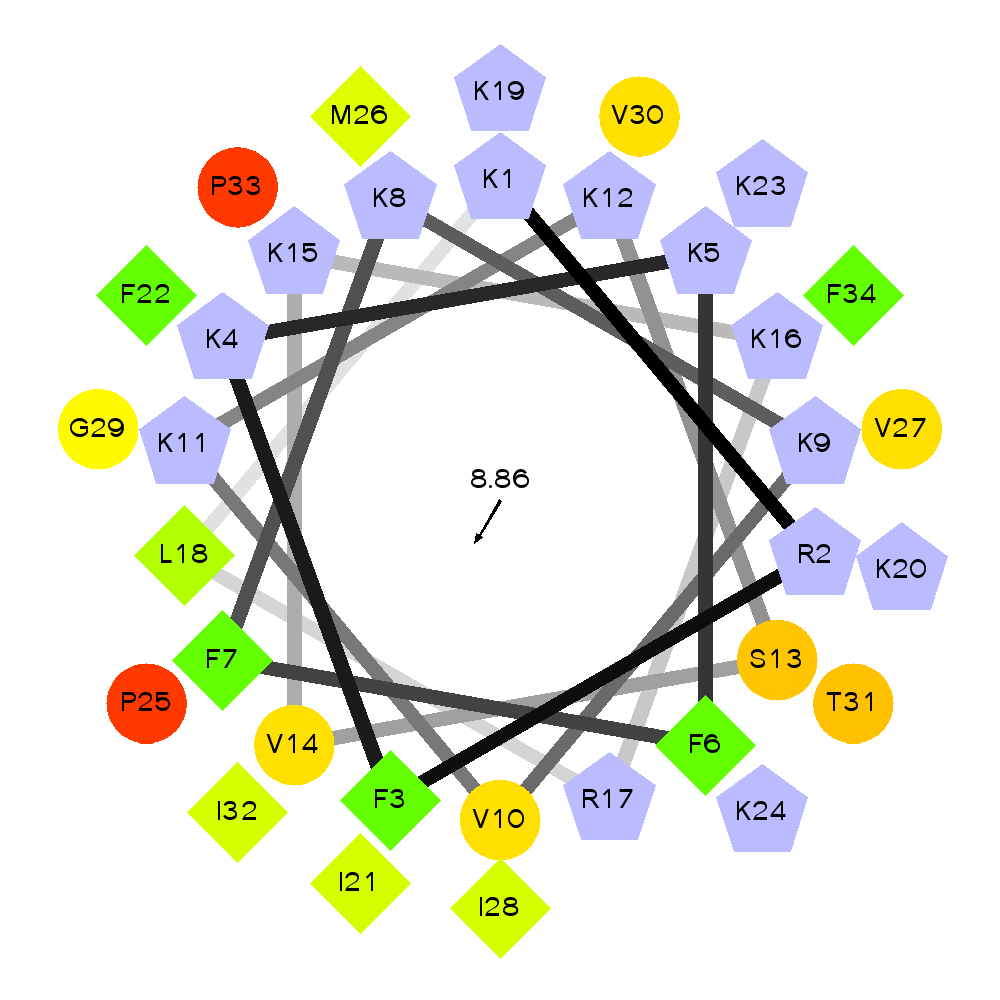 By amino acid: Basic: 15 Acidic: 0 Hydrophobic: 17 Polar: 2 Electrostatic Dipolar Moment (e nm): 17.4
