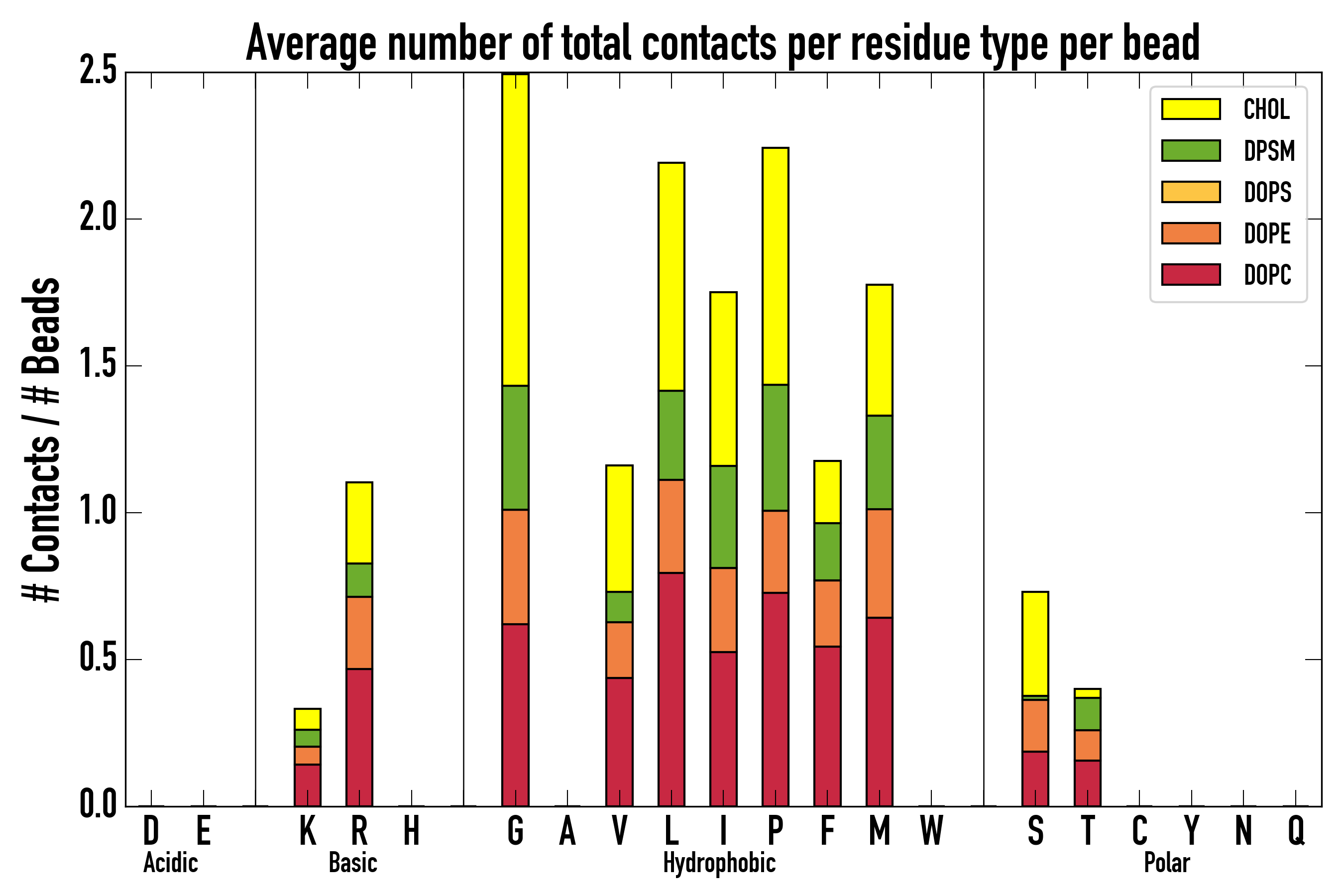 Number of contacts between each residue of the peptide backbone and the different lipid types, averaged over the last microsecond and using a cut-off of 0.6 nm.