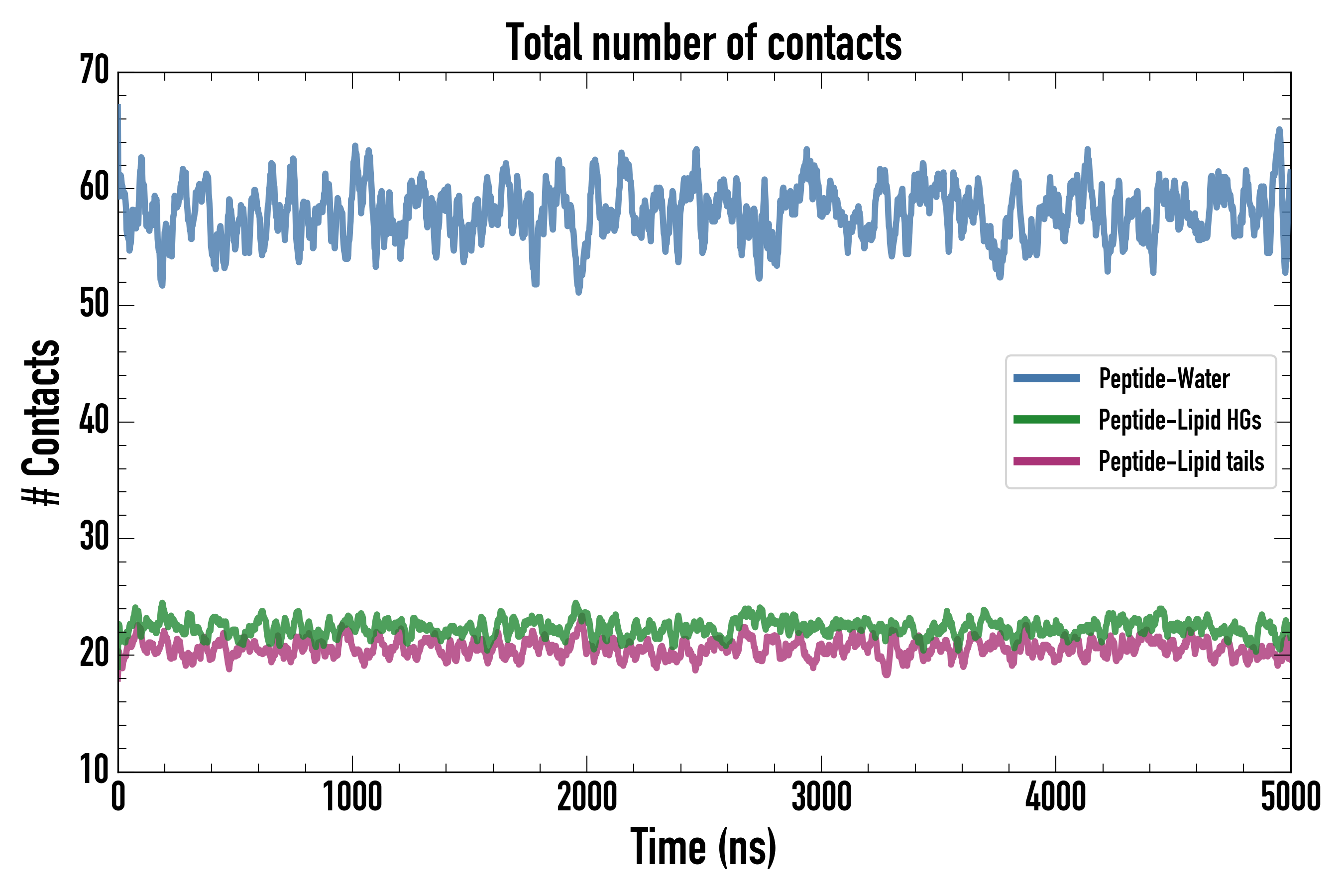 Number of contacts between each residue of the peptide backbone and the different lipid types, averaged over the last microsecond and using a cut-off of 0.6 nm.