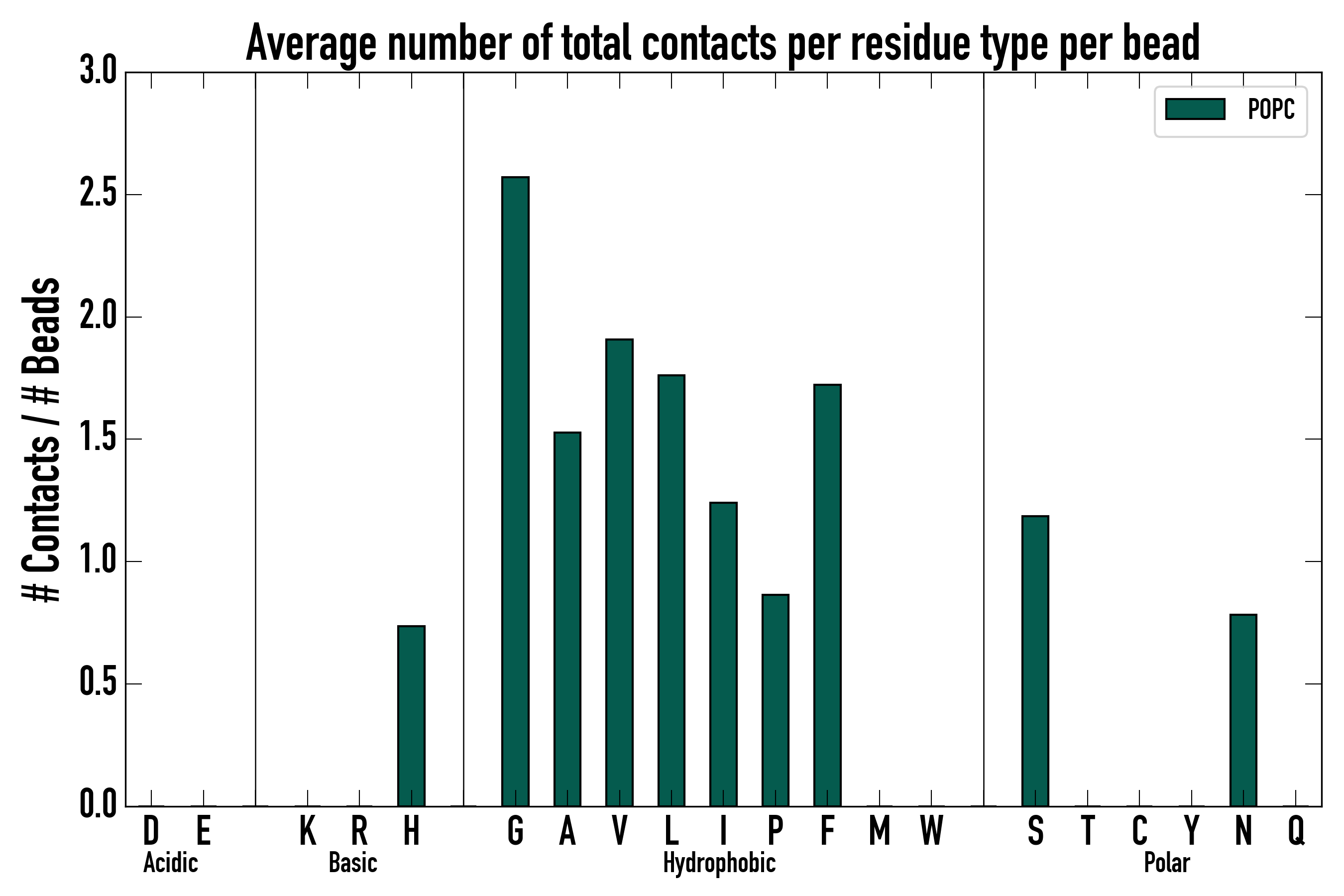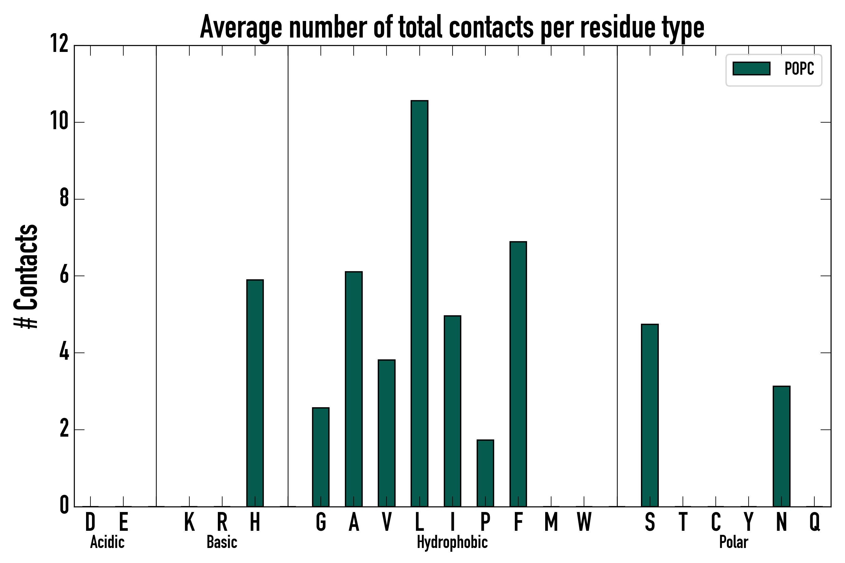Number of contacts between each residue of the peptide backbone and the different lipid types, averaged over the last microsecond and using a cut-off of 0.6 nm.