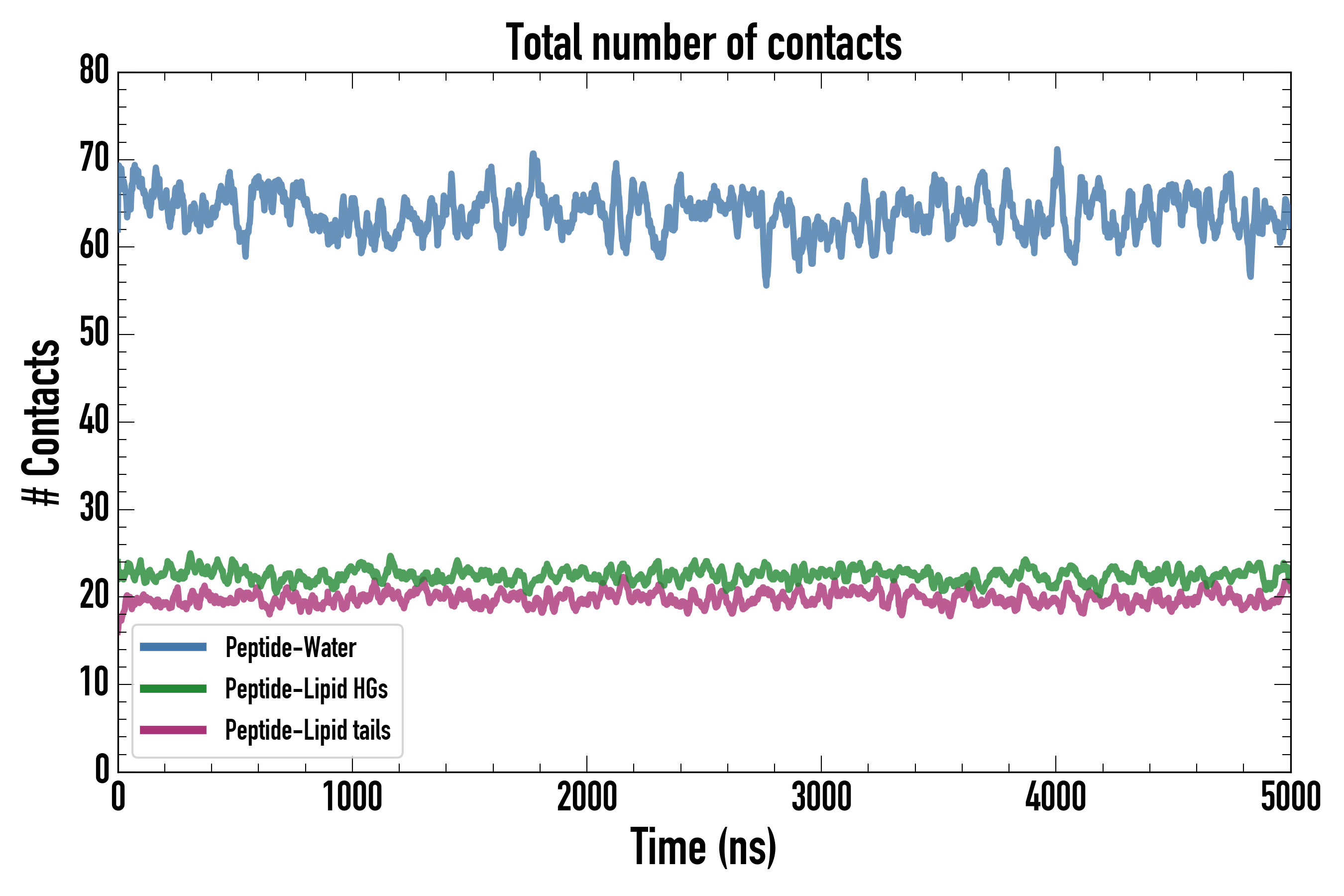 Number of contacts between each residue of the peptide backbone and the different lipid types, averaged over the last microsecond and using a cut-off of 0.6 nm.