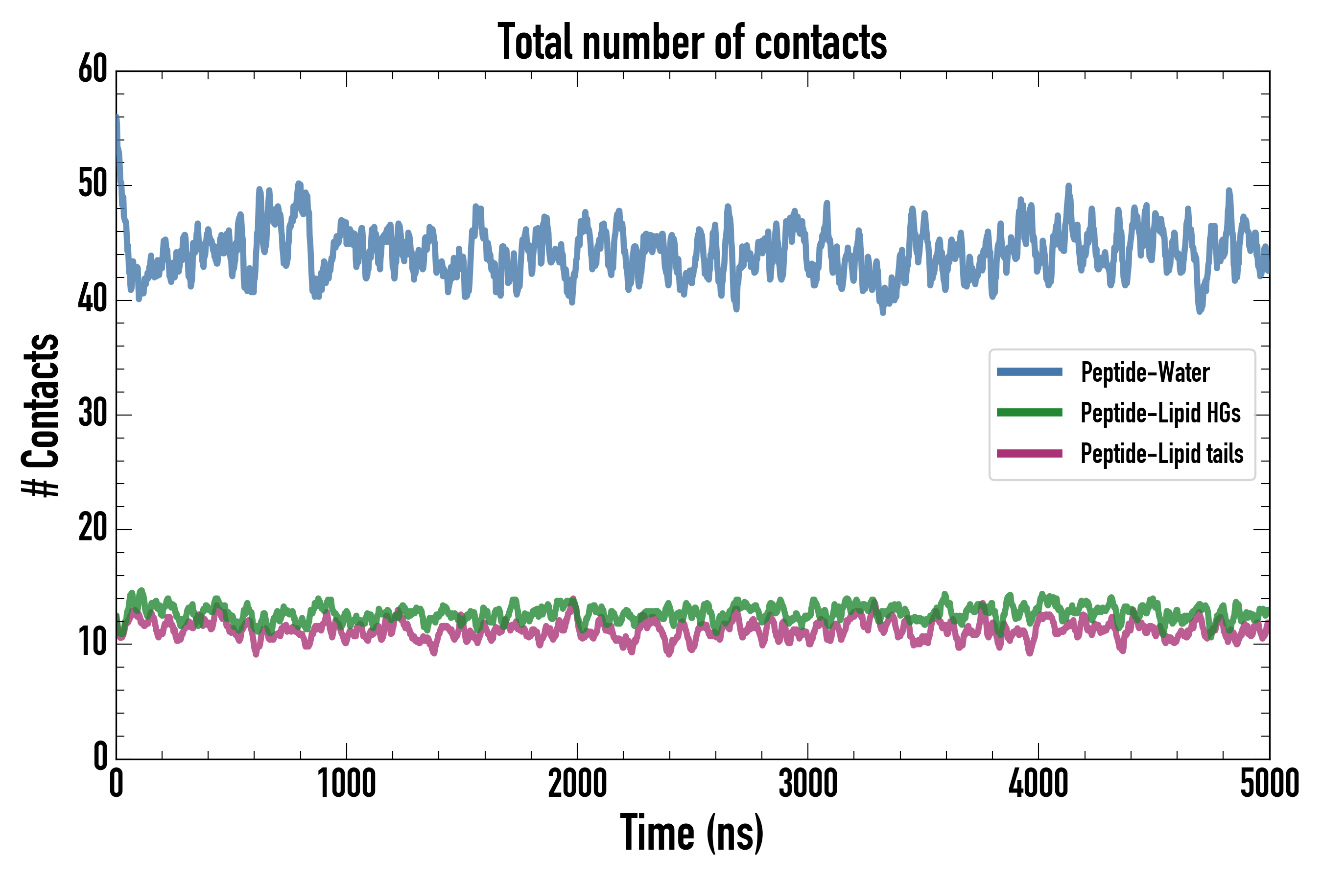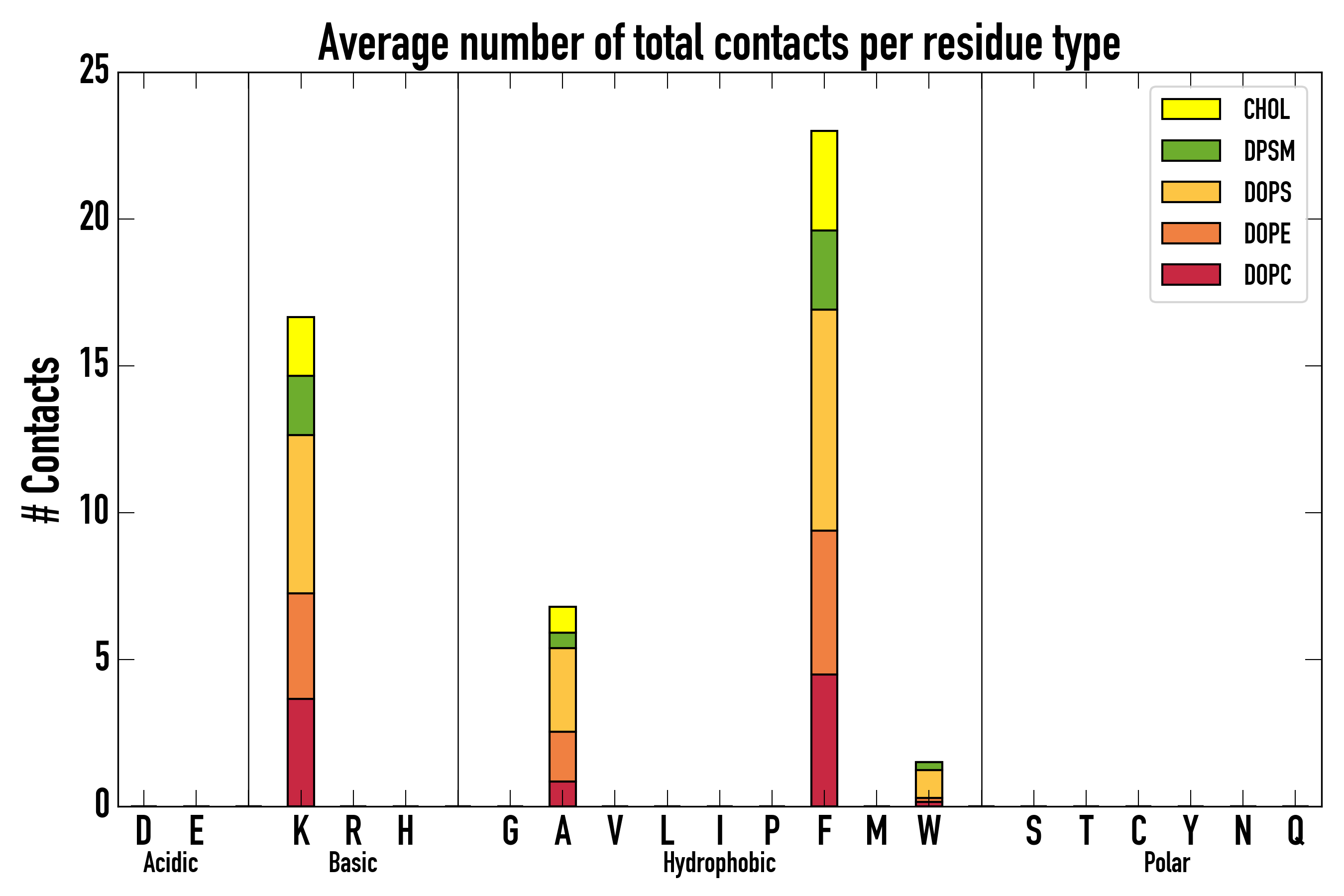 Number of contacts between each residue of the peptide backbone and the different lipid types, averaged over the last microsecond and using a cut-off of 0.6 nm.