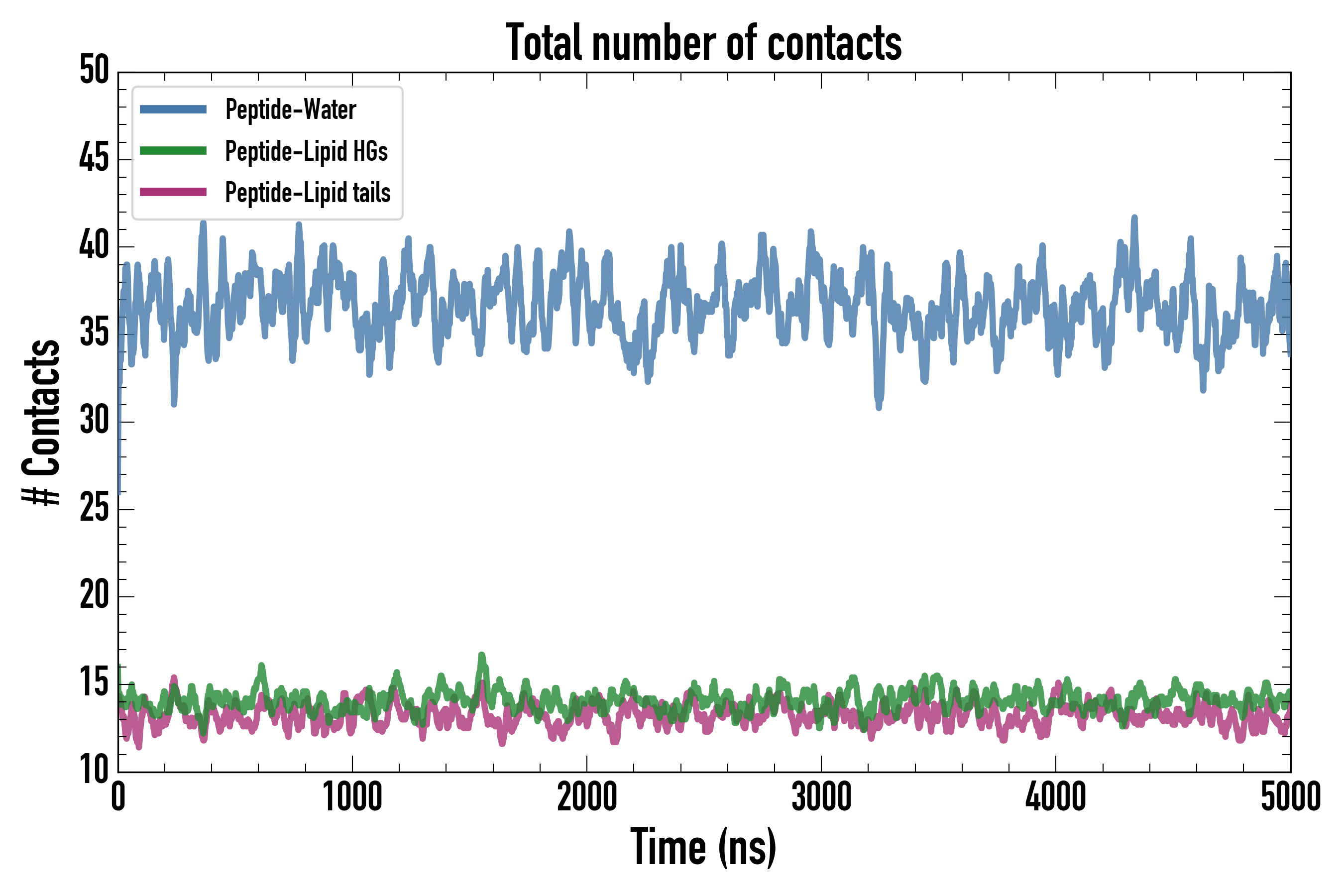 Number of contacts between each residue of the peptide backbone and the different lipid types, averaged over the last microsecond and using a cut-off of 0.6 nm.