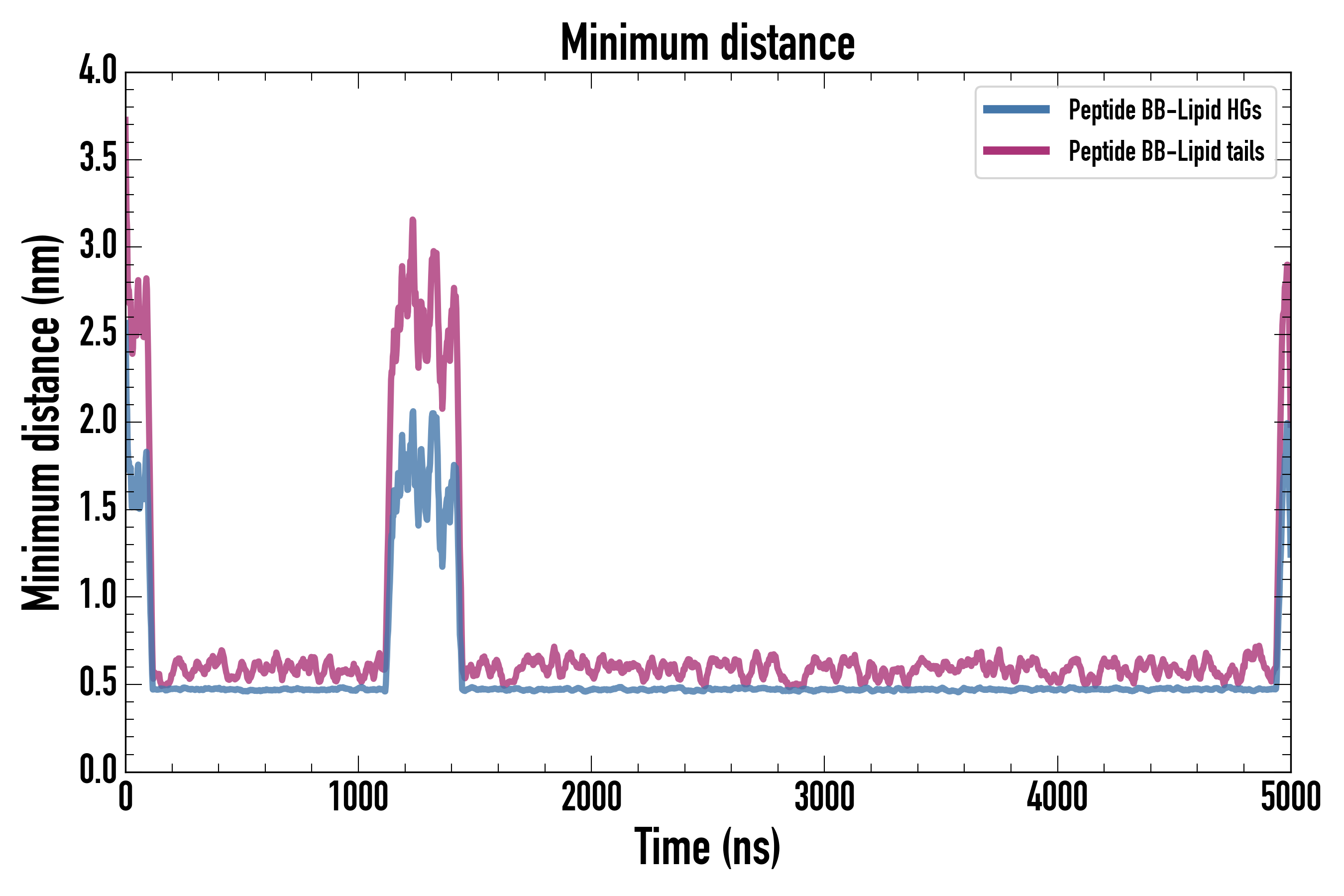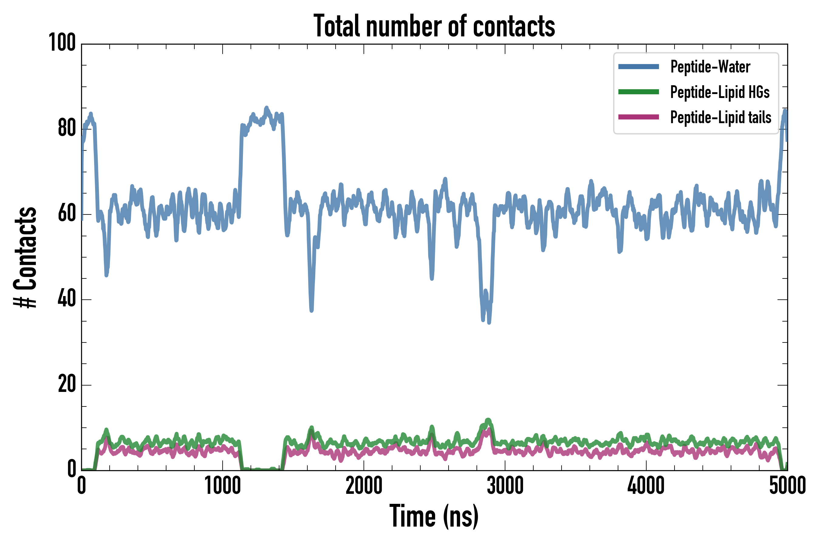 Number of contacts between each residue of the peptide backbone and the different lipid types, averaged over the last microsecond and using a cut-off of 0.6 nm.