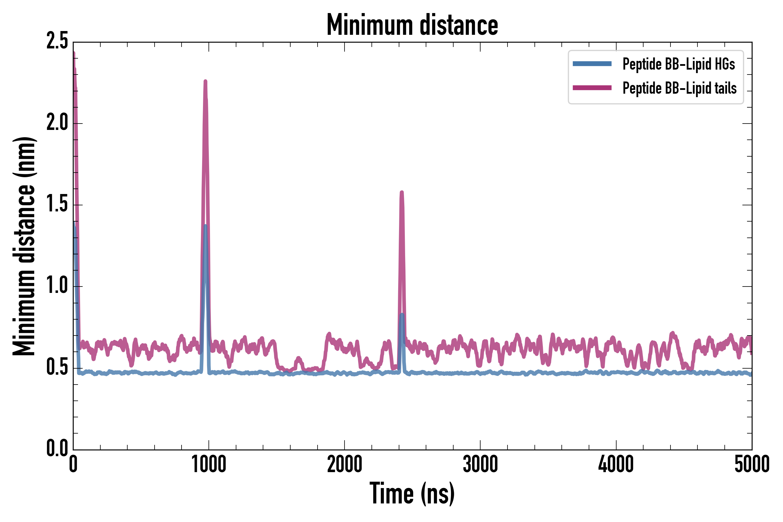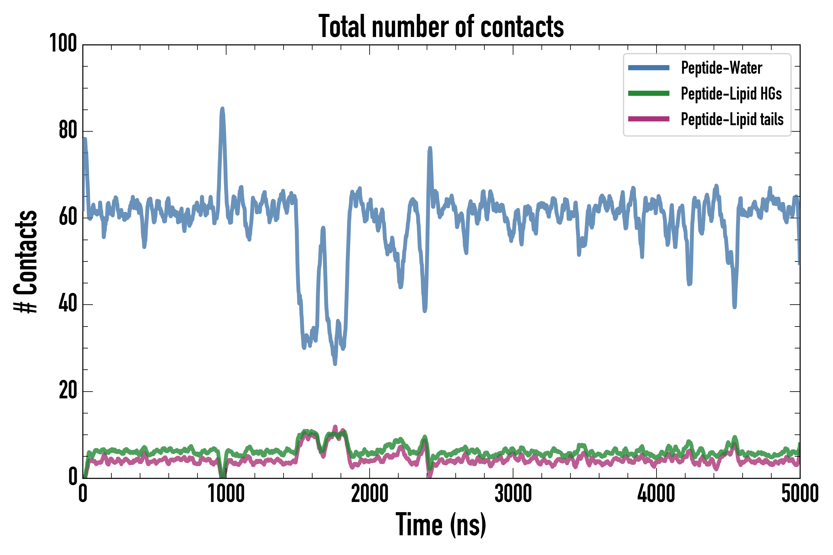 Number of contacts between each residue of the peptide backbone and the different lipid types, averaged over the last microsecond and using a cut-off of 0.6 nm.